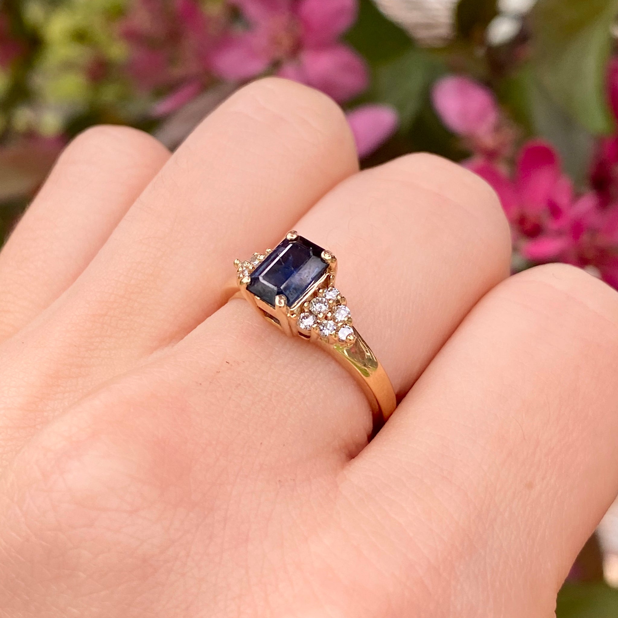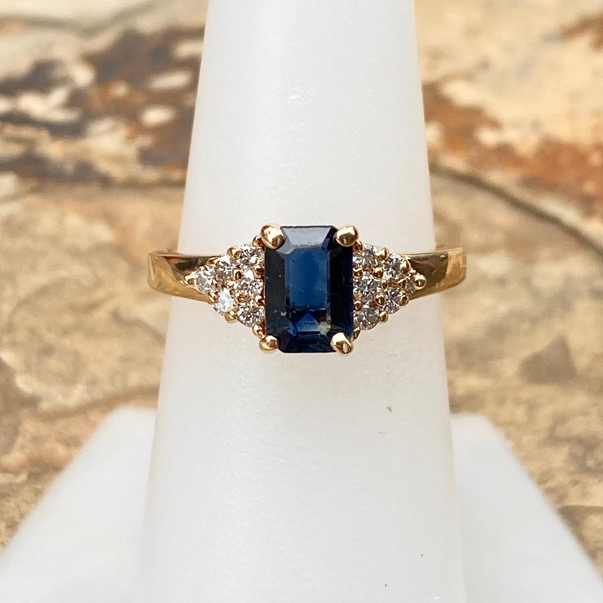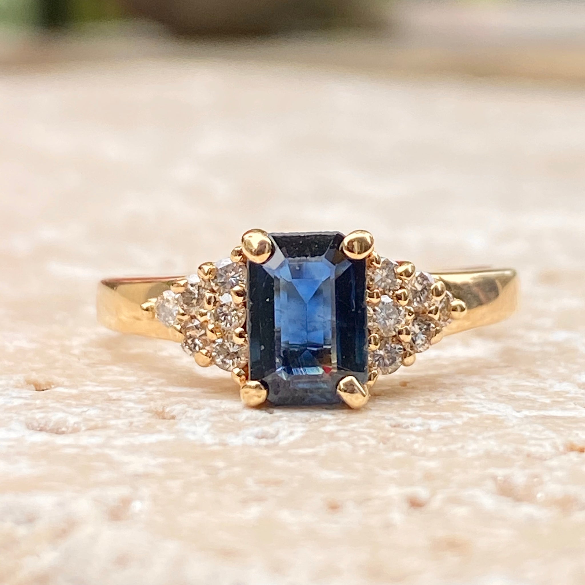 14KT yellow gold emerald-cut blue sapphire + diamond accent ring. Stunning blue color! Sapphire is the birthstone for September babies- and this piece makes a spectacular gift!