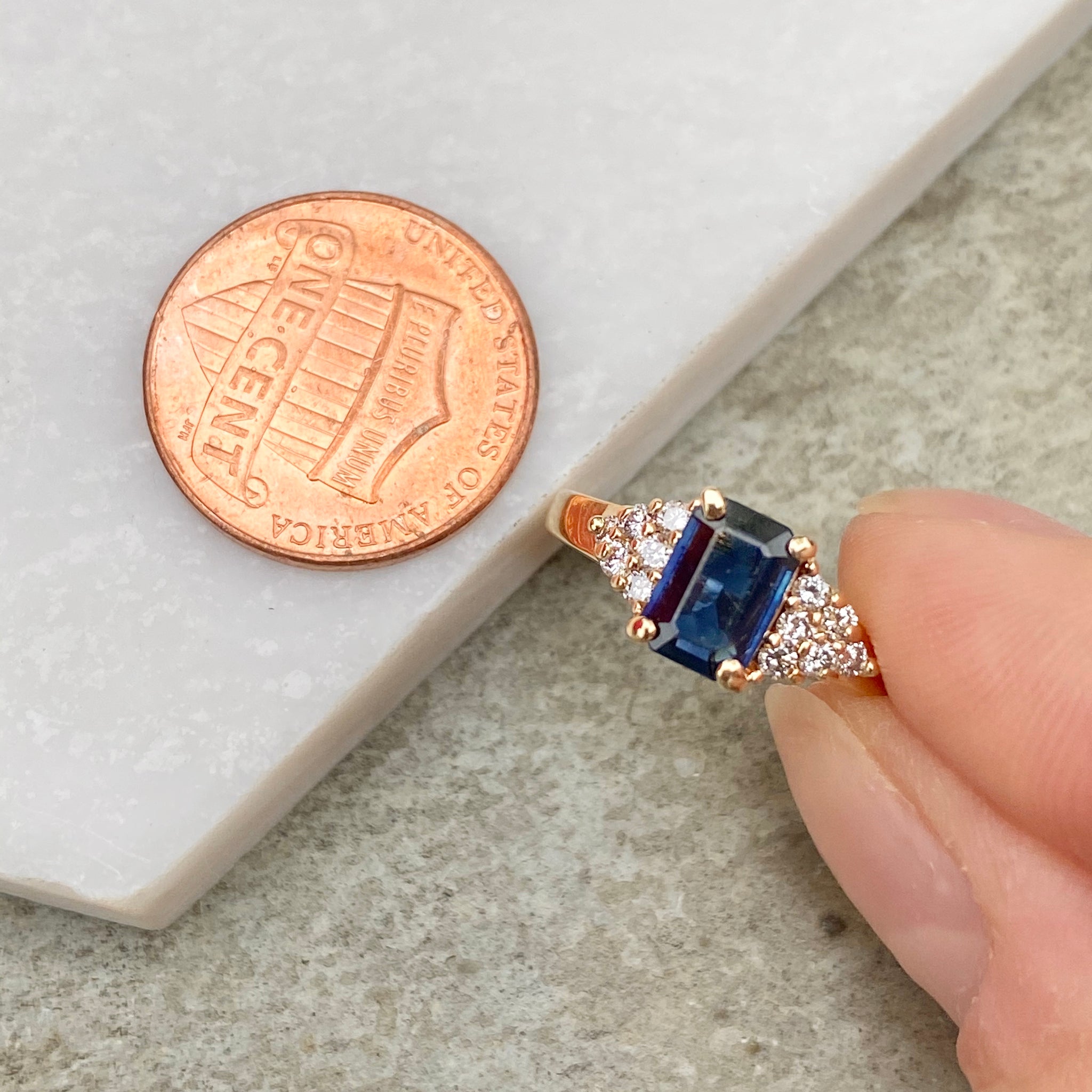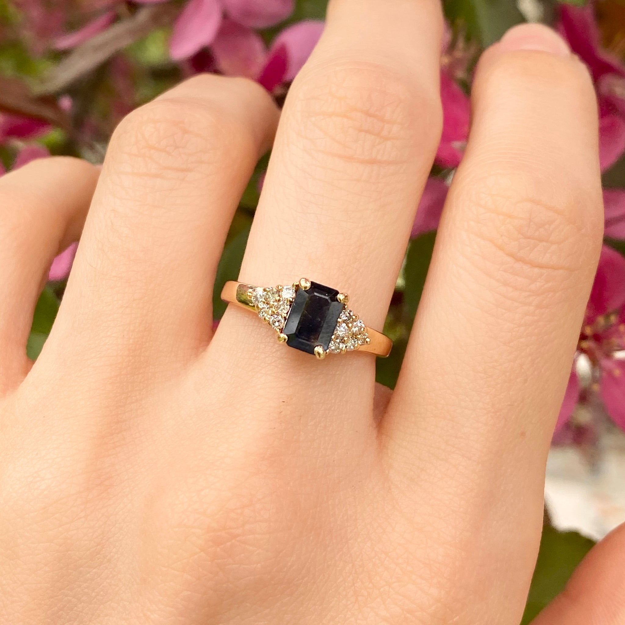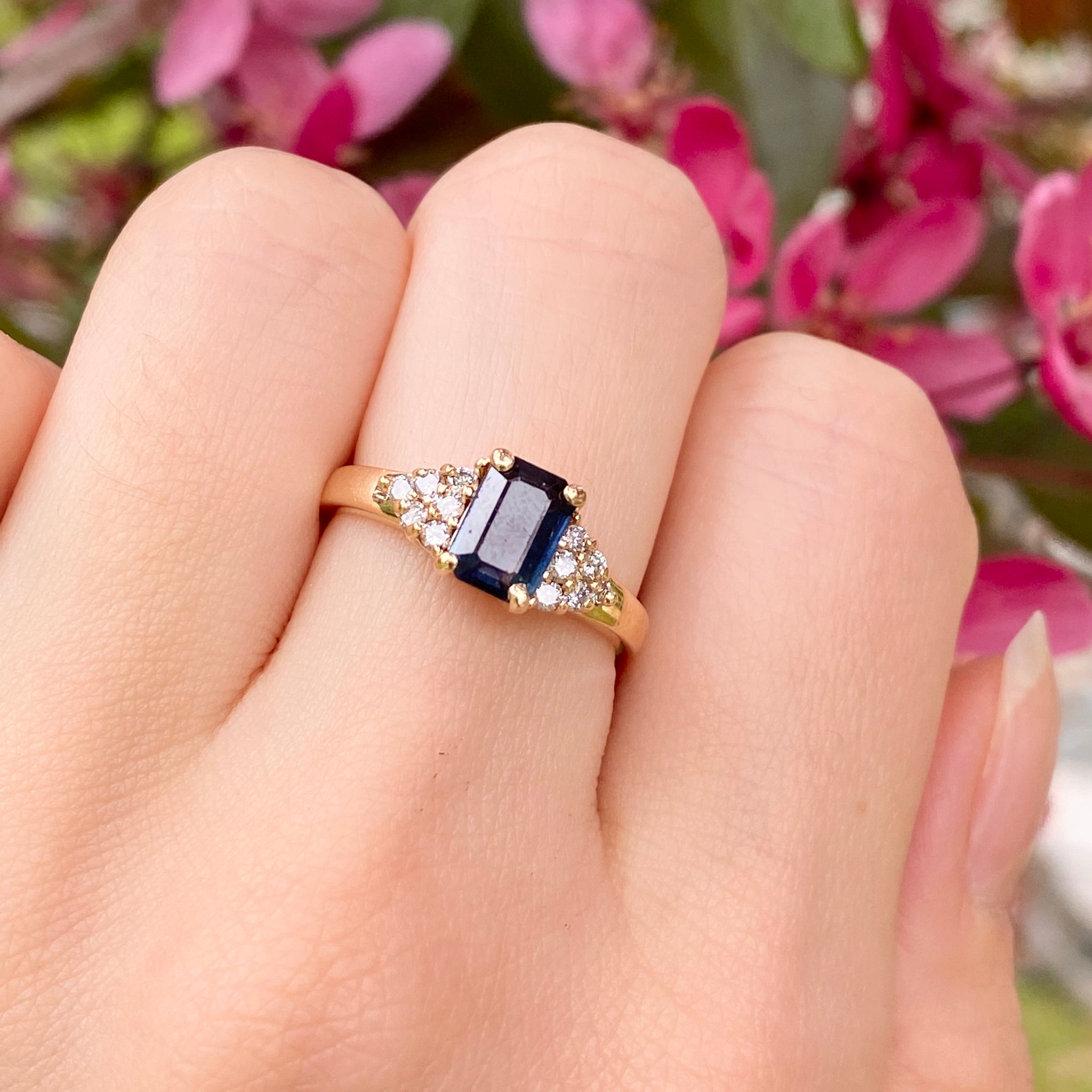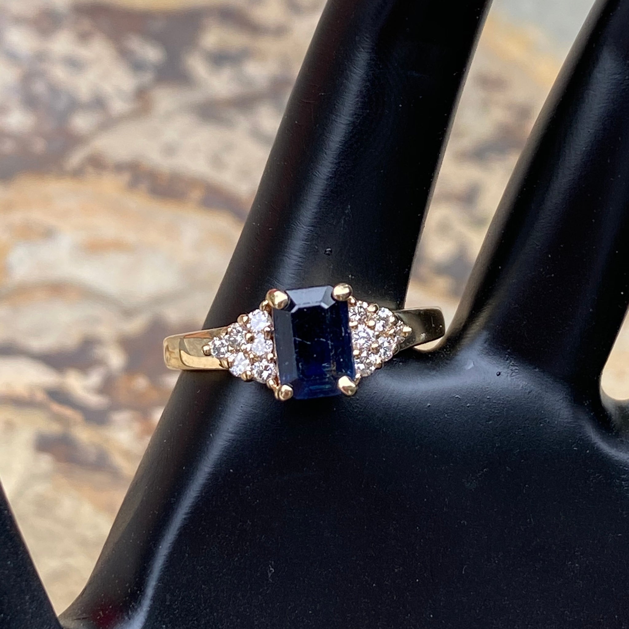 14KT yellow gold emerald-cut blue sapphire + diamond accent ring. Stunning blue color! Sapphire is the birthstone for September babies- and this piece makes a spectacular gift!