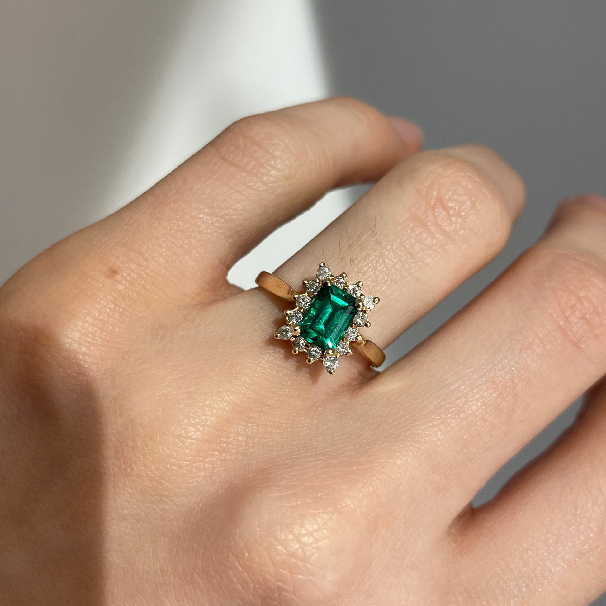 Estate 14KT Yellow Gold Emerald-Cut Lab Emerald + Diamond Halo Ring
