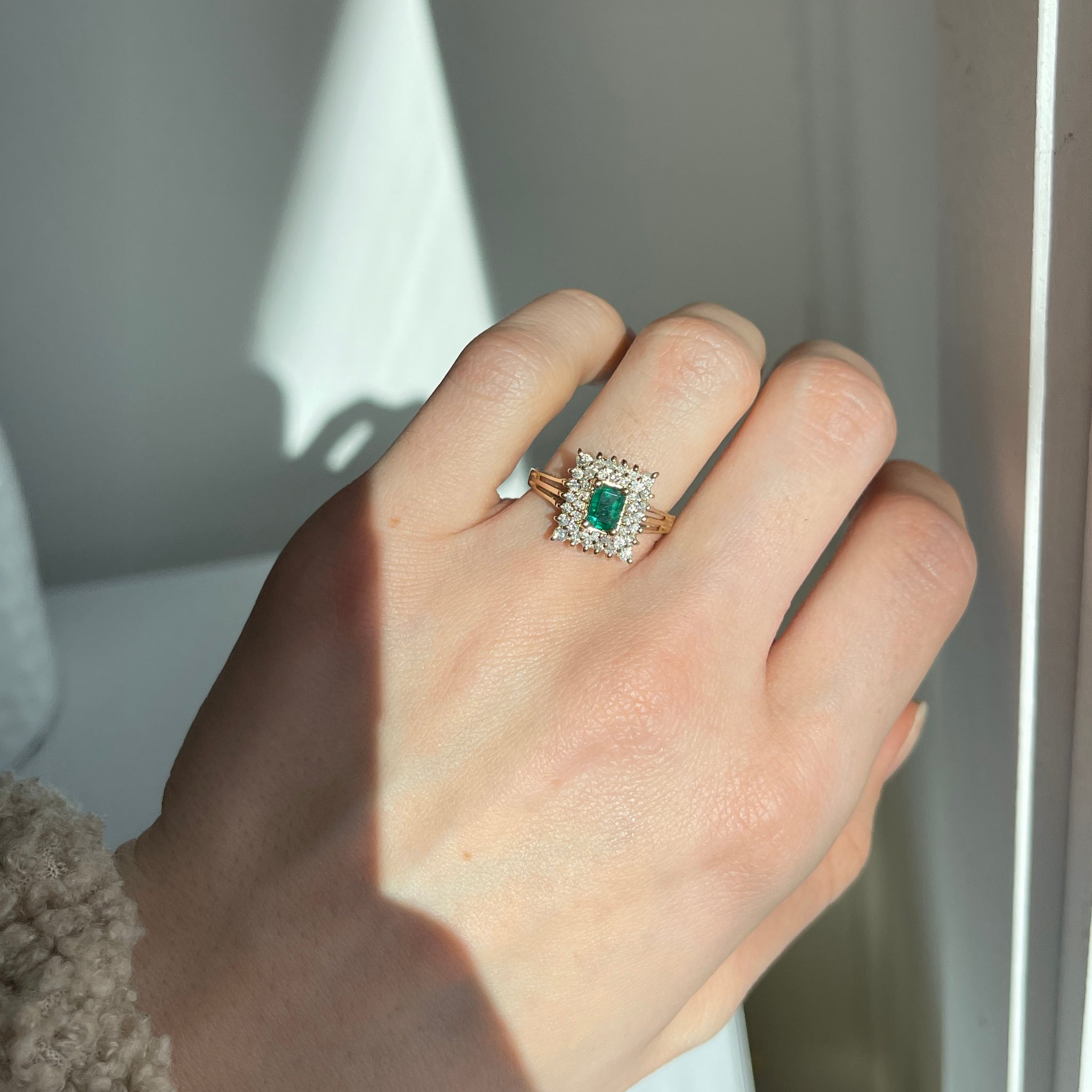 Estate 14KT Yellow Gold Emerald-Cut Lab Emerald + Double Diamond Halo Ring
