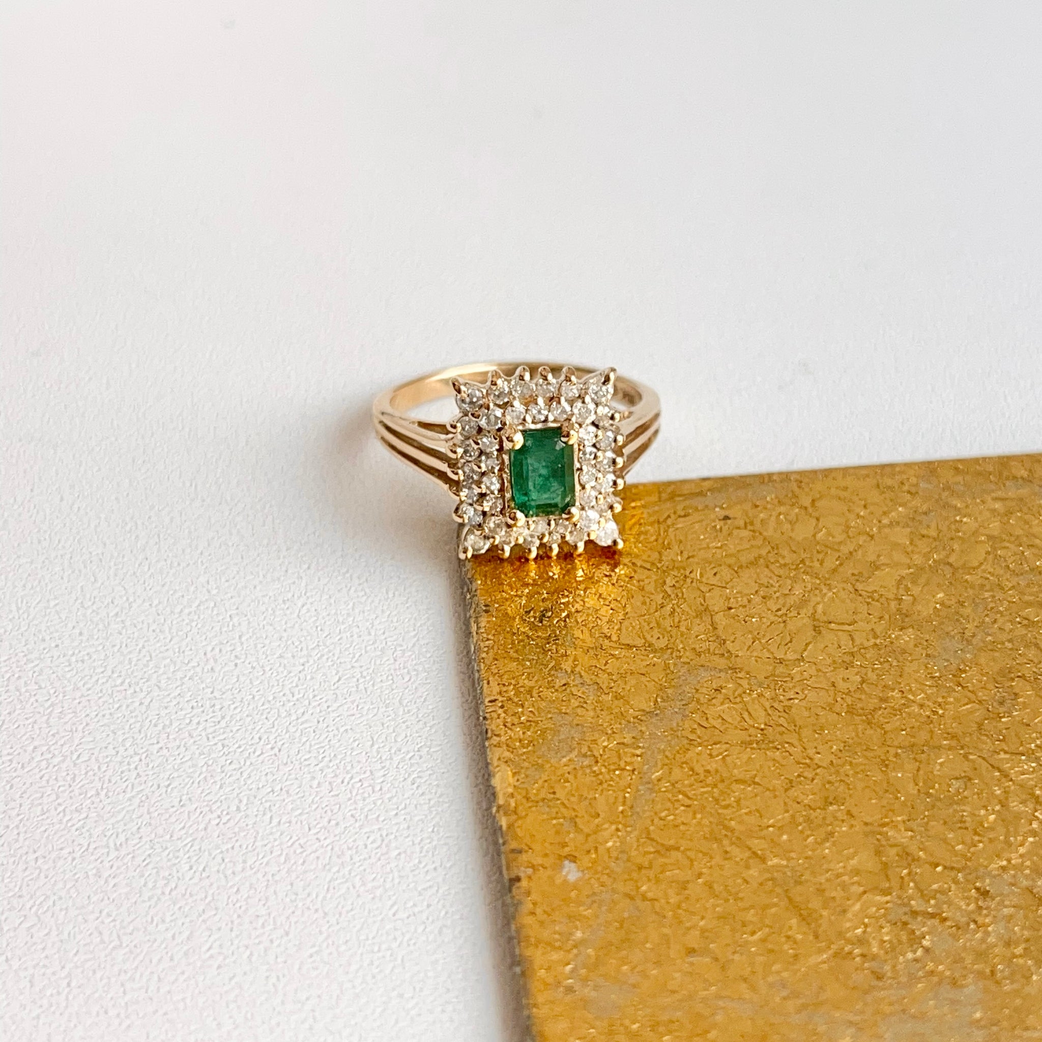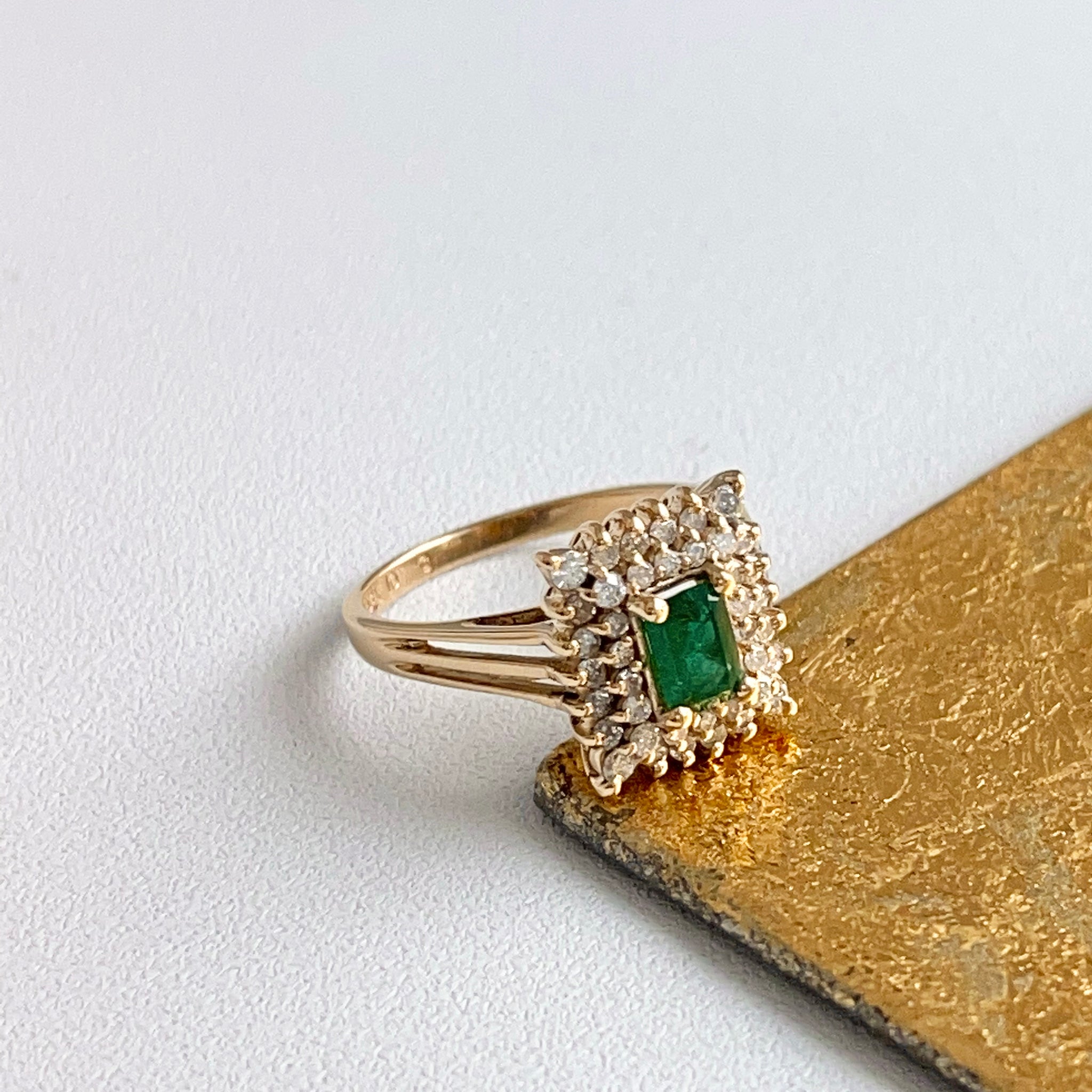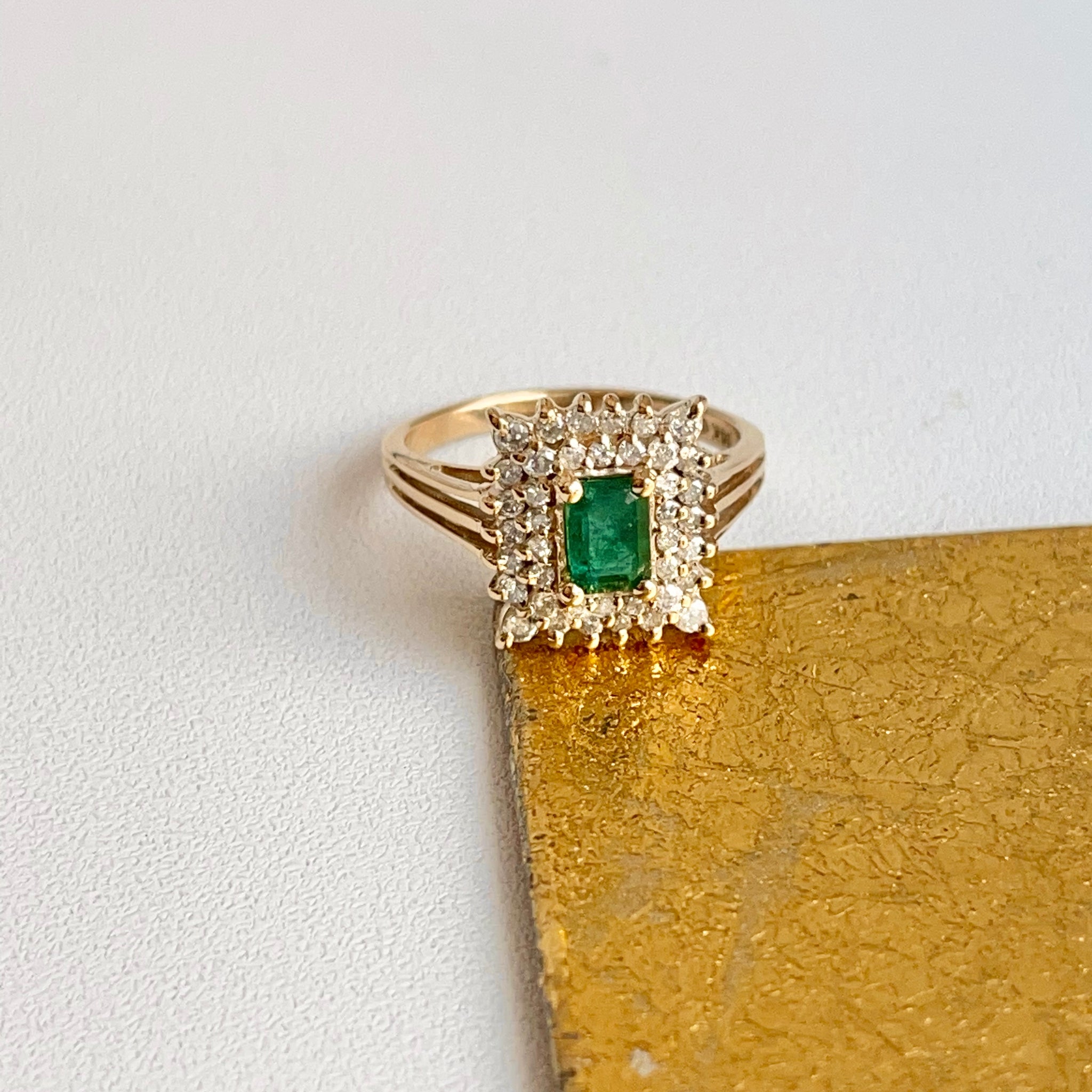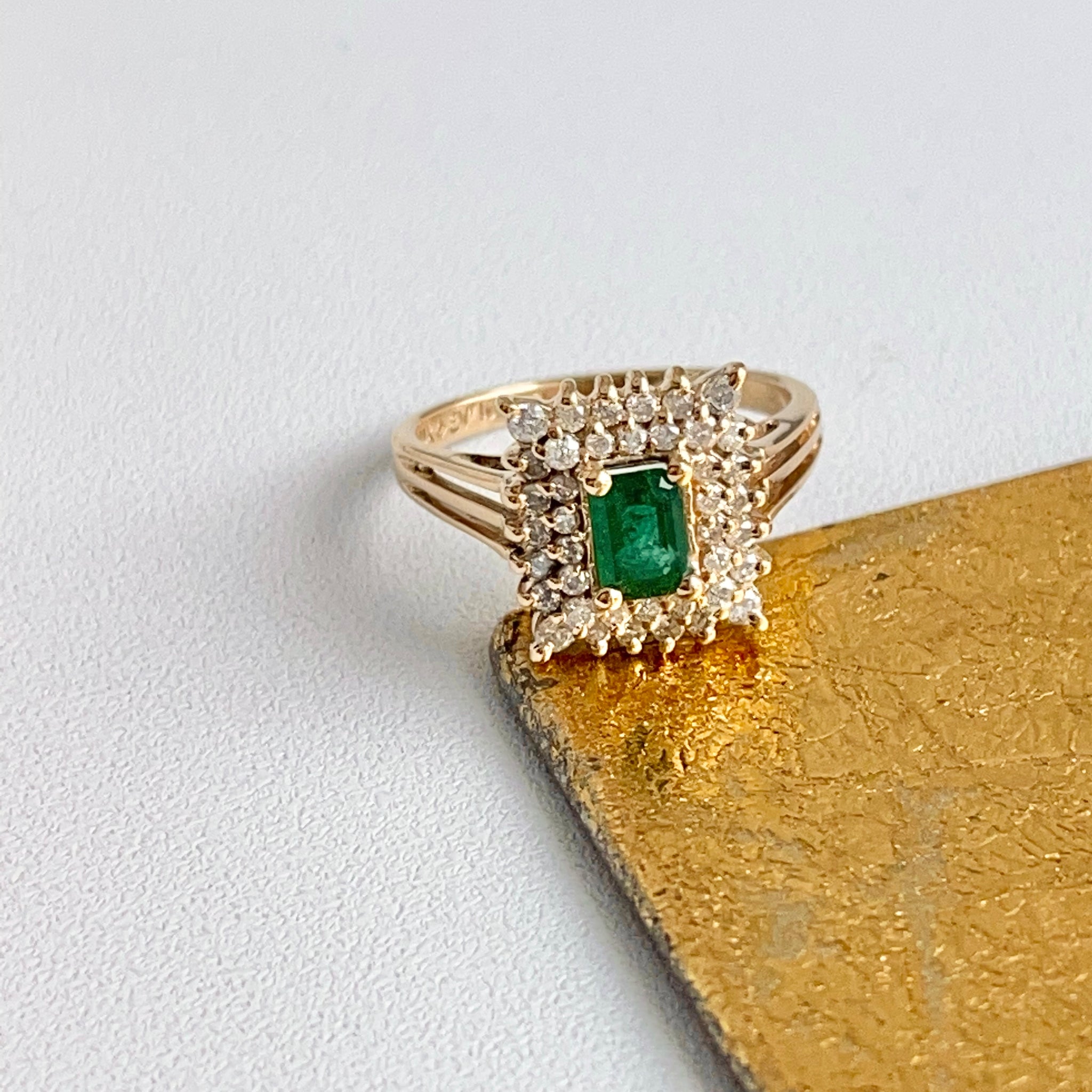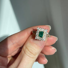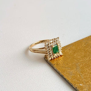Estate/ vintage 14KT yellow gold emerald-cut, lab-created rmerald + double, squared diamond halo ring.