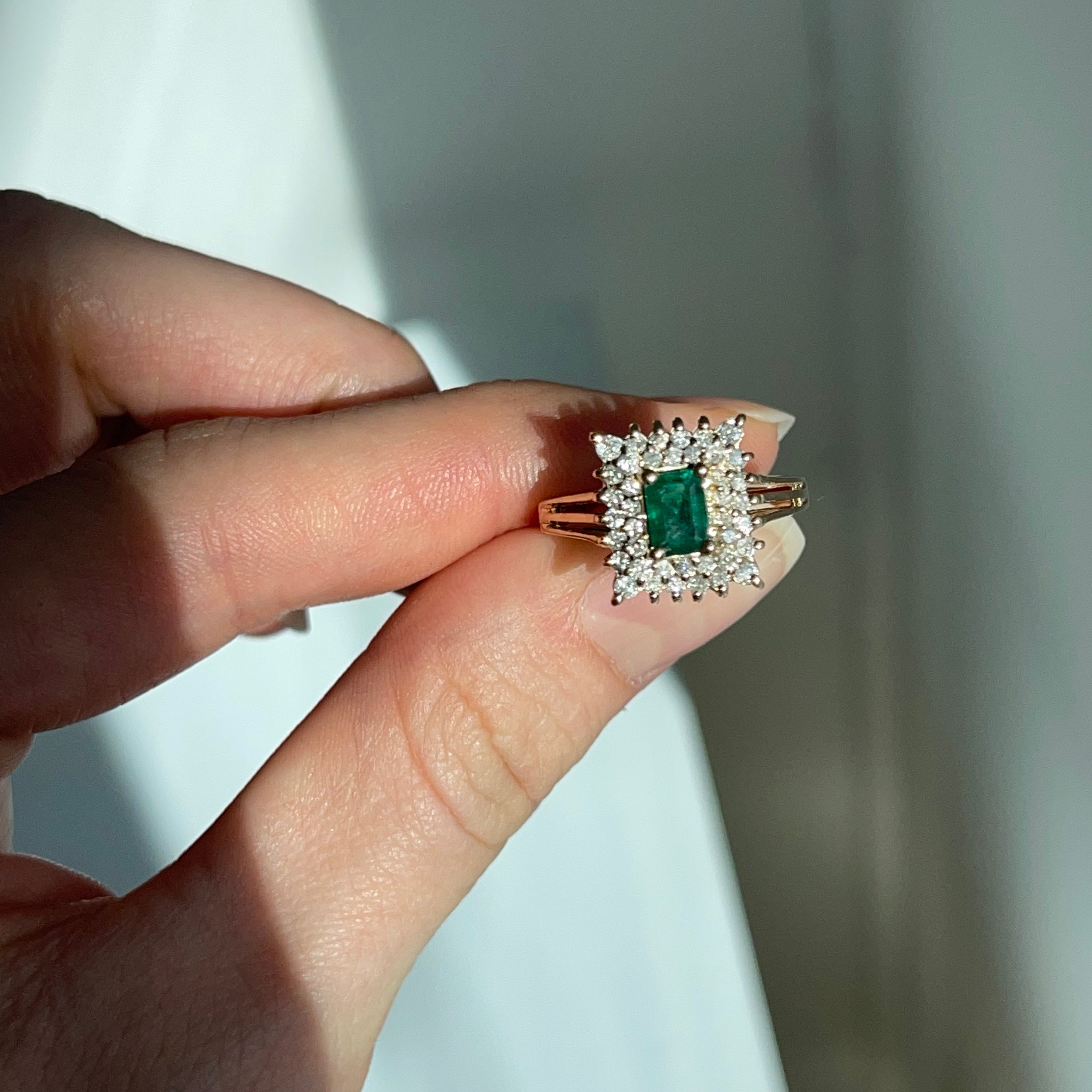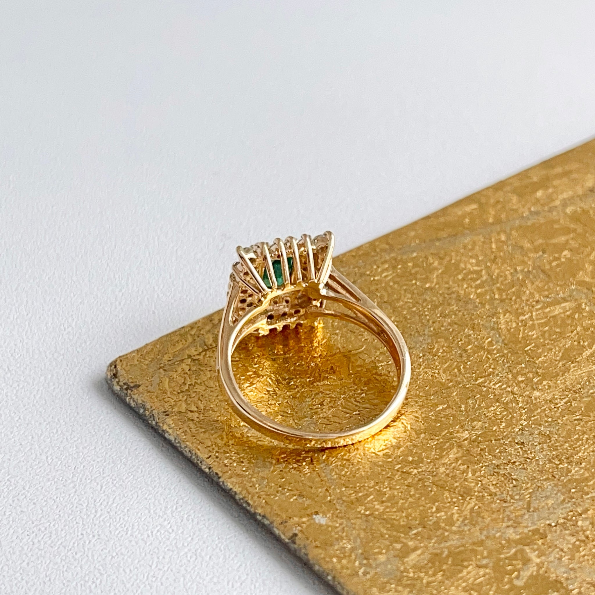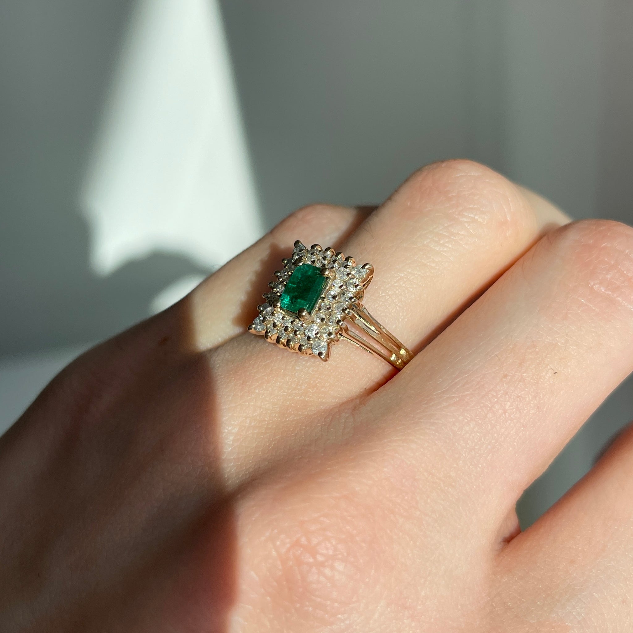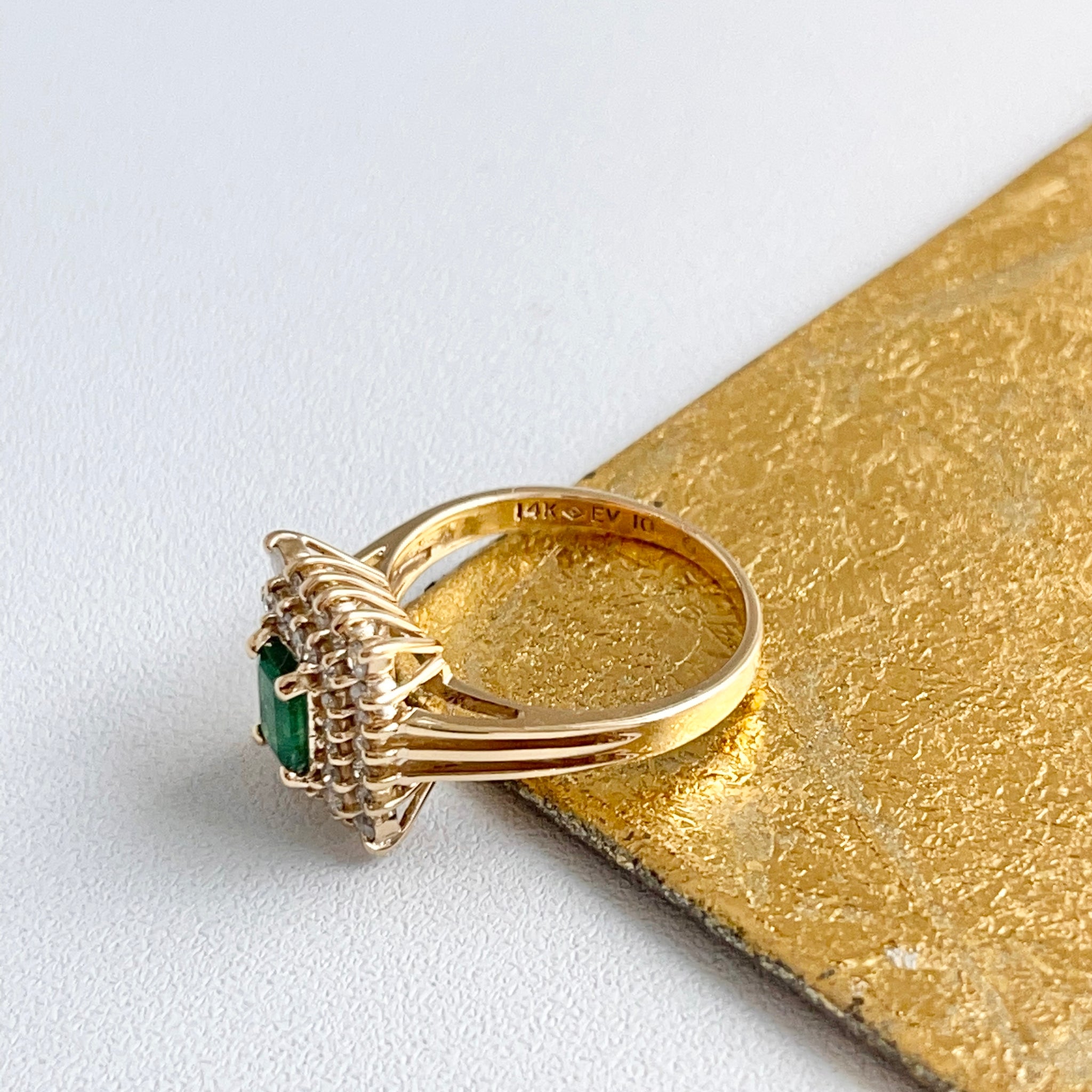 Estate/ vintage 14KT yellow gold emerald-cut, lab-created rmerald + double, squared diamond halo ring.