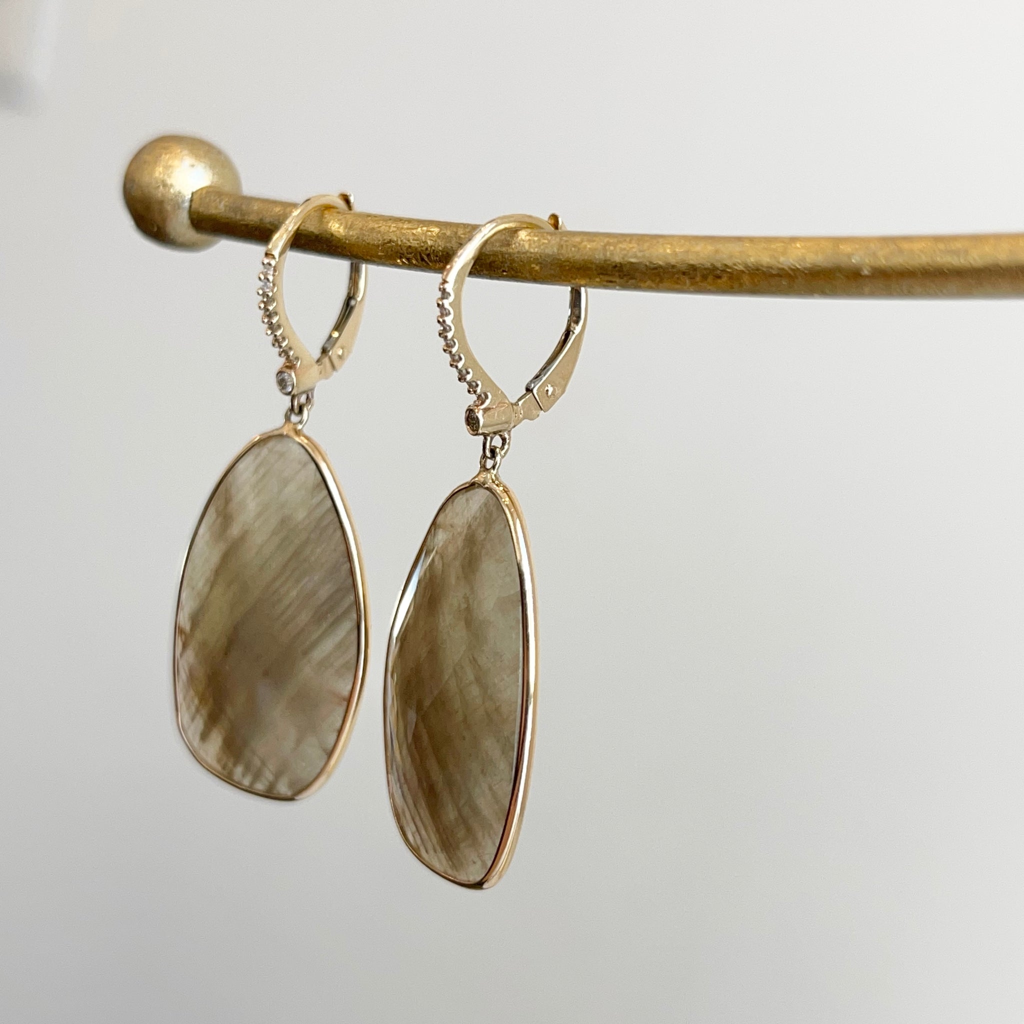 Estate 14KT Yellow Gold Faceted Green Sapphire + Pave Diamond Lever Back Earrings