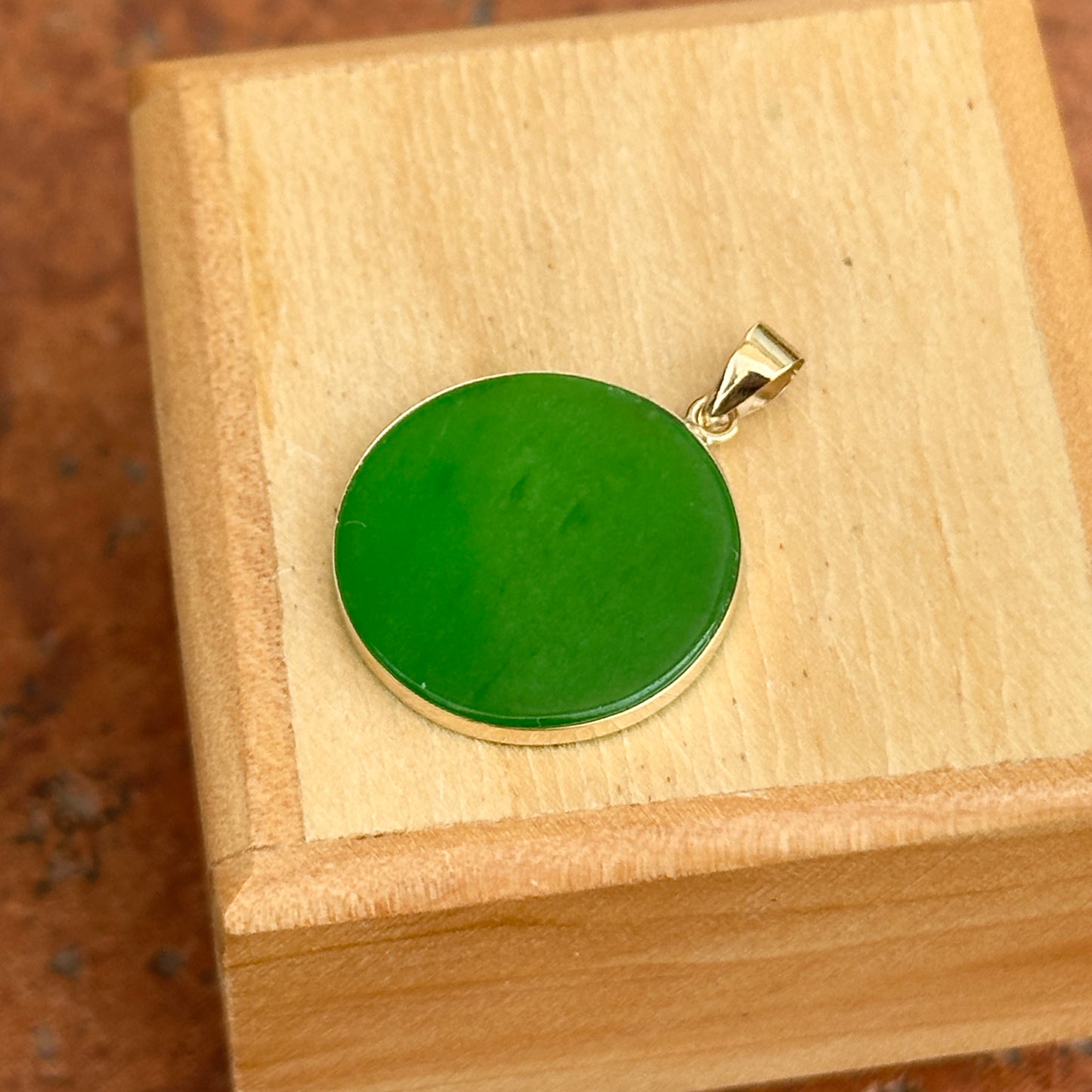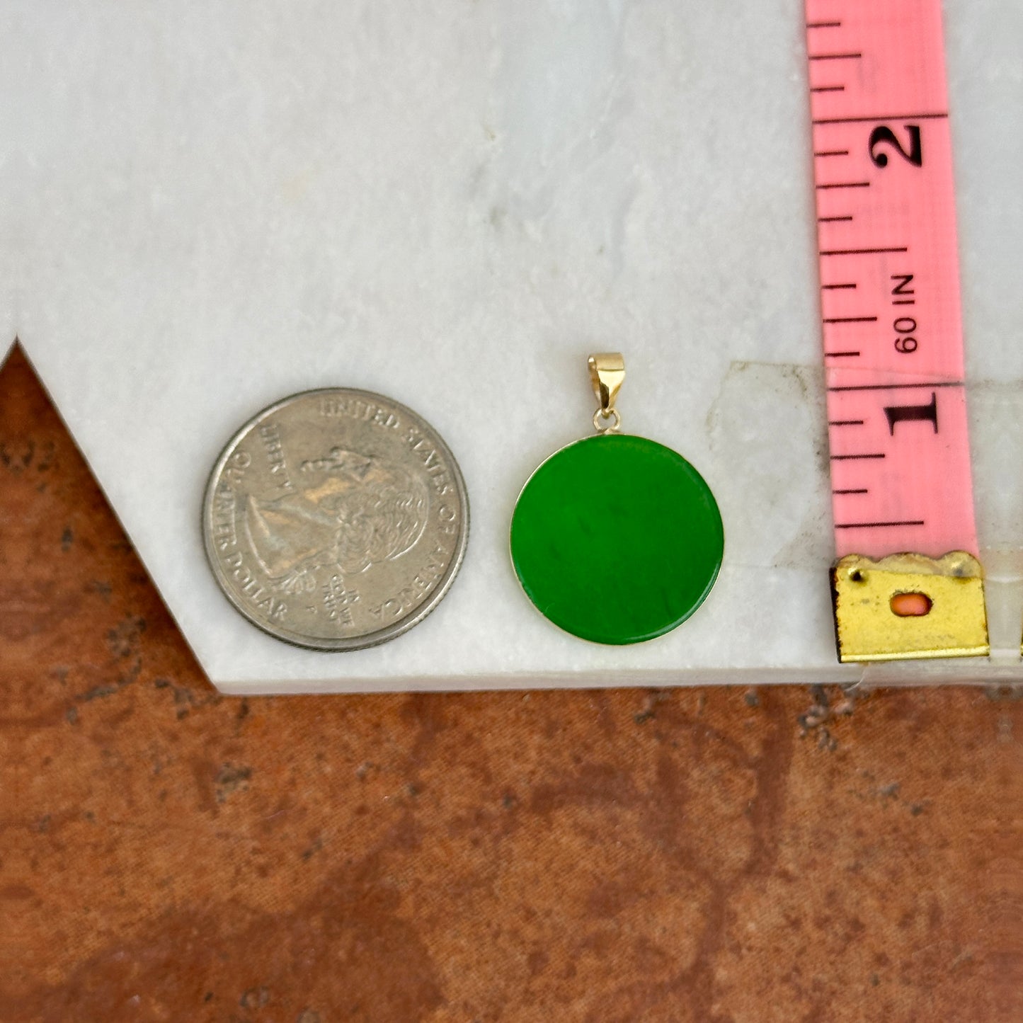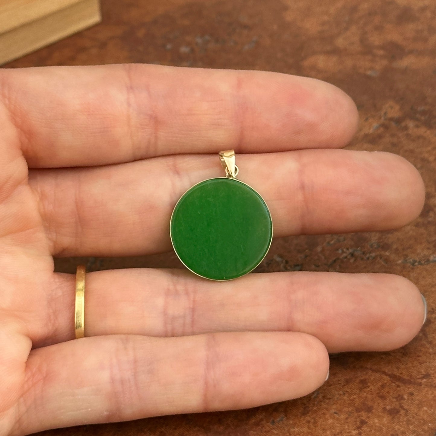 Estate 14KT yellow gold round, genuine, dyed, green jade flat circle disc pendant.