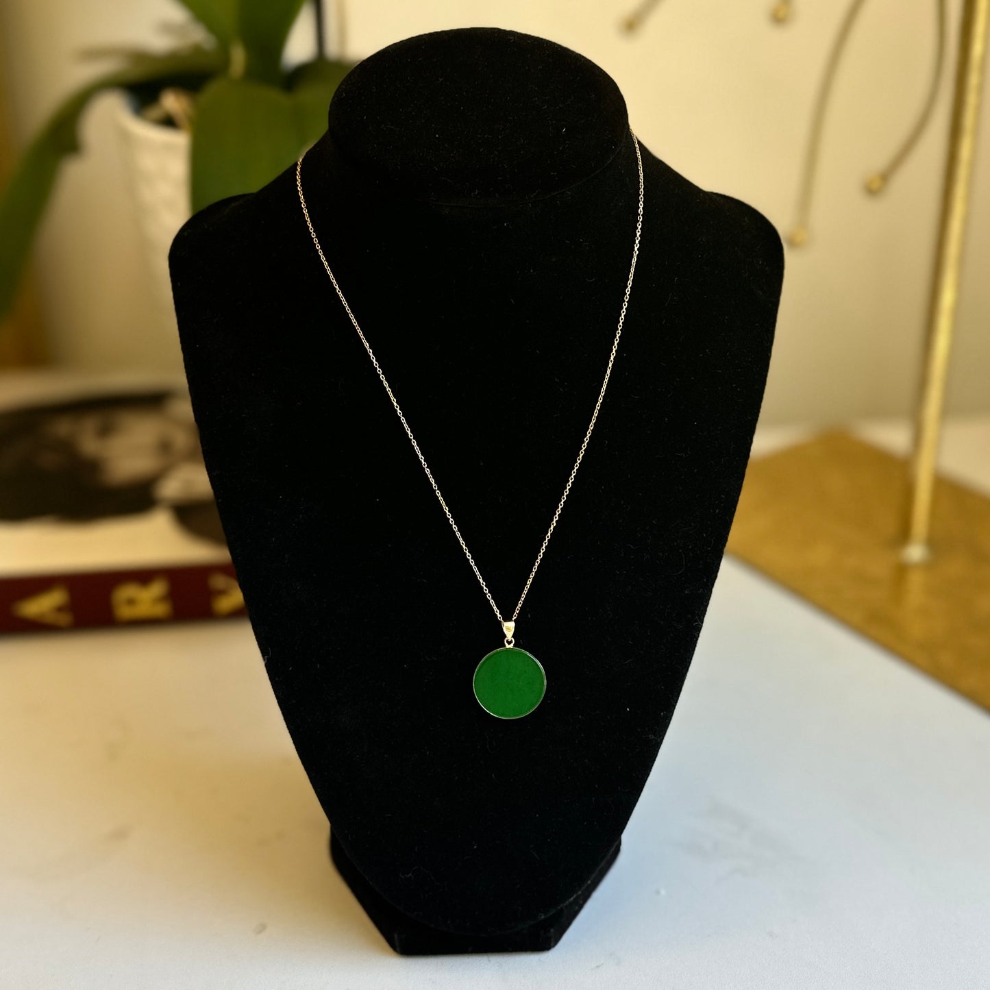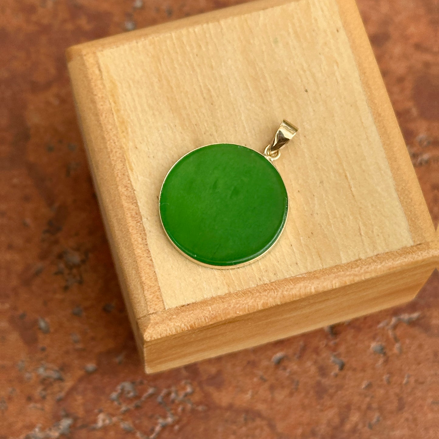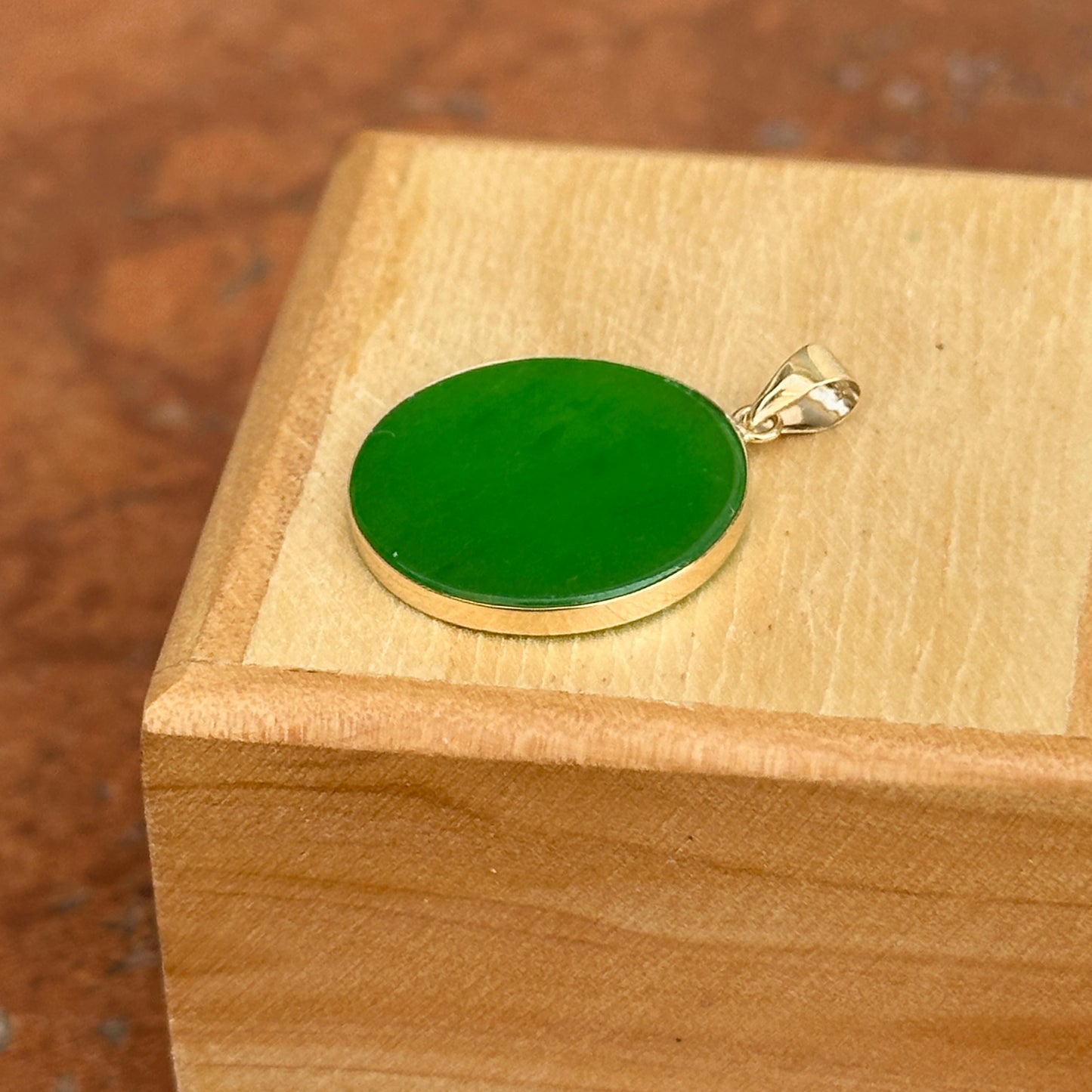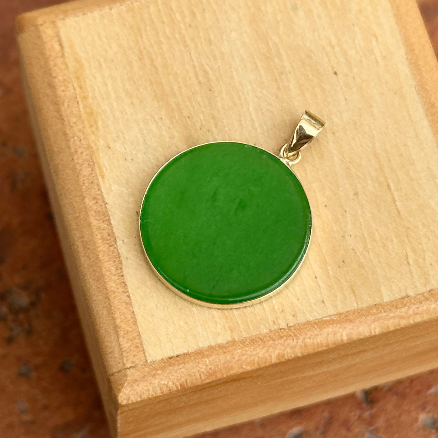 Estate 14KT yellow gold round, genuine, dyed, green jade flat circle disc pendant.