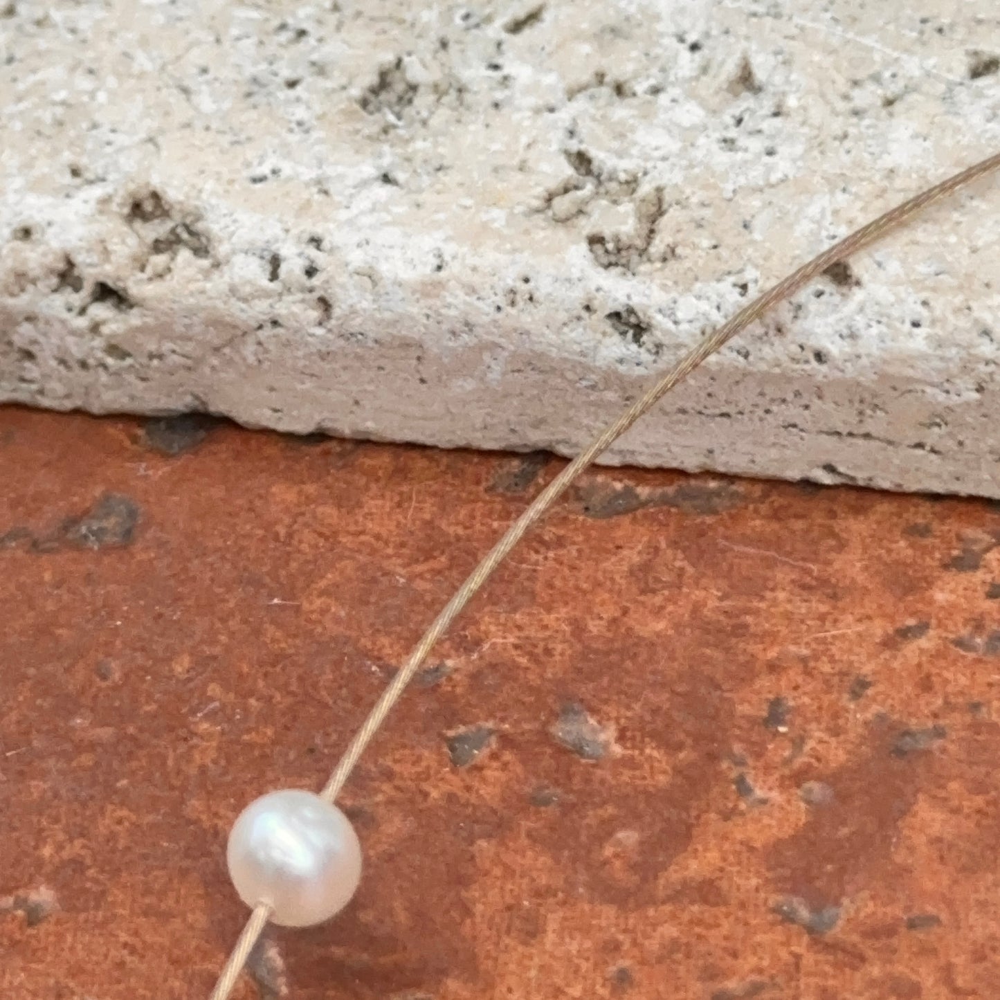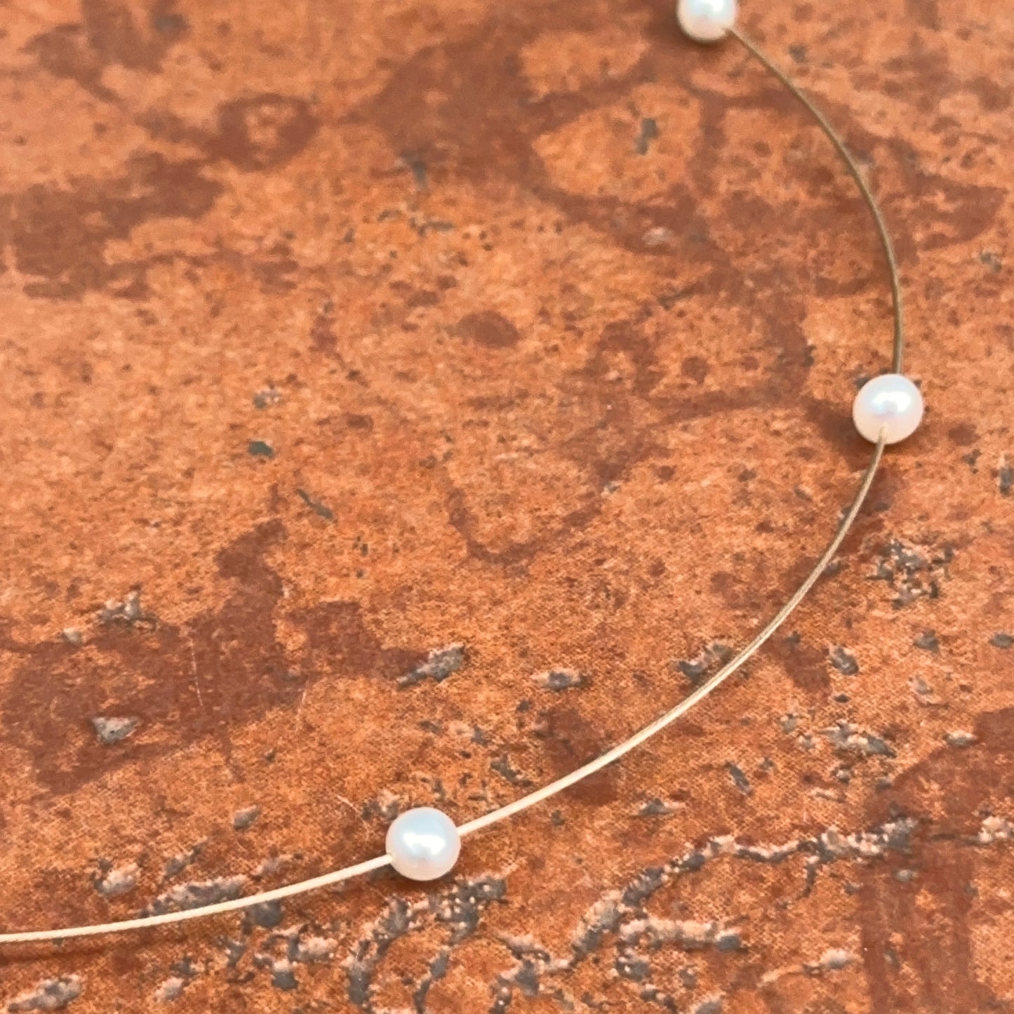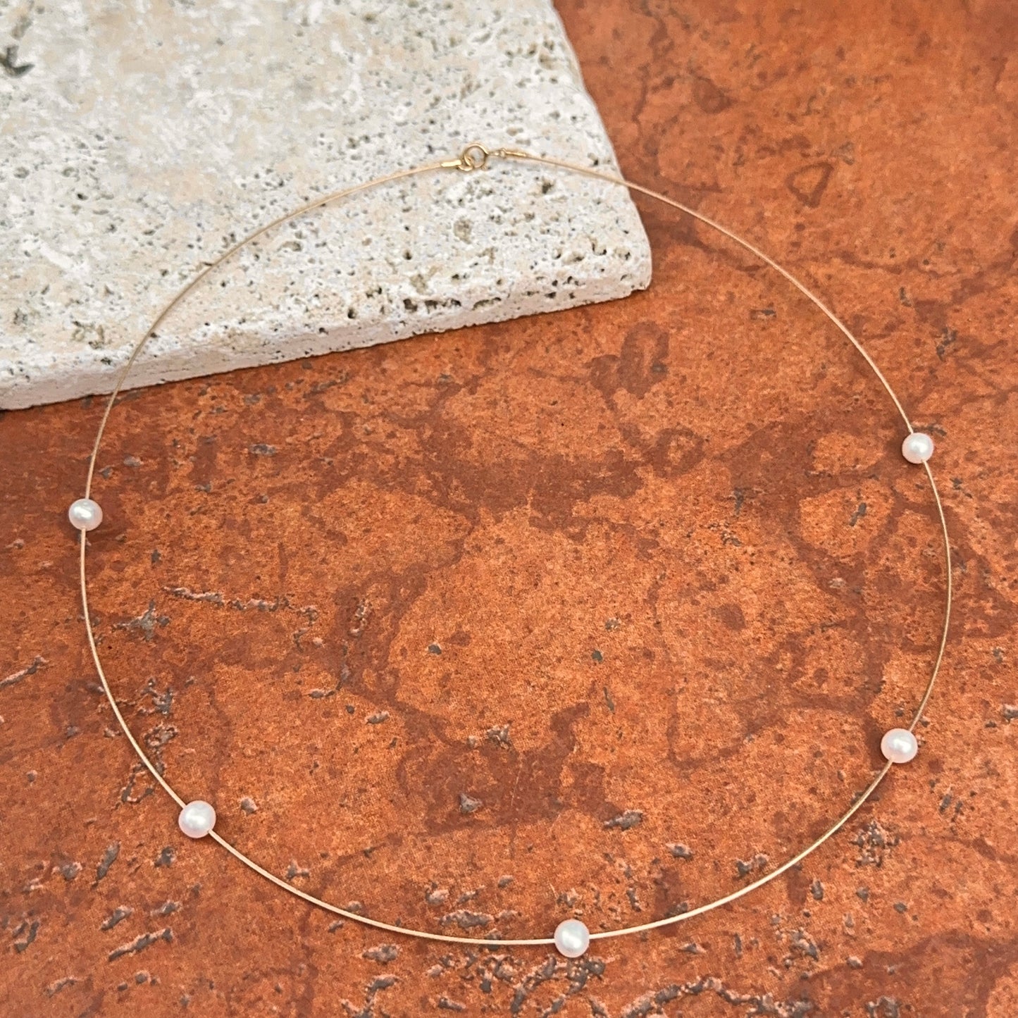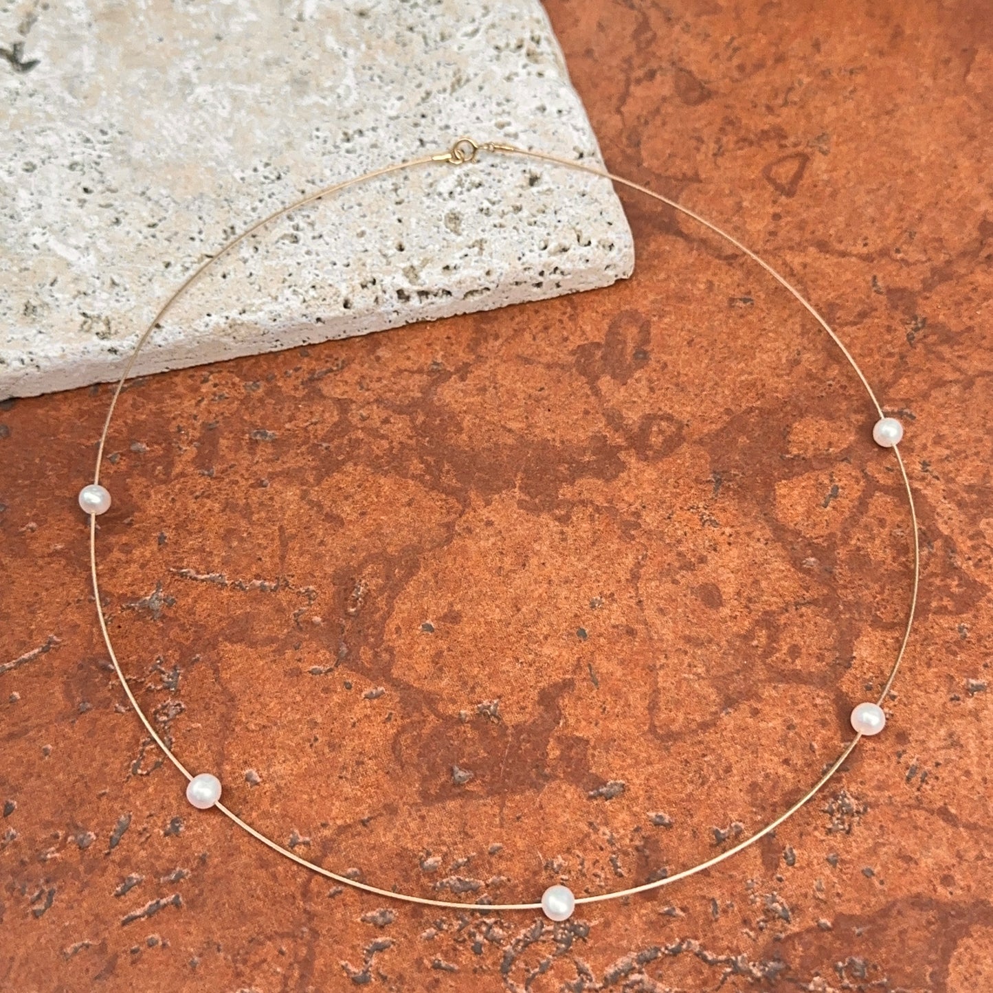 14KT yellow gold single strand cable wire station necklace with white, cultured, freshwater pearls. Collar-like, holds it's shape!