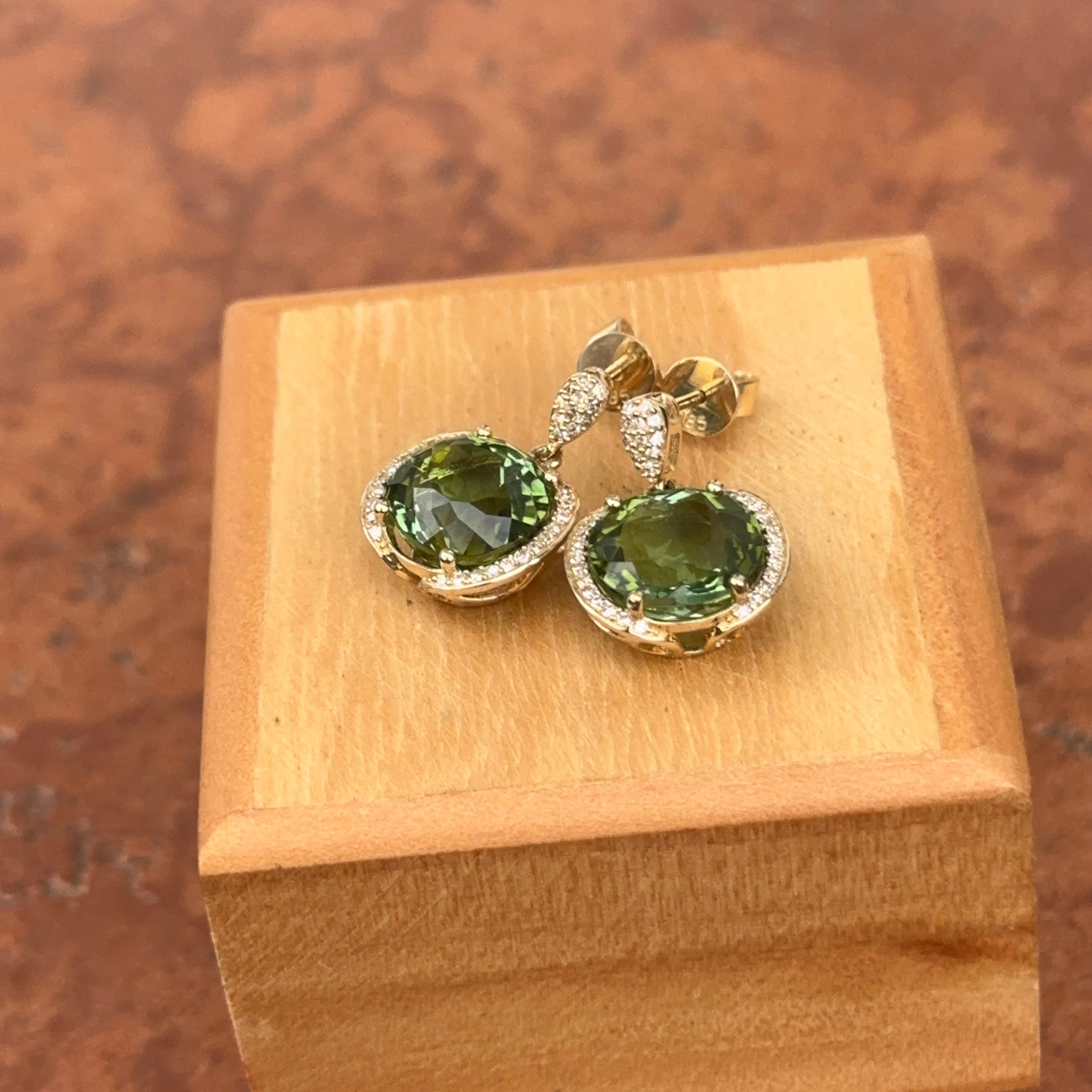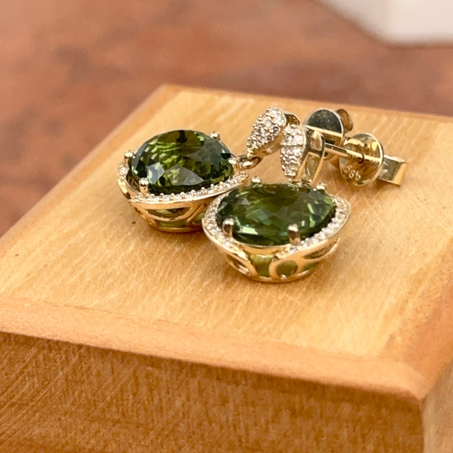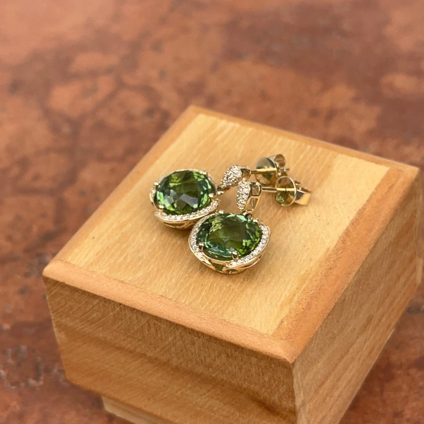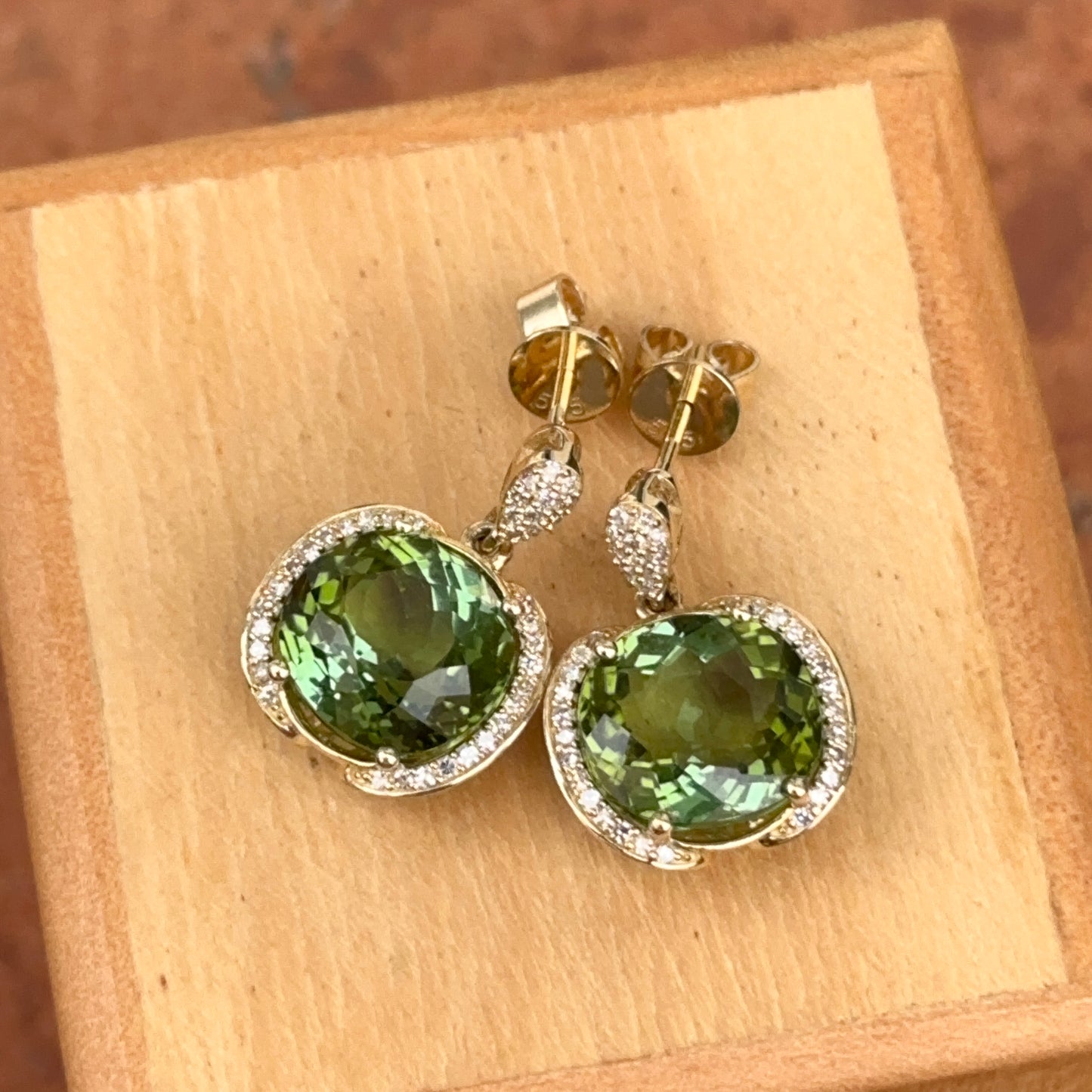 Estate 14KT Yellow Gold Green Tourmaline + Pave Diamond Earrings