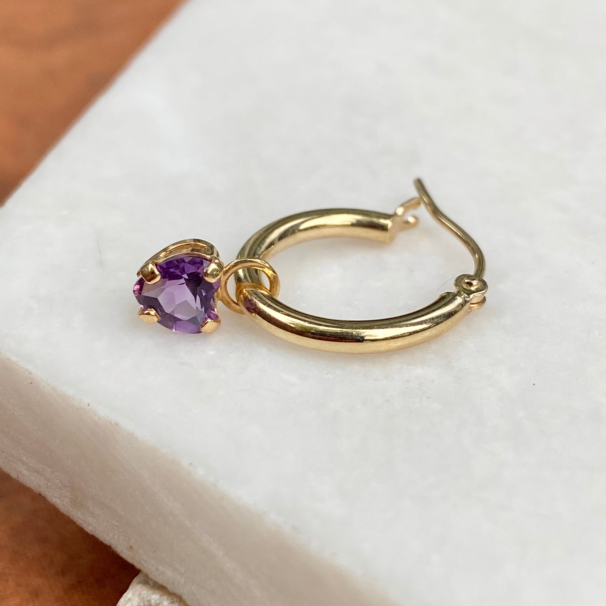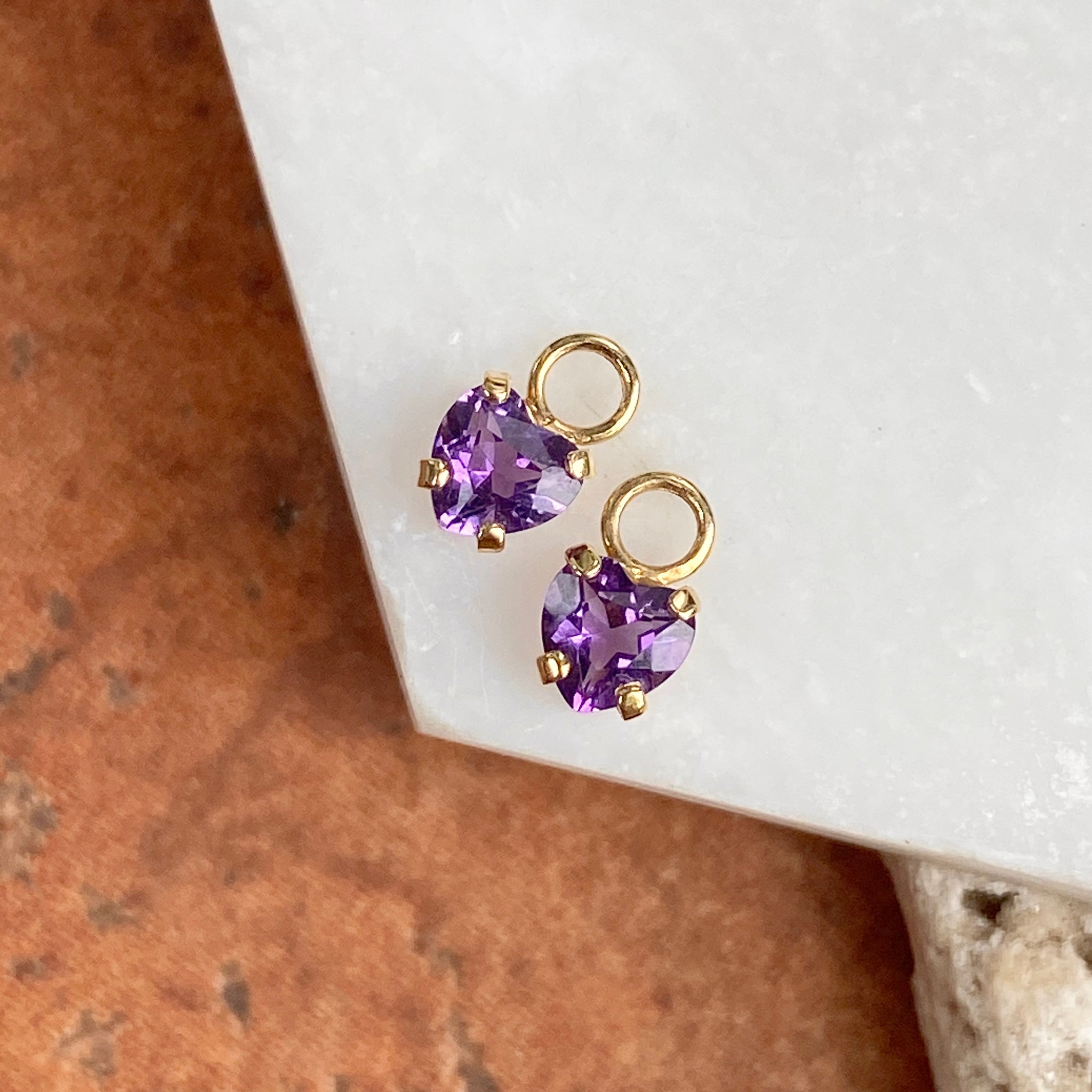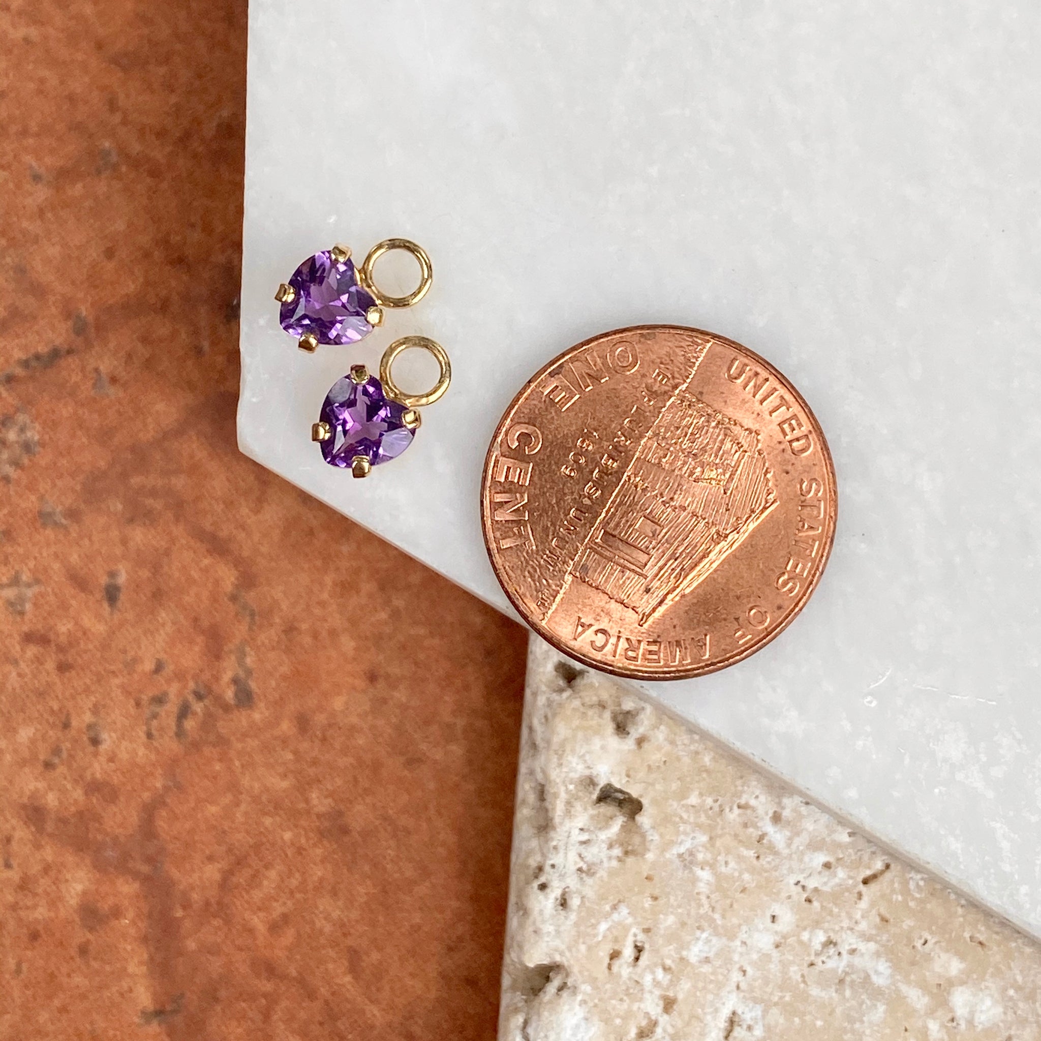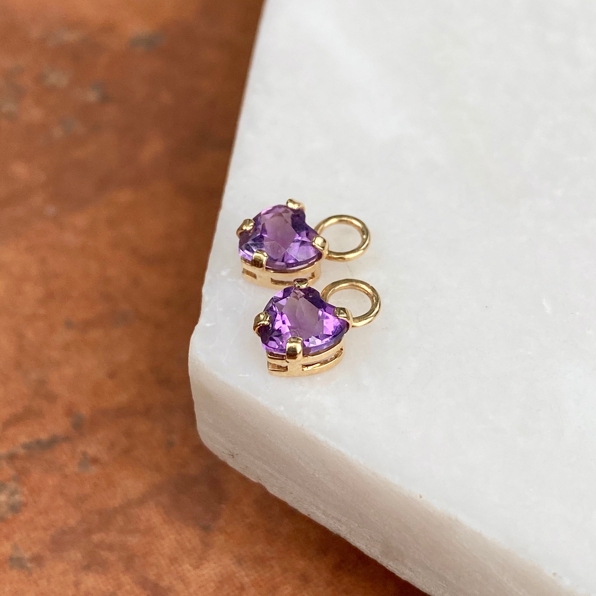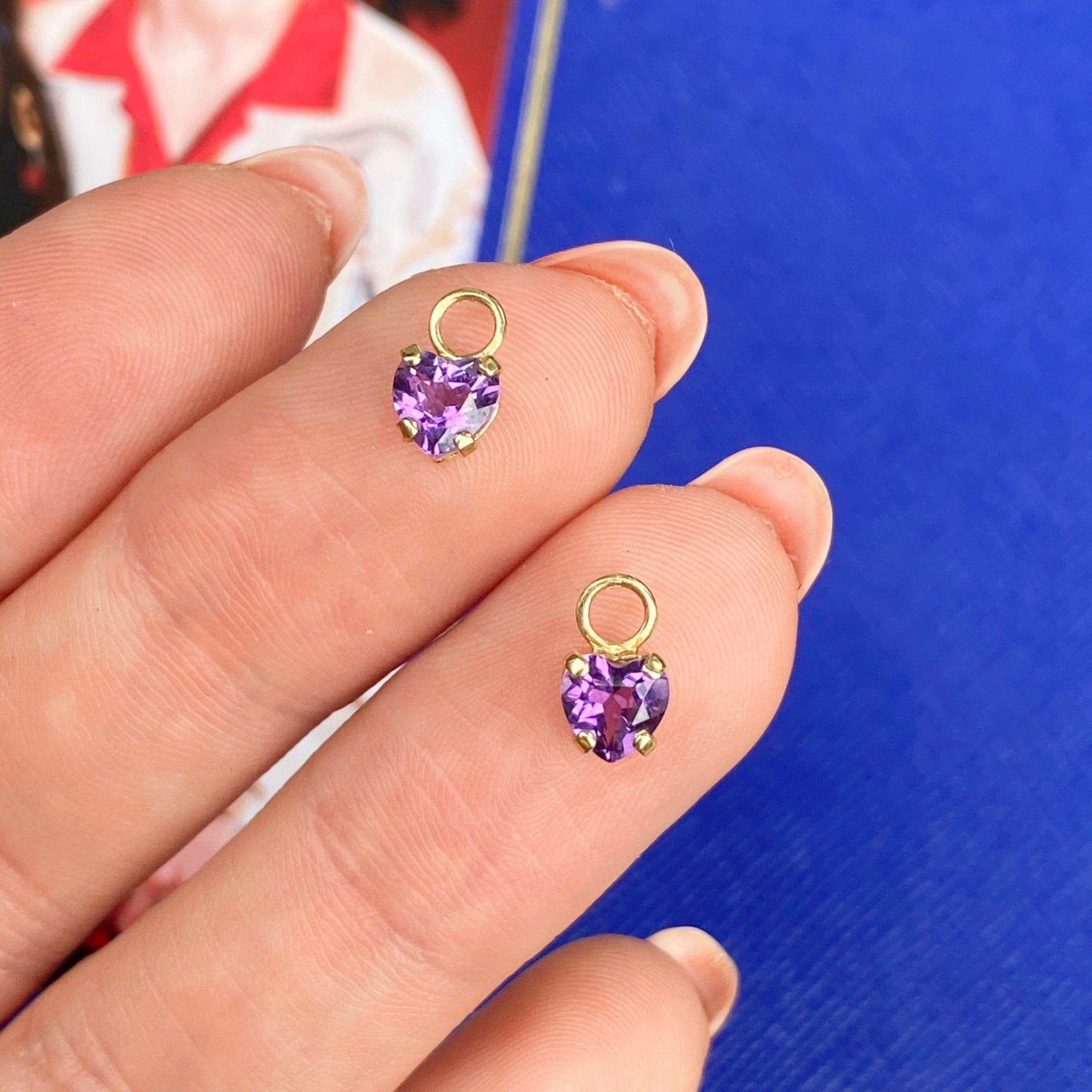 Estate/ vintage 14KT yellow gold polished, genuine, faceted, heart-shaped amethyst earring charms. Vibrant + petite earring charms to slide on your favorite hoops! Or add one onto a gold chain as a pendant.