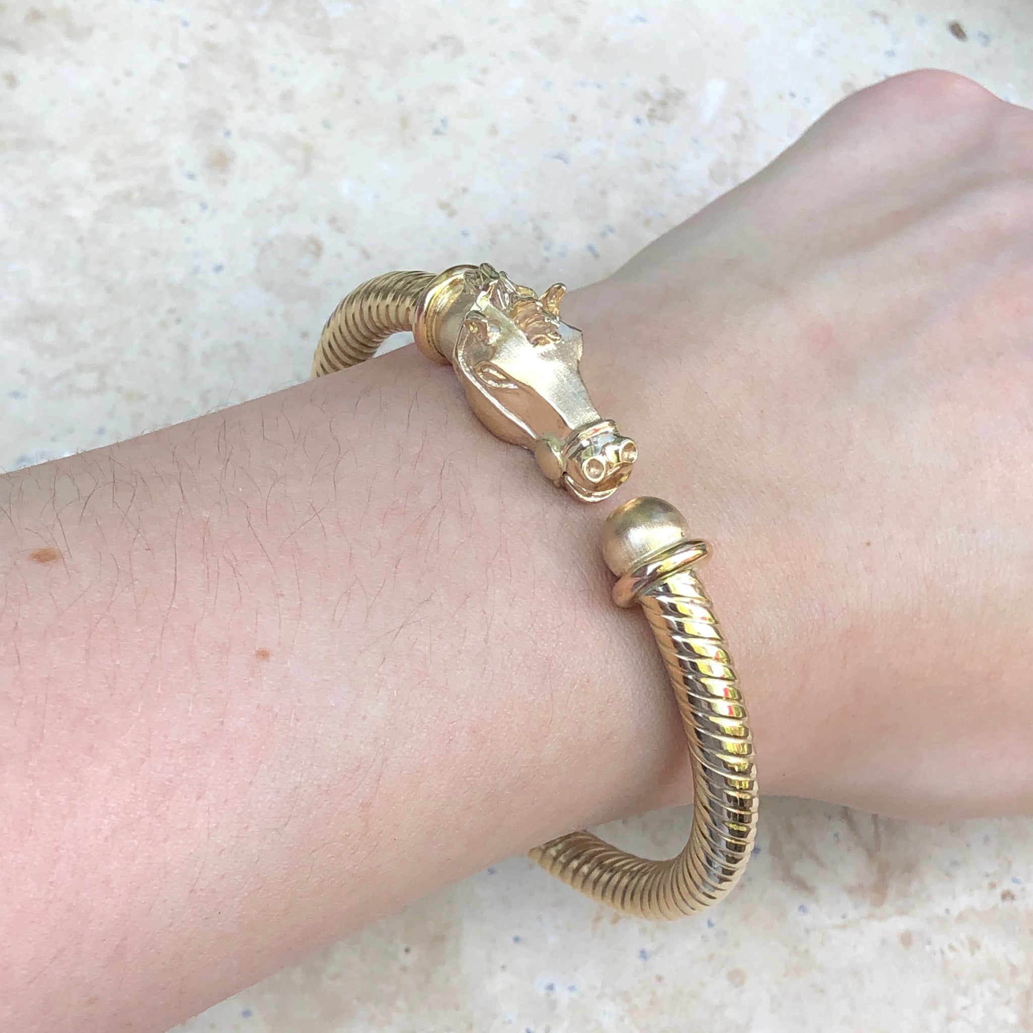 Estate, rare 14KT yellow gold bangle cuff bracelet with horse head end cap. Features a shiny yellow gold with a matte horse head. Bracelet is supposed to be an open cuff with space in between the two end caps. There is a small ding on round end cap; hard to notice when on. Rare cuff item, perfect for the horse lover!