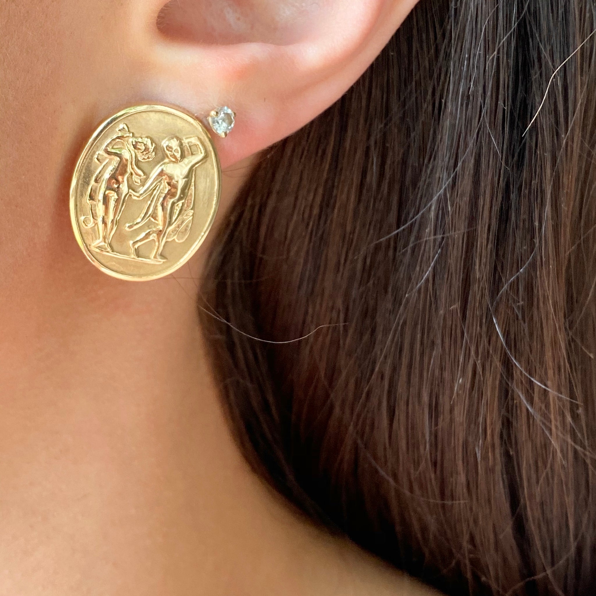 Estate/ vintage 14KT yellow gold hinged detailed Italian soldier intaglio omega back earrings. Features both a matte + polished finish to highlight the raised pattern of the soldiers. With an omega back closure, you can change up the look of these earrings by adding on earring charms!