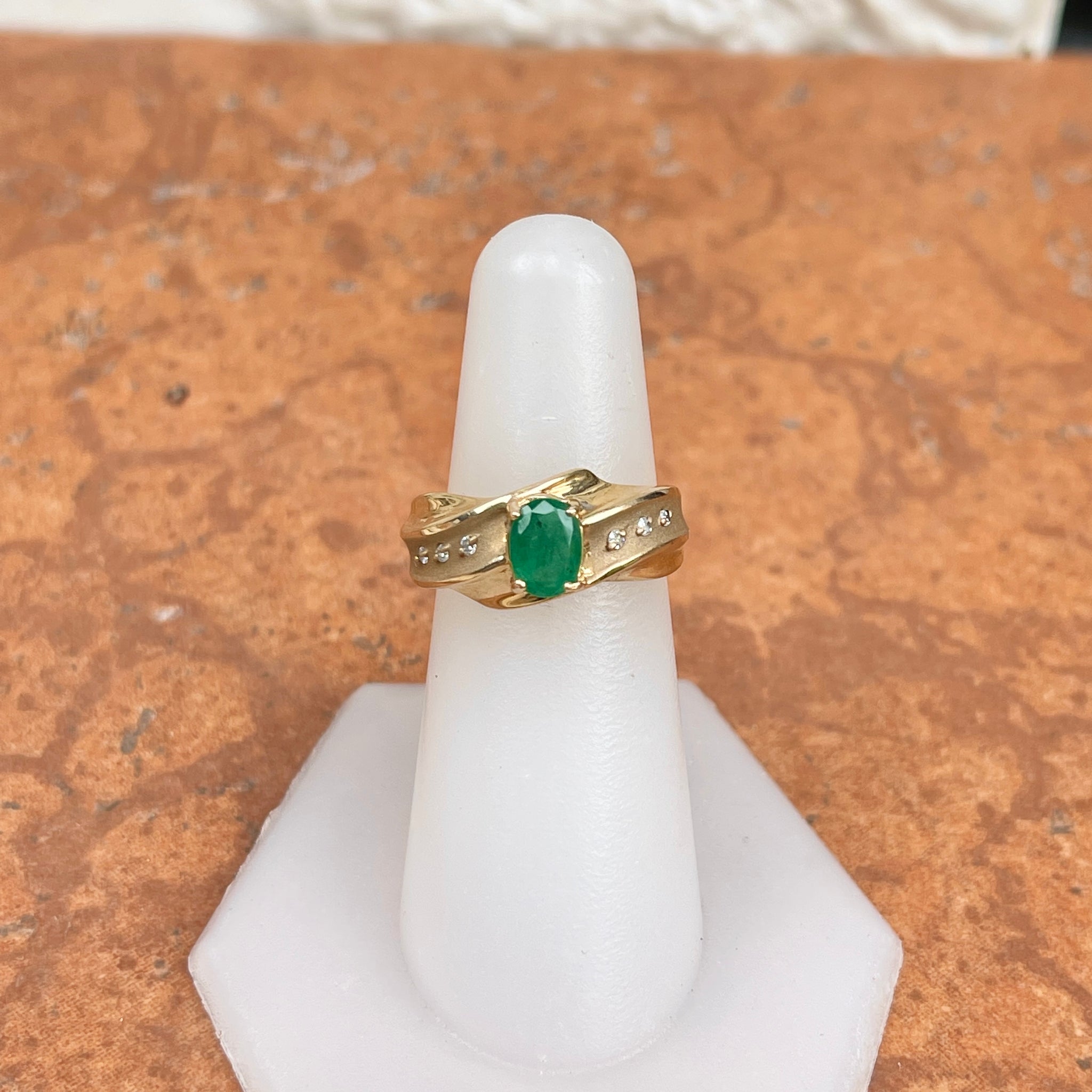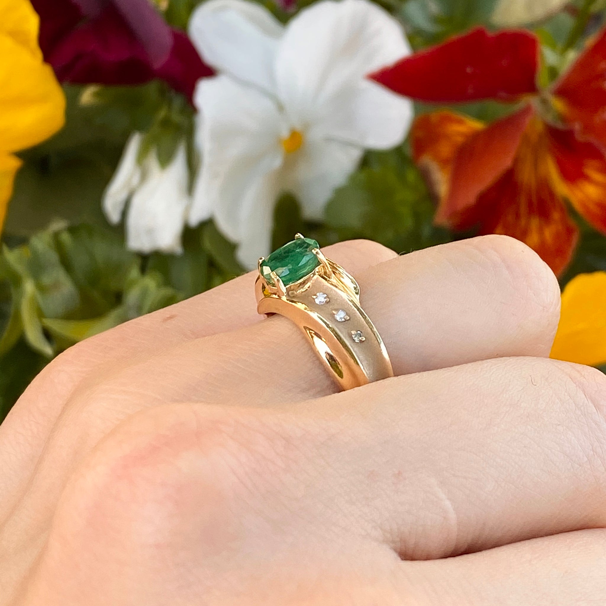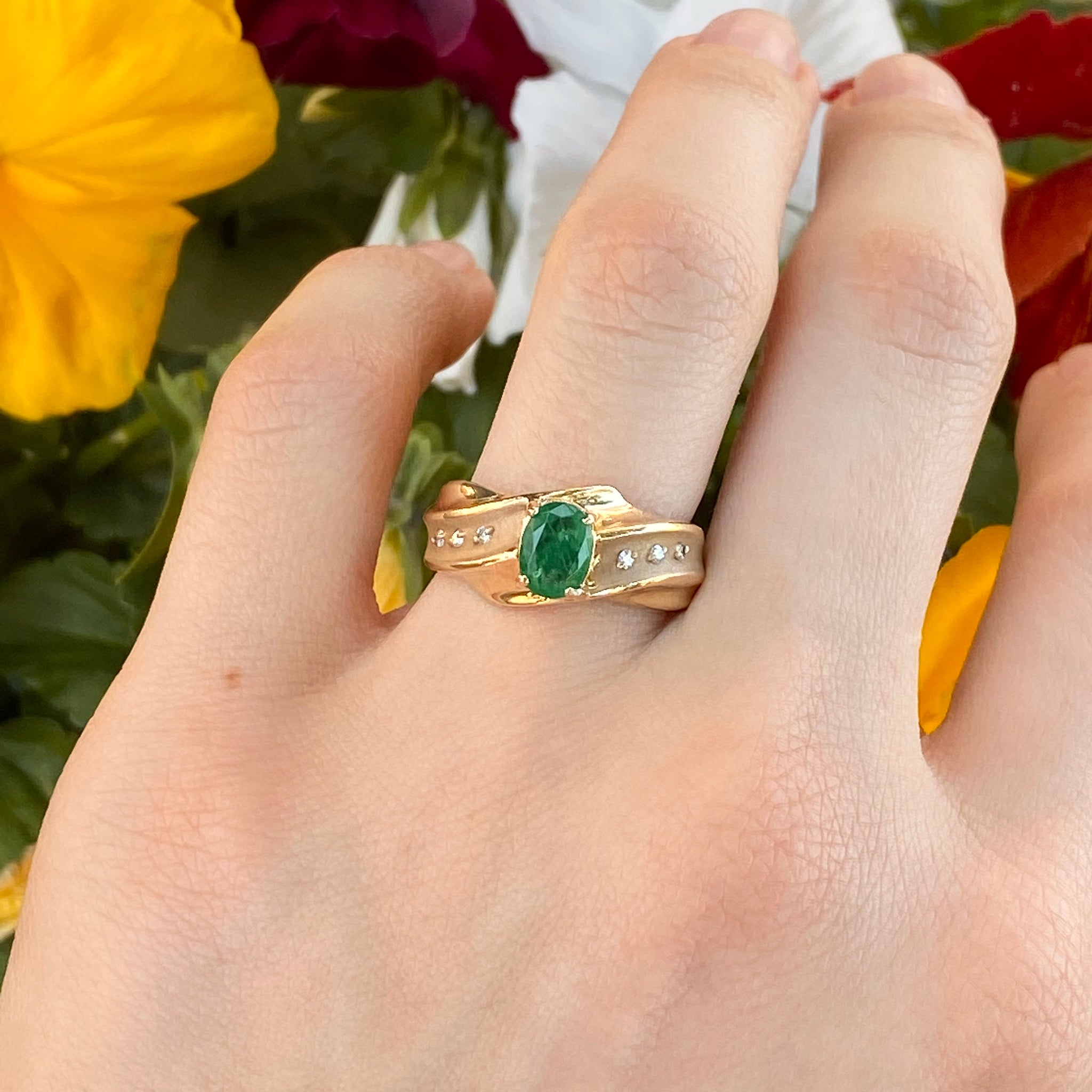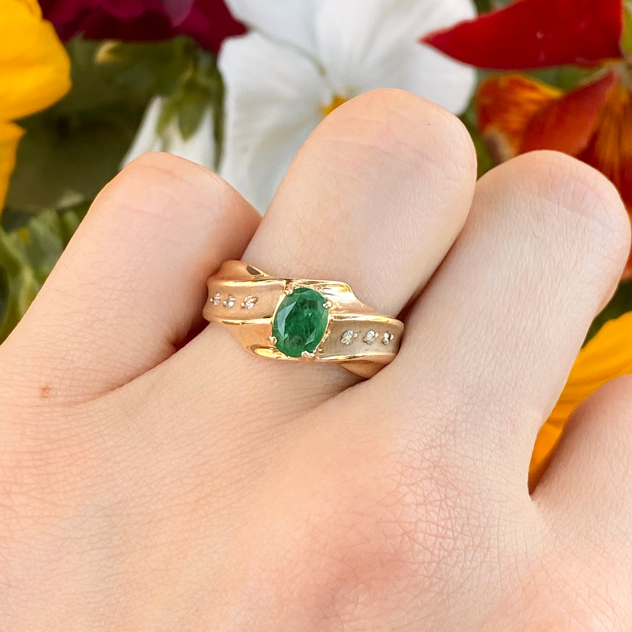 Estate/ vintage 14KT yellow gold oval-cut, genuine emerald + diamond ring. An interesting conversation piece with all the detail this baby has! The ideal gift for May babies.