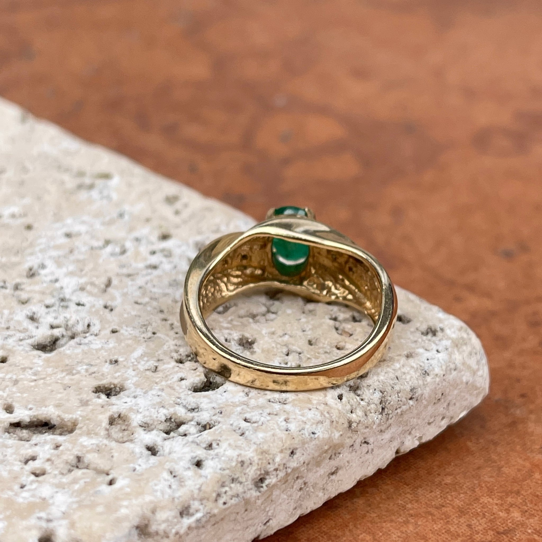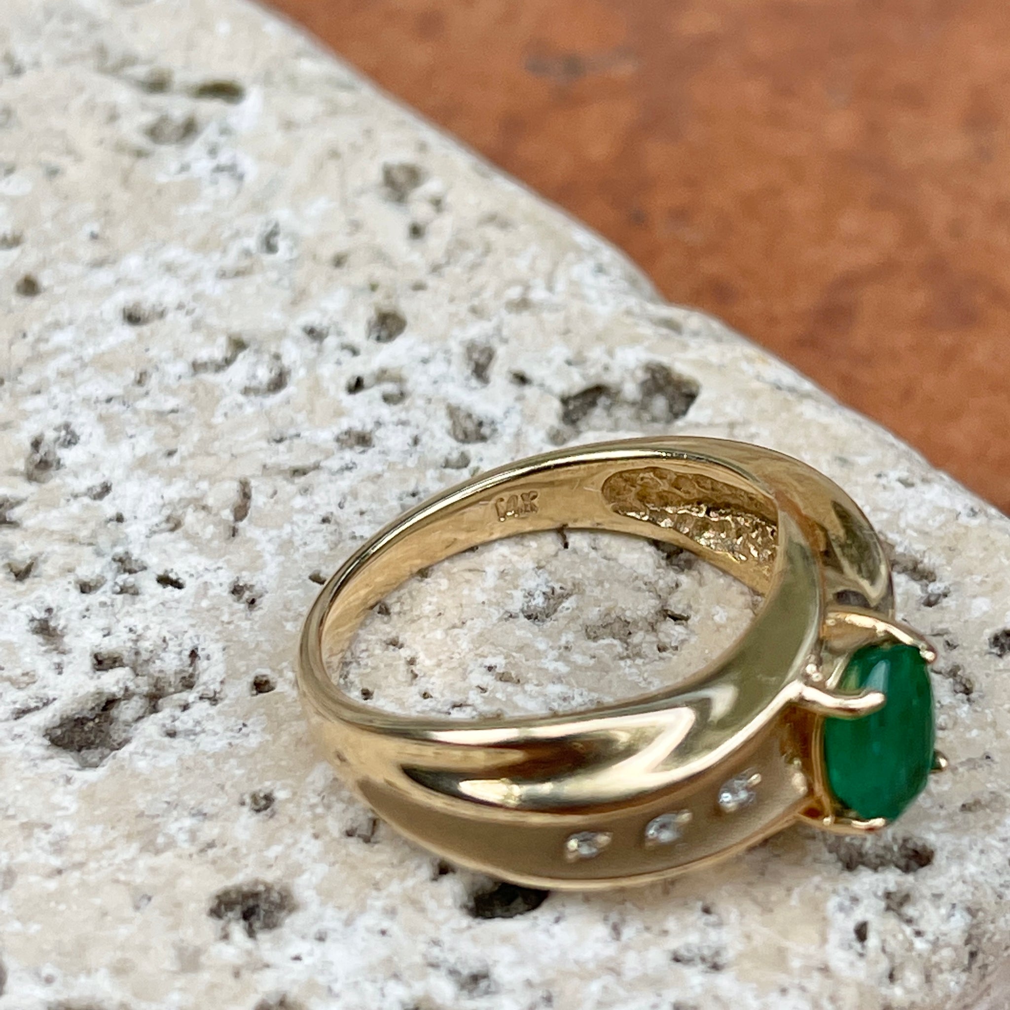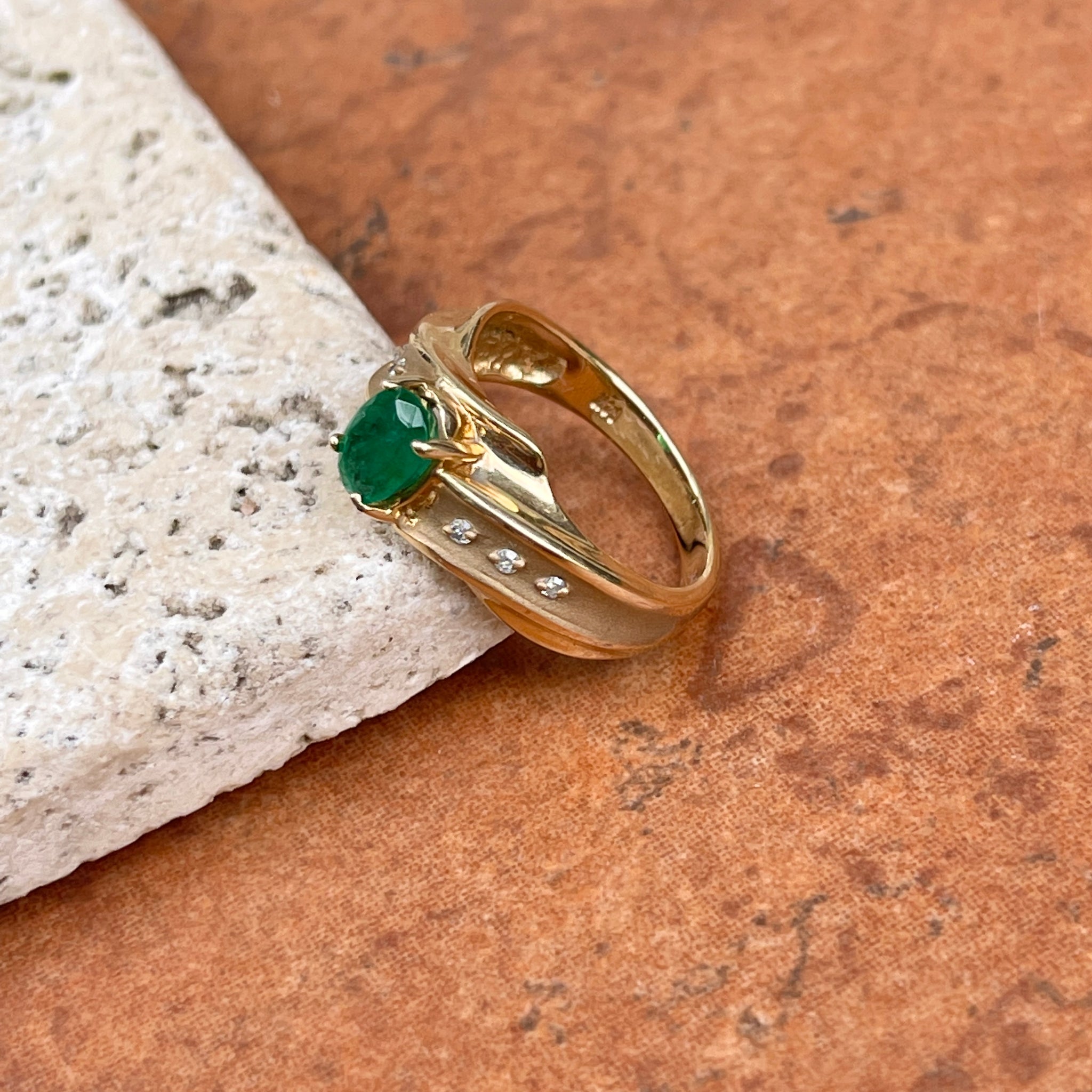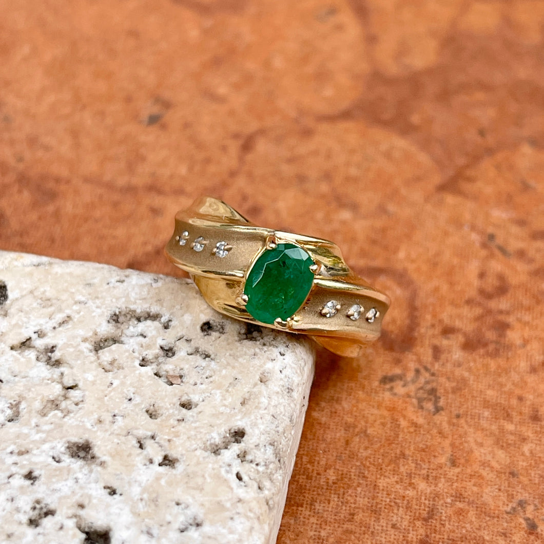 Estate 14KT Yellow Gold Matte Oval Emerald + Gypsy-Set Diamond Ring