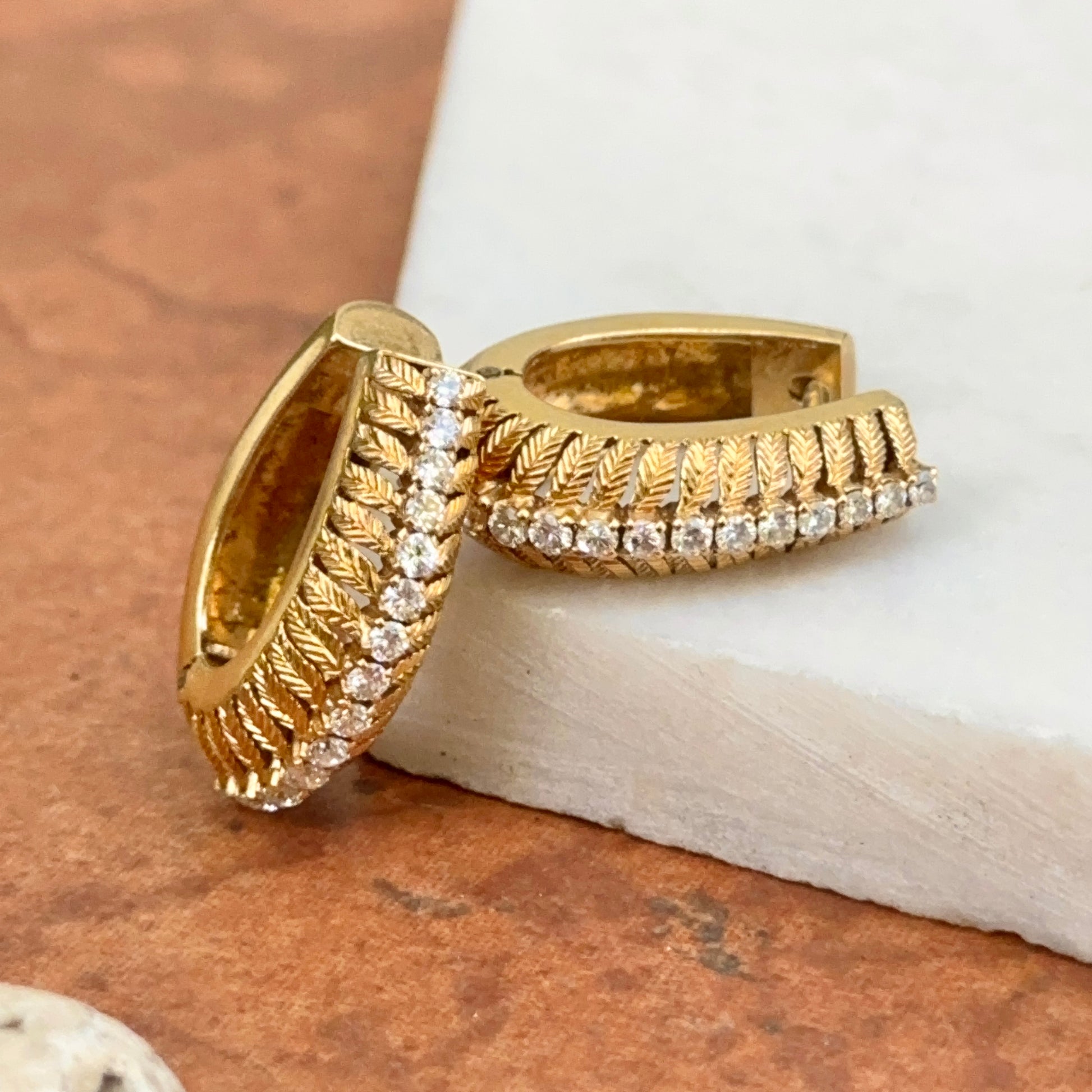 Estate 14KT Yellow Gold Mid Century Bark Matte & Diamond Oval Hoop Earrings