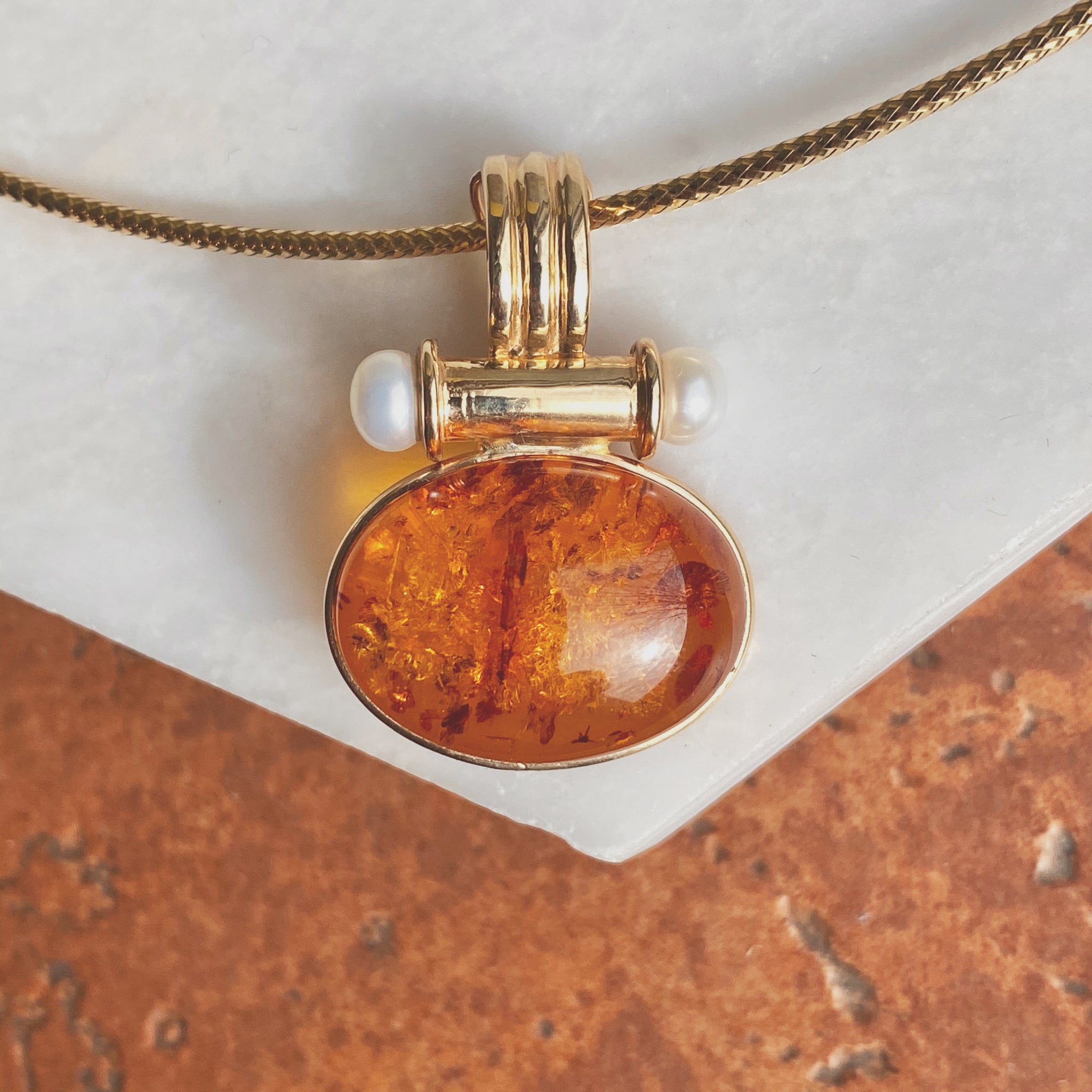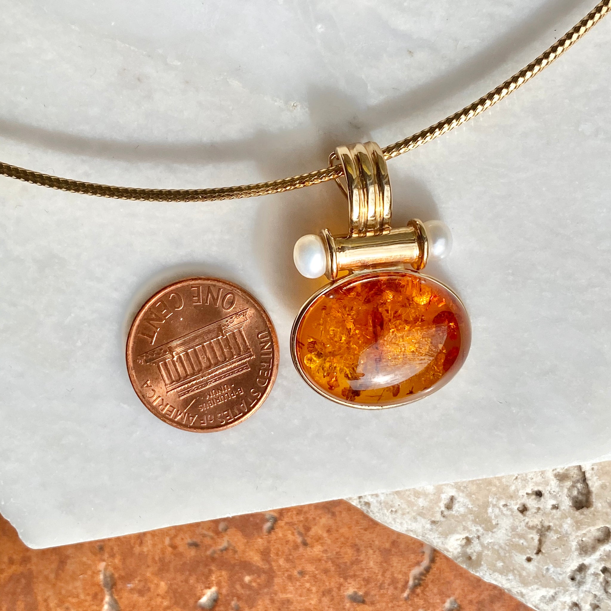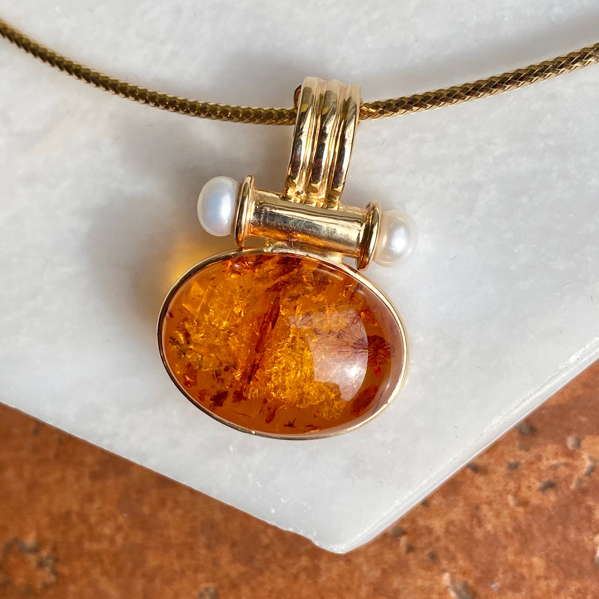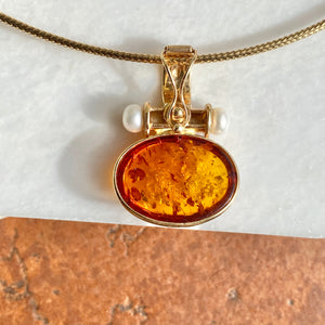 Estate 14KT Yellow Gold Oval Amber + Pearl Pendant Enhancer Omega Clip