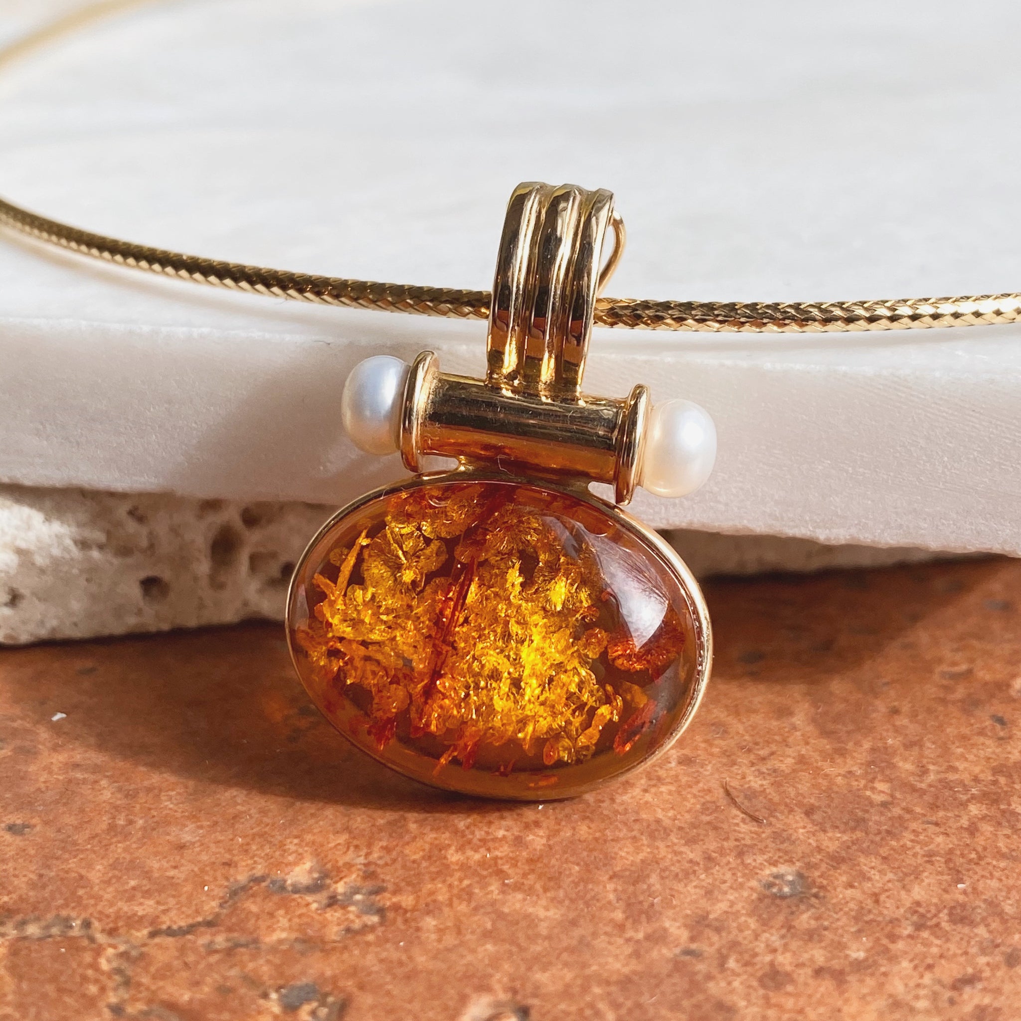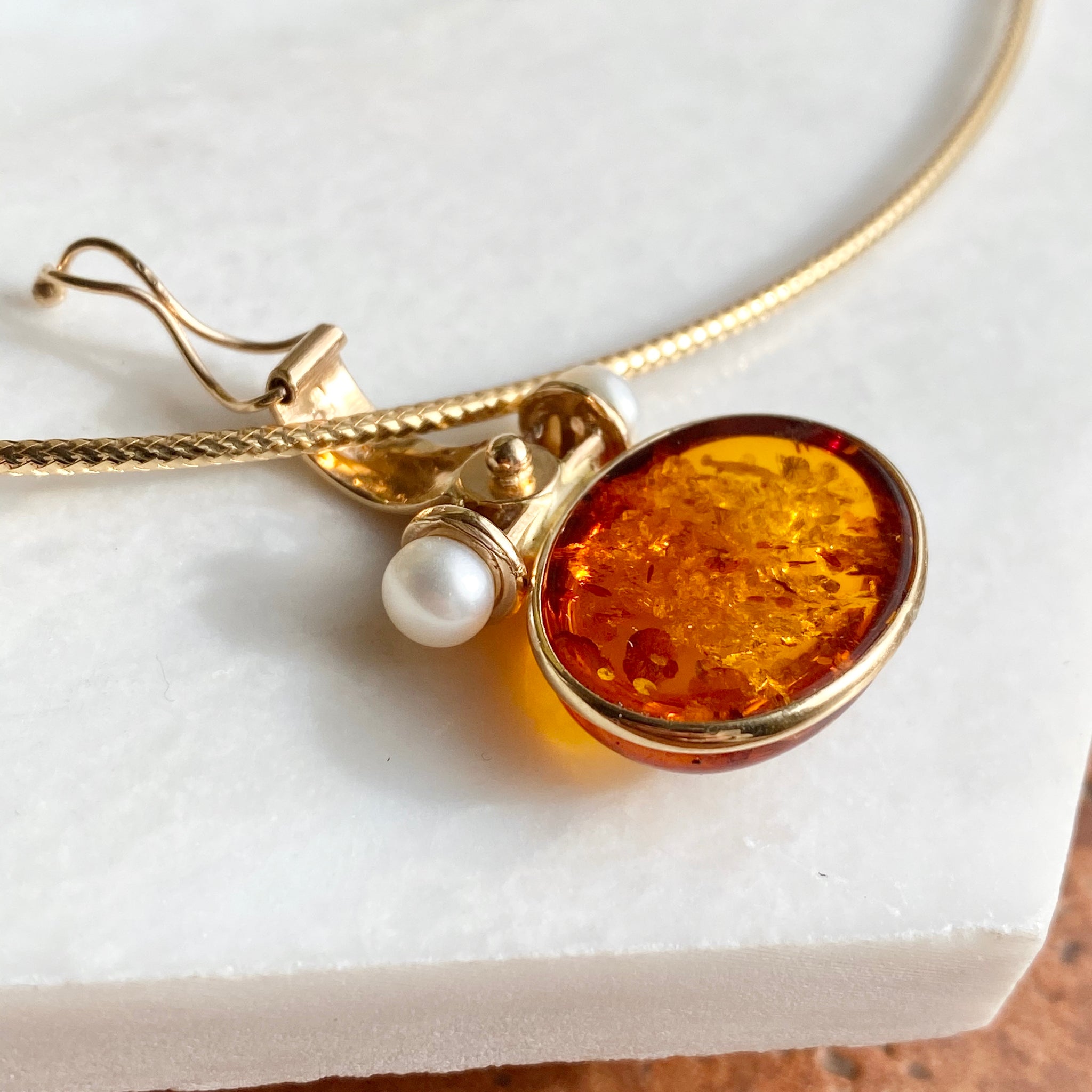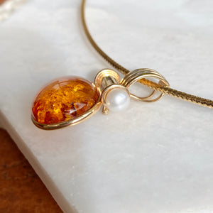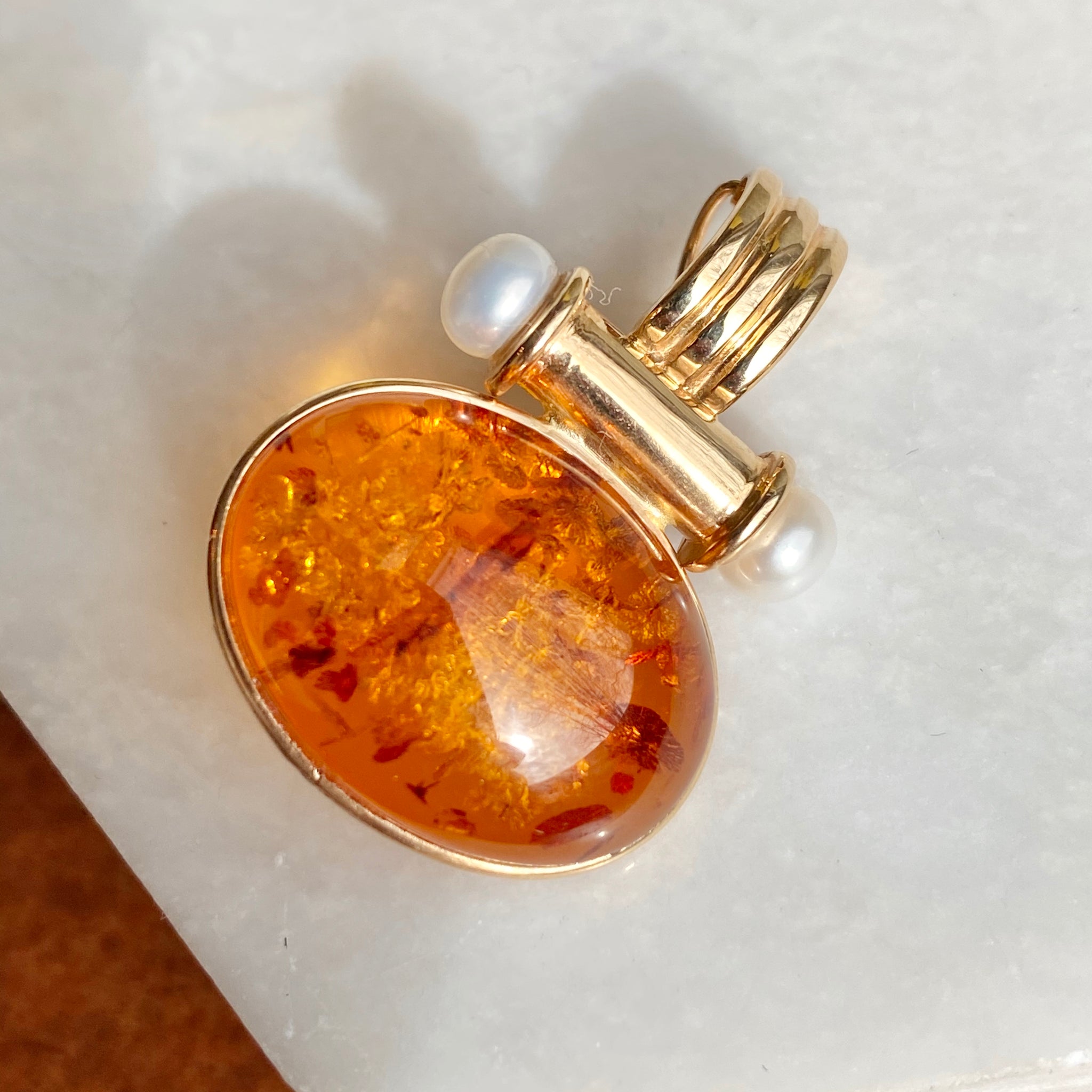 Estate 14KT Yellow Gold Oval Amber + Pearl Pendant Enhancer Omega Clip