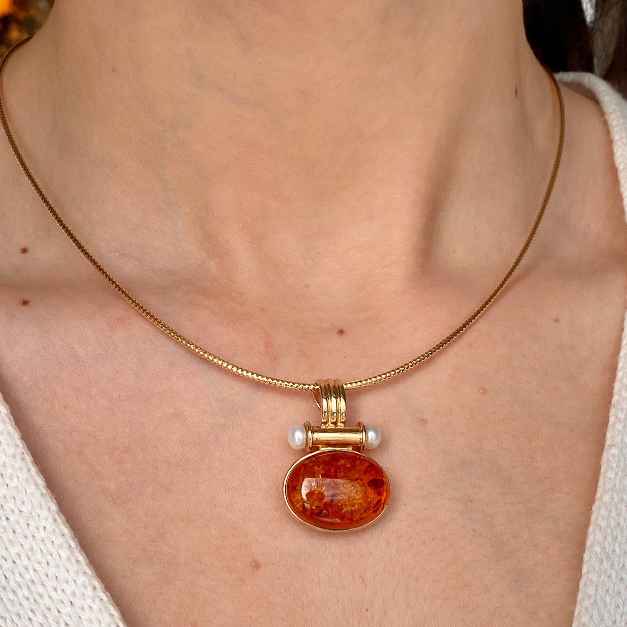 Estate/ vintage polished 14KT yellow gold oval, cabochon amber + white pearl pendant enhancer with omega clip. Stunning orange amber with two white, natural pearls. Easy to use omega clip for clipping on neck wire, in between pearls, etc. Necklace chain shown in pictures is sold separately.