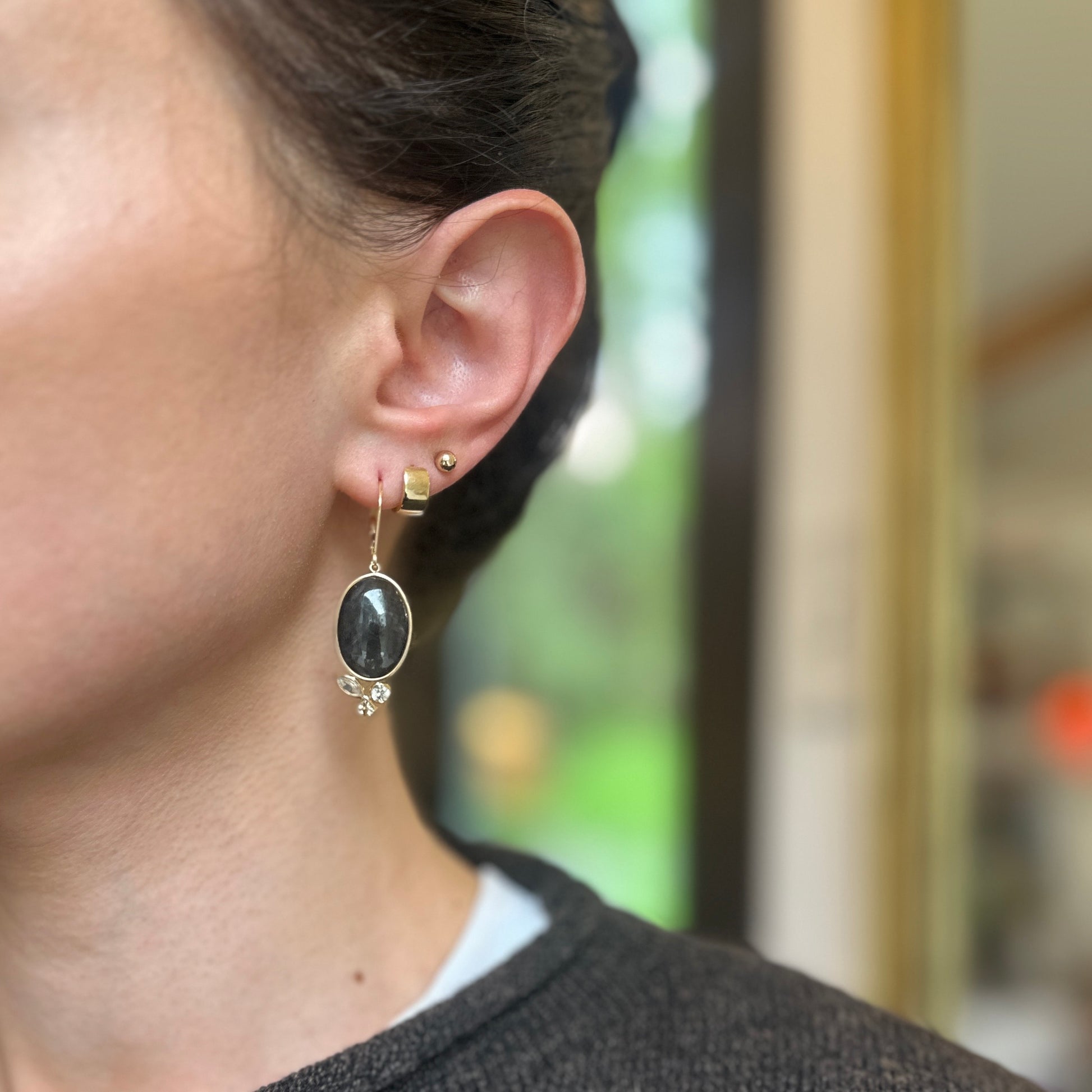 Estate 14KT Yellow Gold Oval Cabochon Dark Sapphire + White Sapphire Earrings