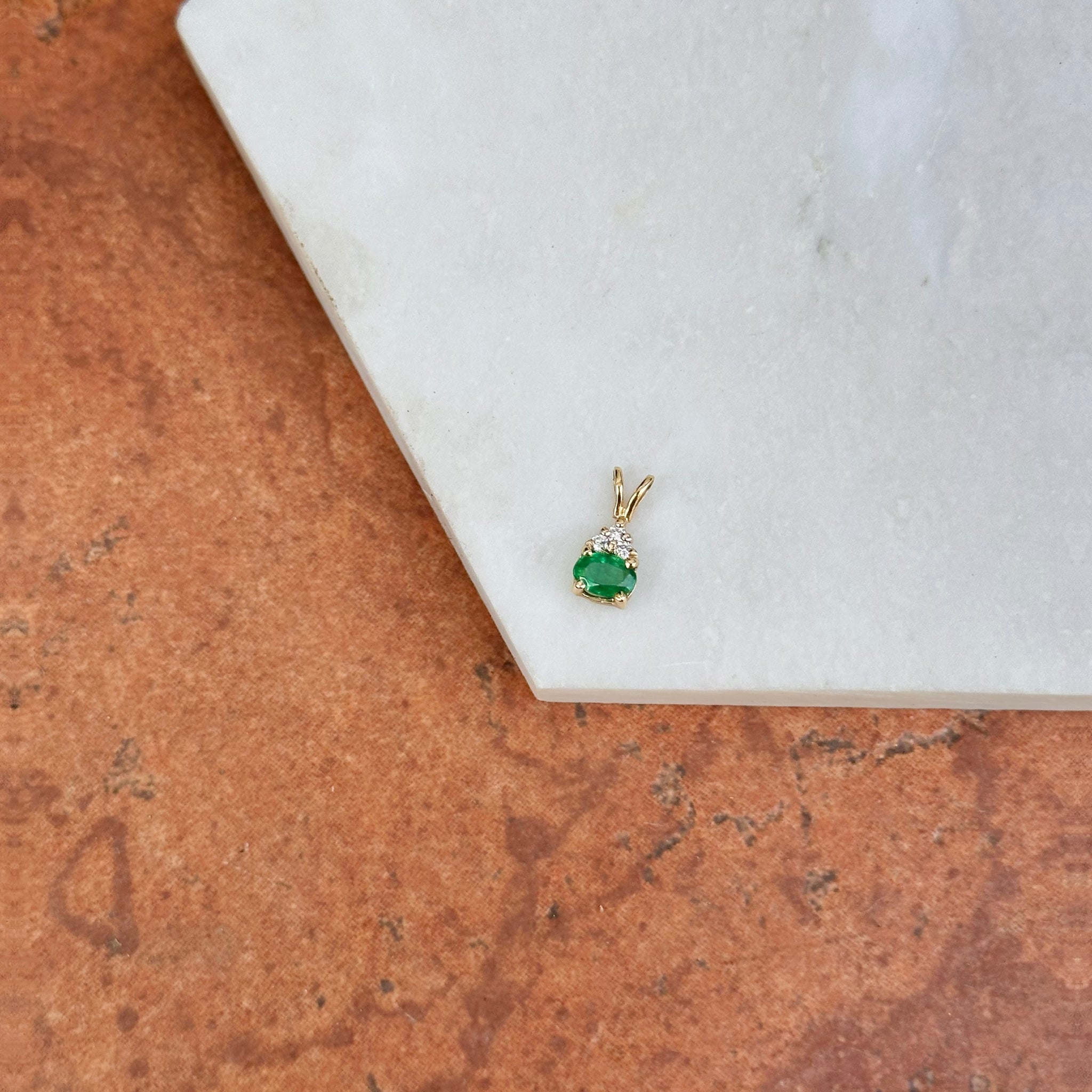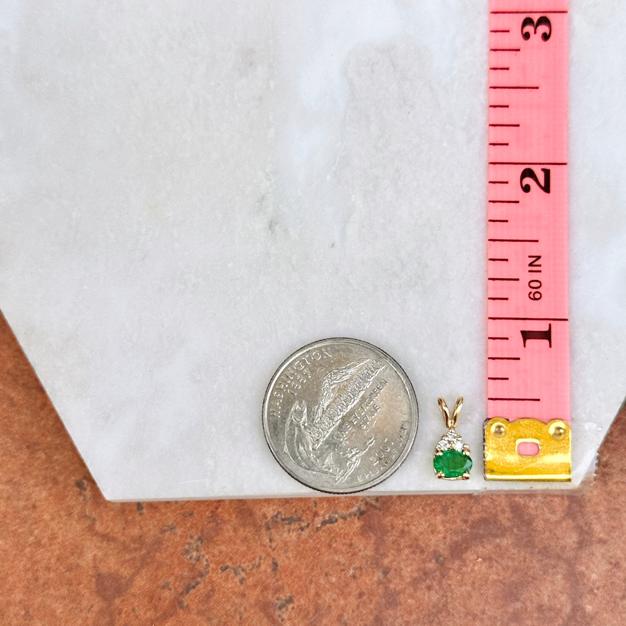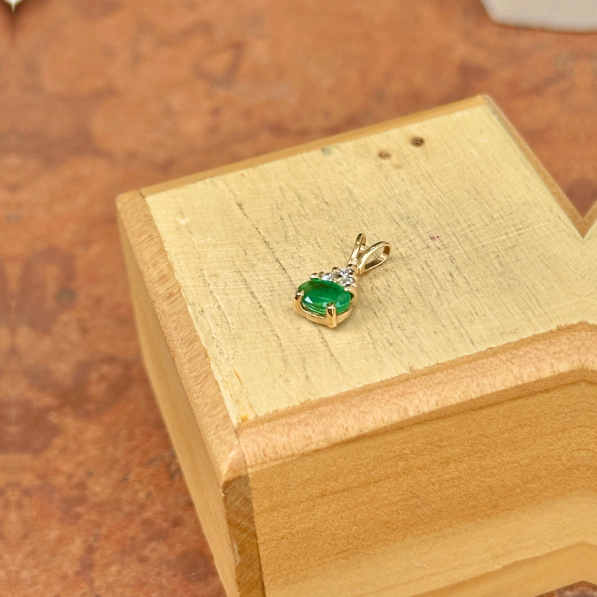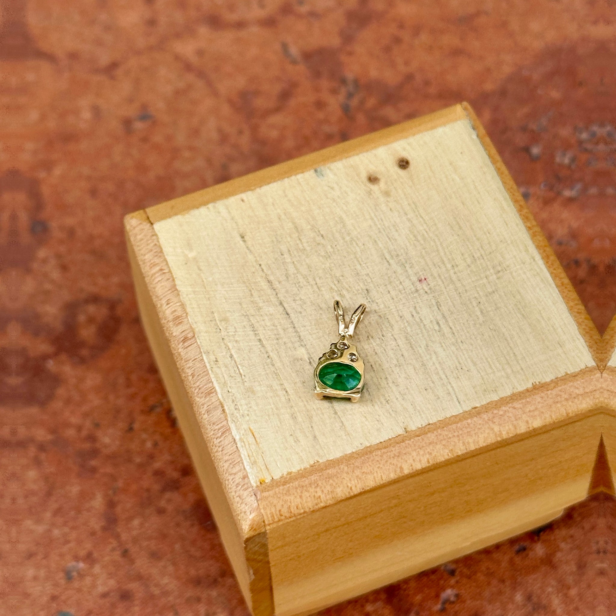 14KT yellow gold oval-cut, emerald + diamond drop pendant. New, but old stock jewelry from a premiere Minneapolis jeweler. Stunning, green, high-quality emerald!