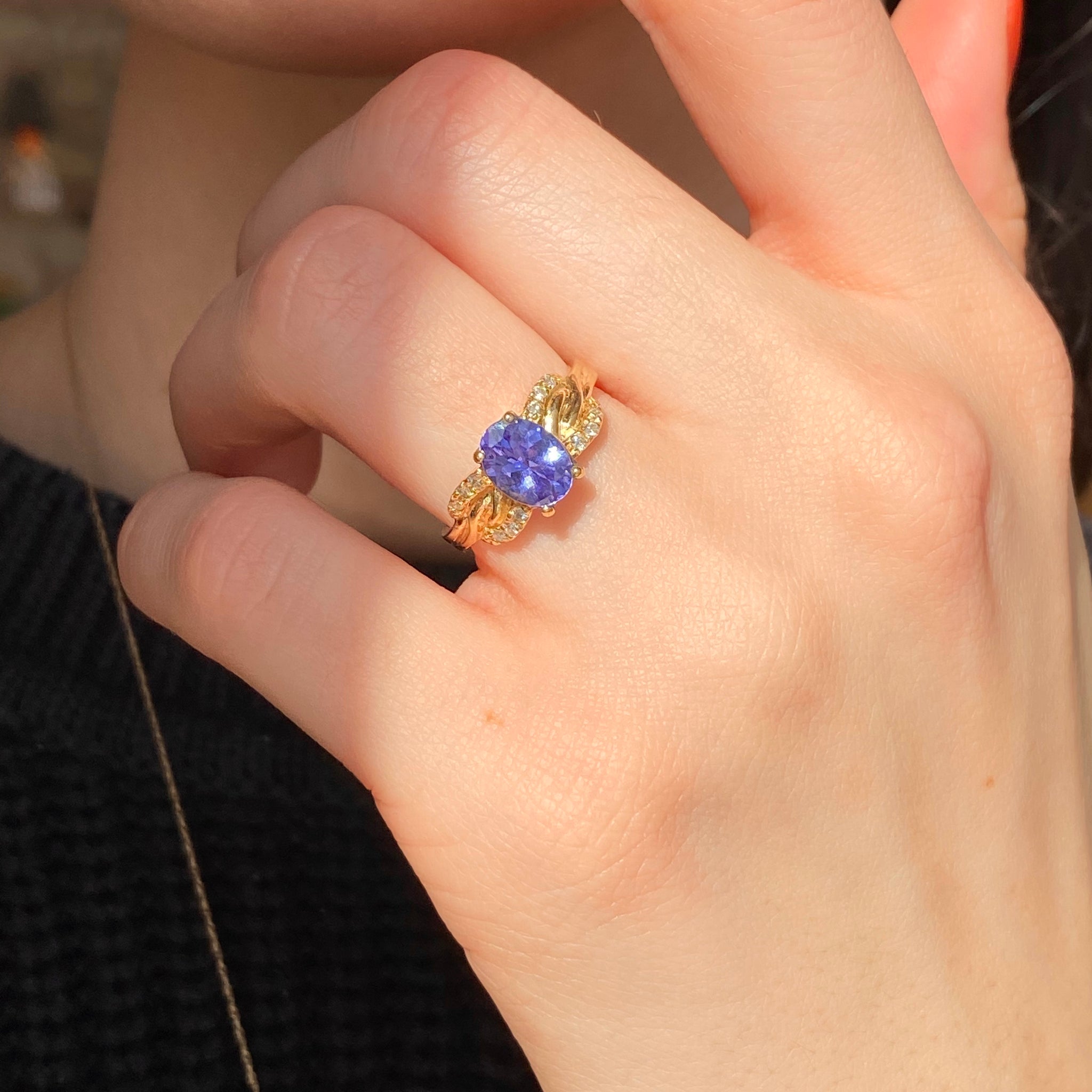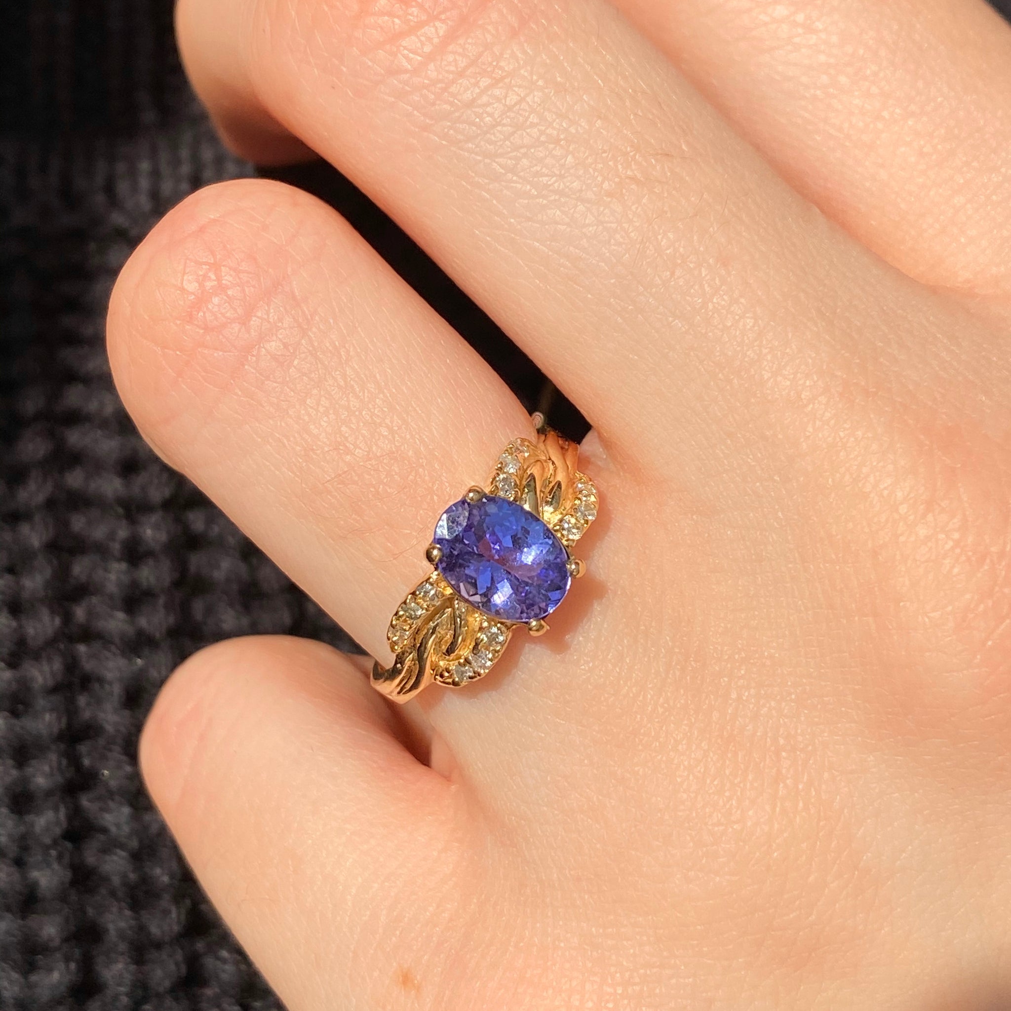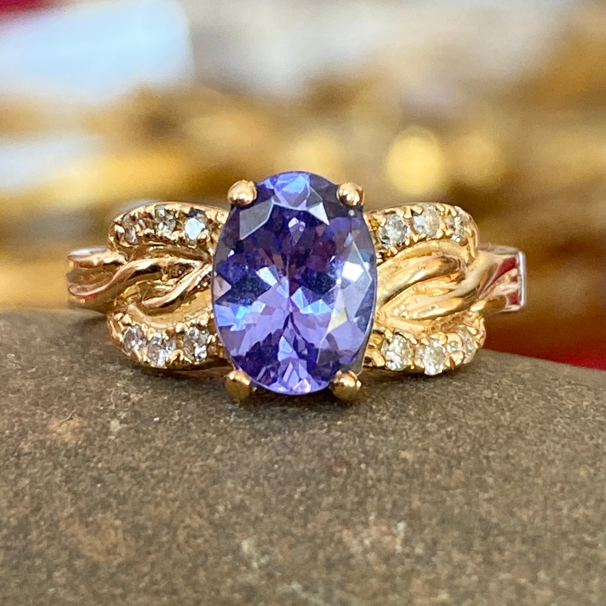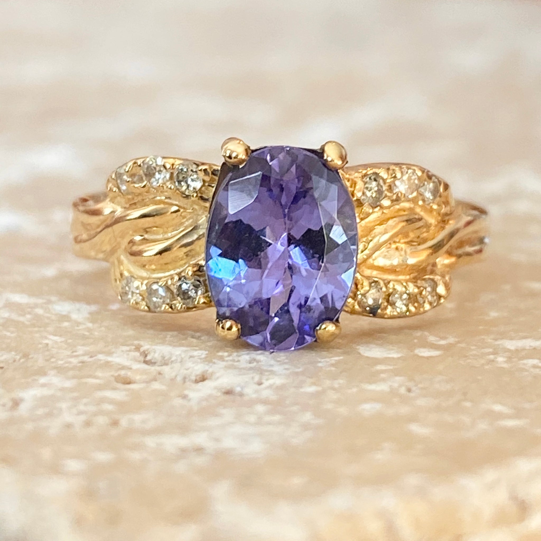 Stunning estate/vintage 14KT yellow gold oval tanzanite + diamond detailed ring. The color of this tanzanite is mesmerizing and you won't be able to keep your eyes off it!