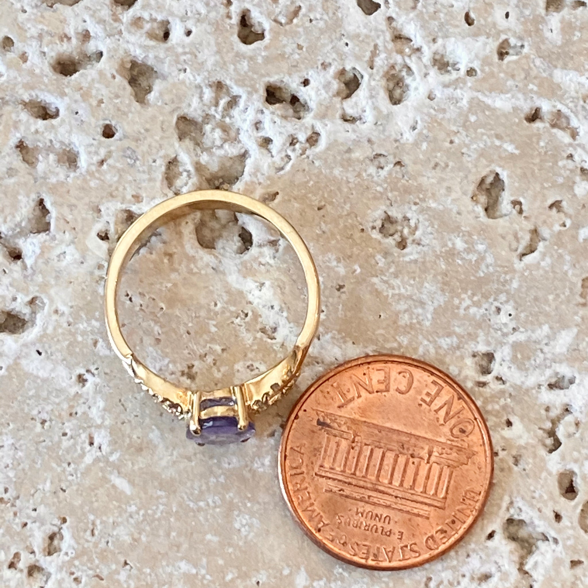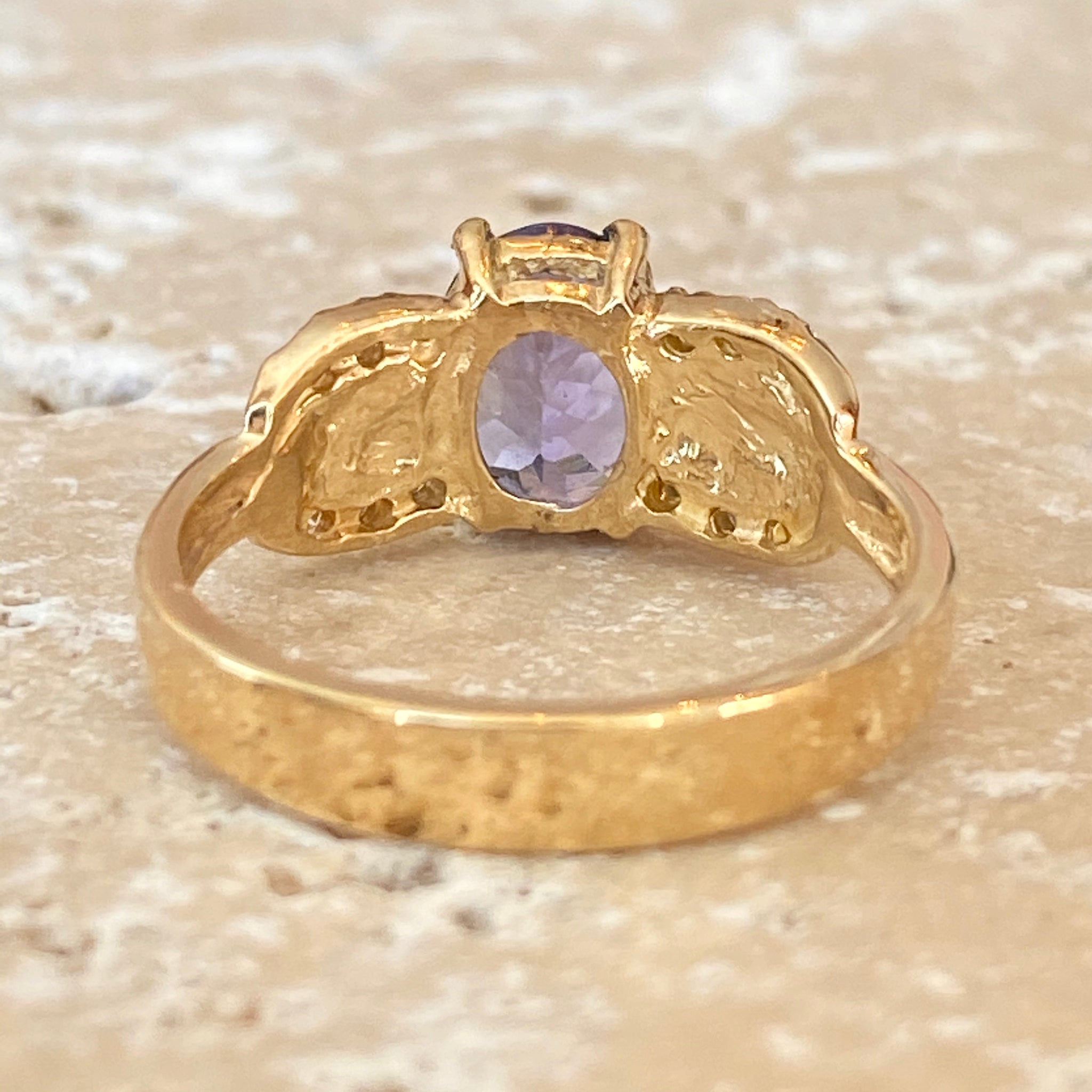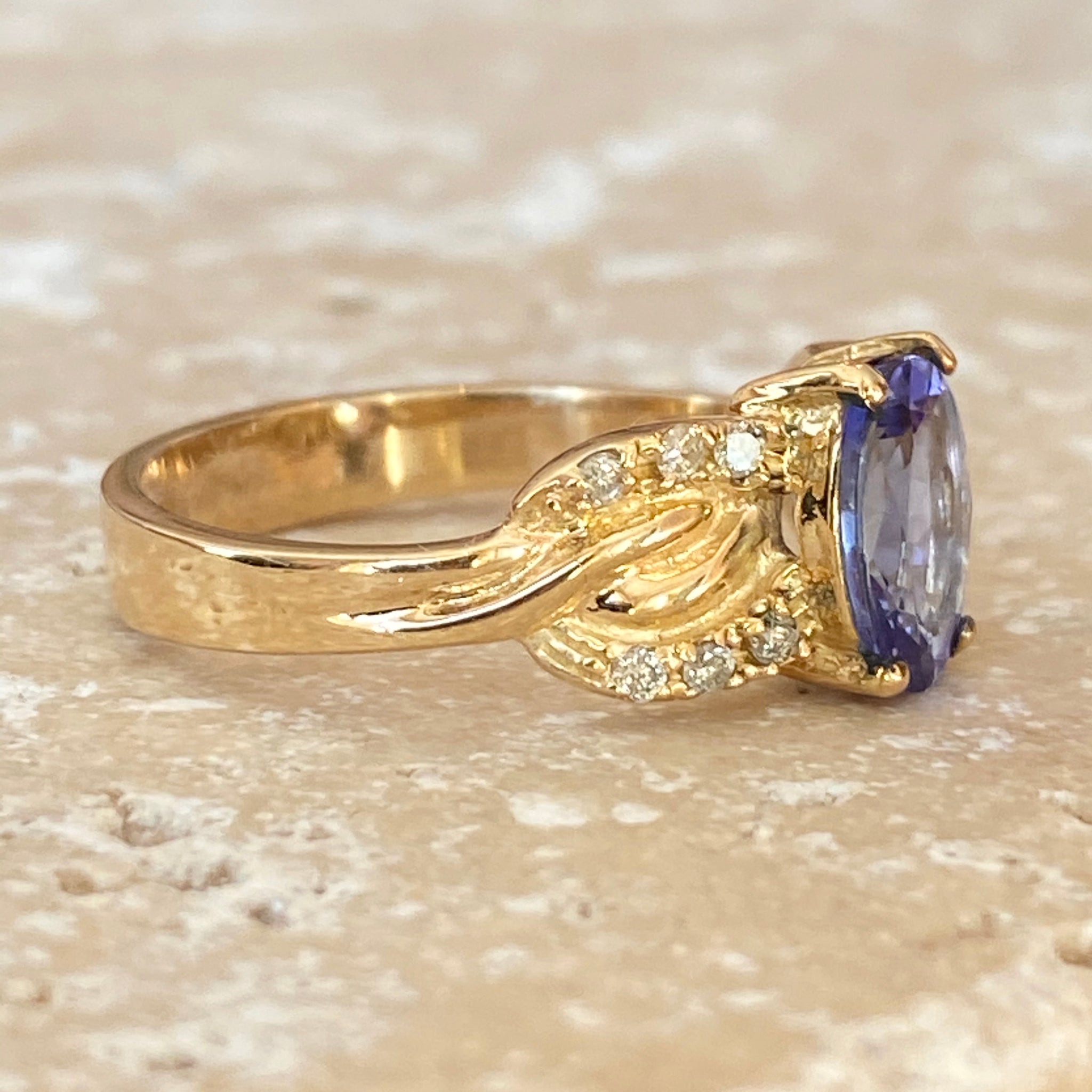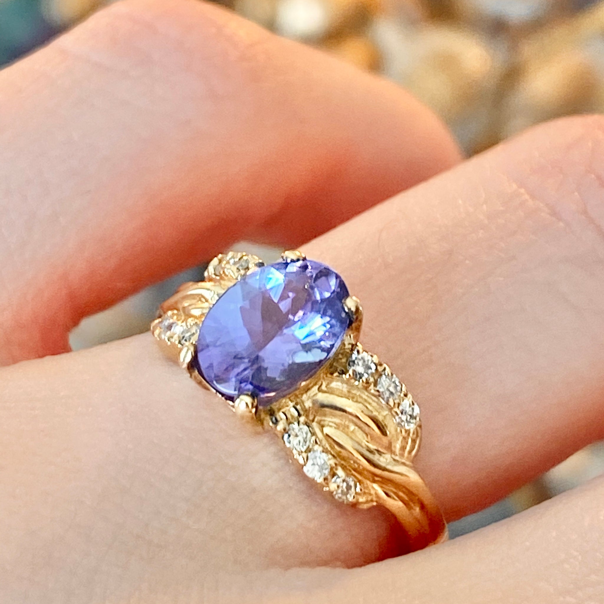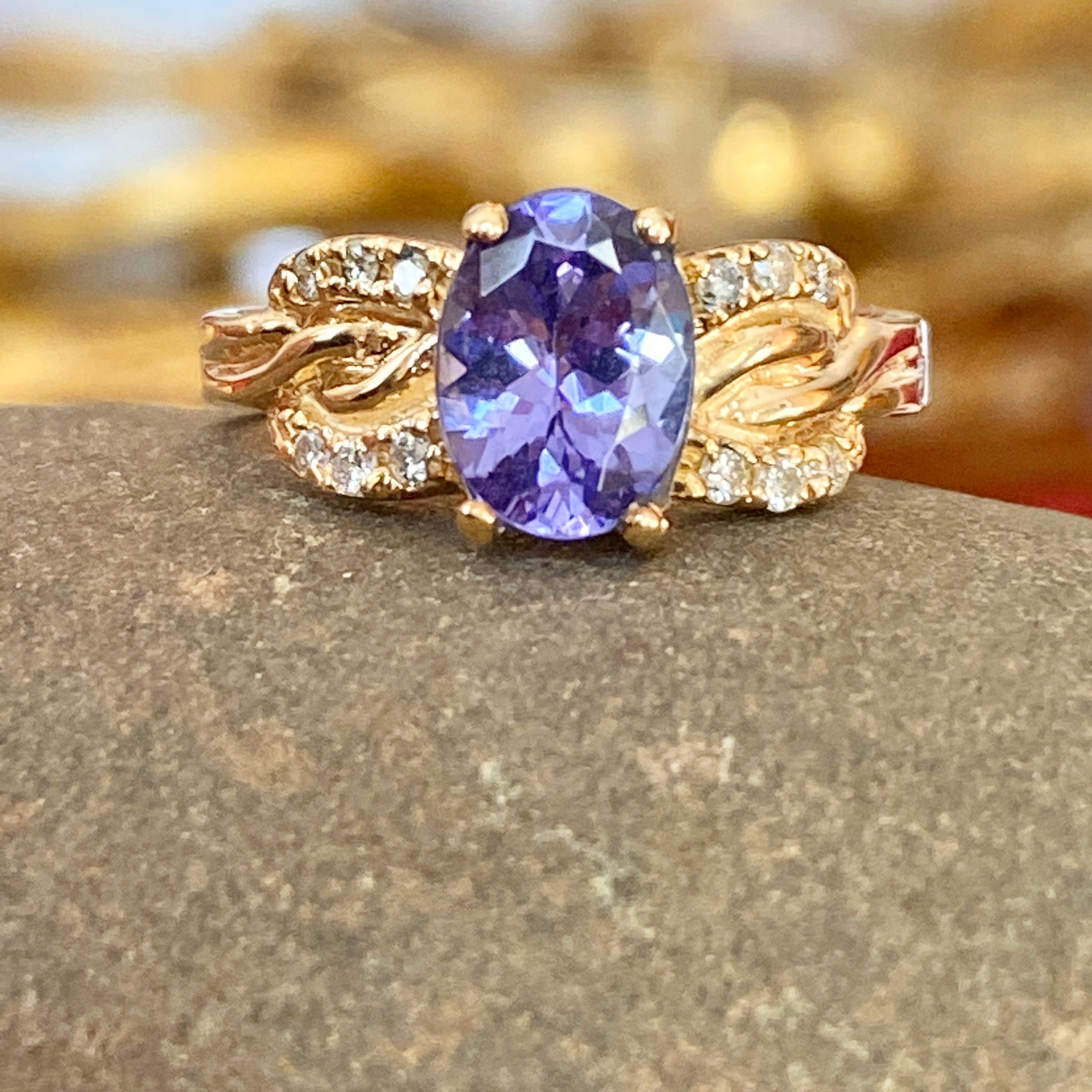 Stunning estate/vintage 14KT yellow gold oval tanzanite + diamond detailed ring. The color of this tanzanite is mesmerizing and you won't be able to keep your eyes off it!