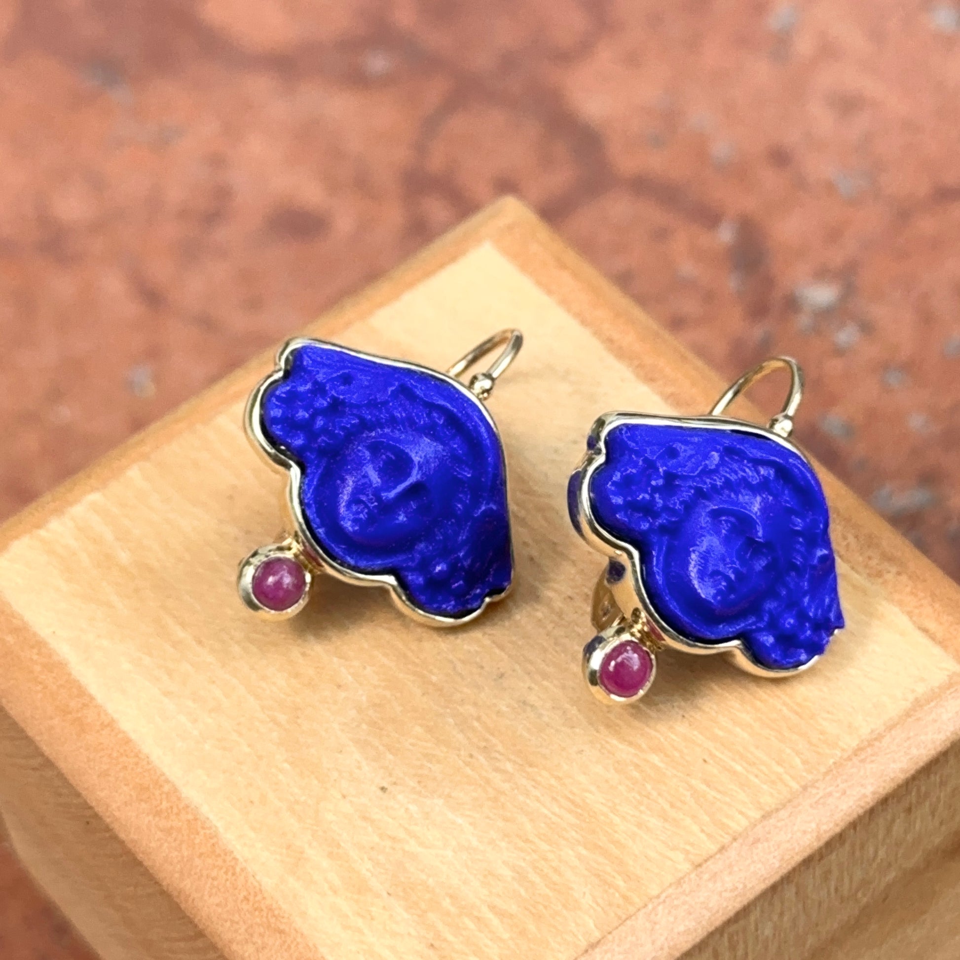 Estate/ Vintage, but LIKE NEW 14KT Yellow Gold Hinged Lever-back Shiny Detailed Italian Carved Blue Lapis Medusa Earrings with Rubies
