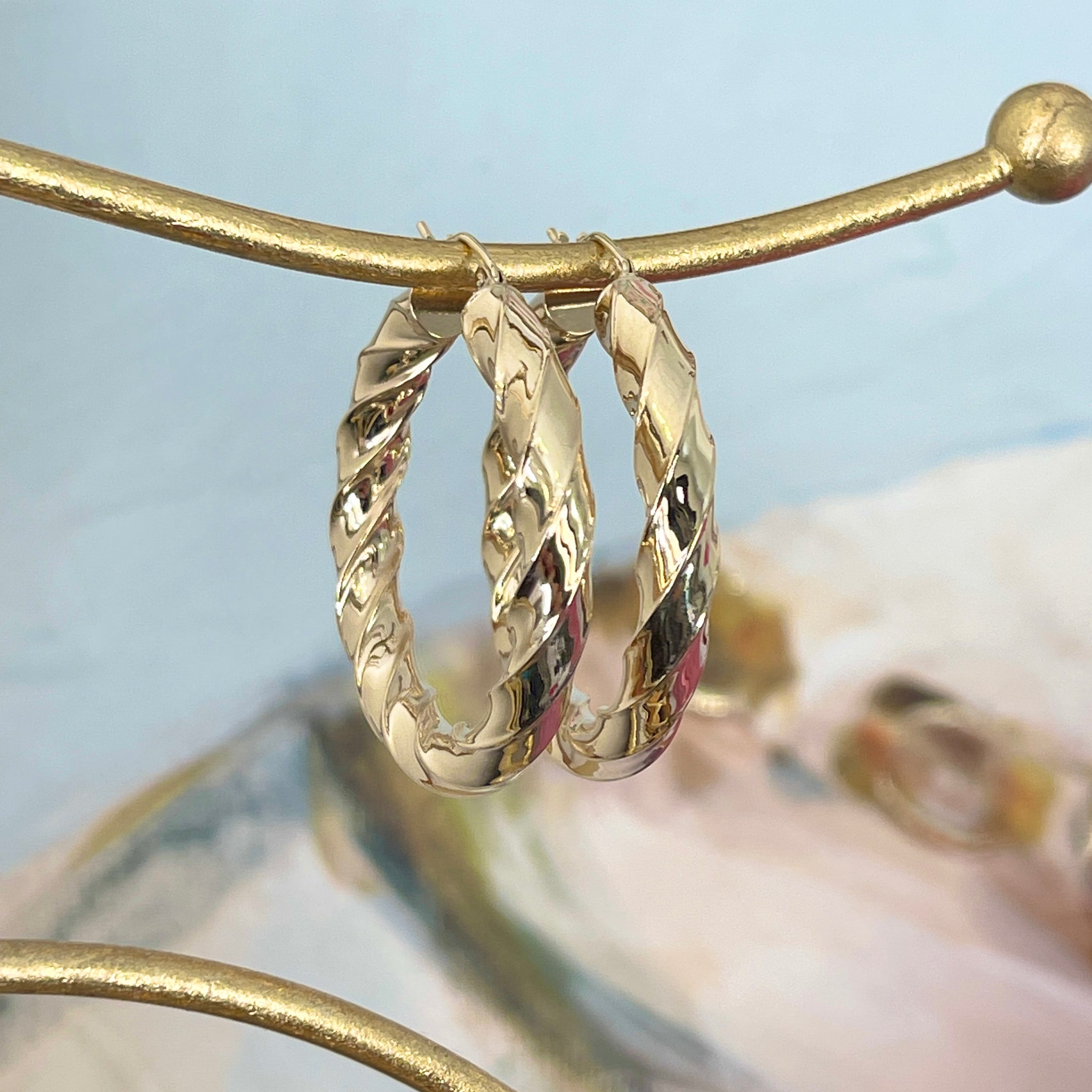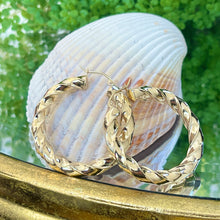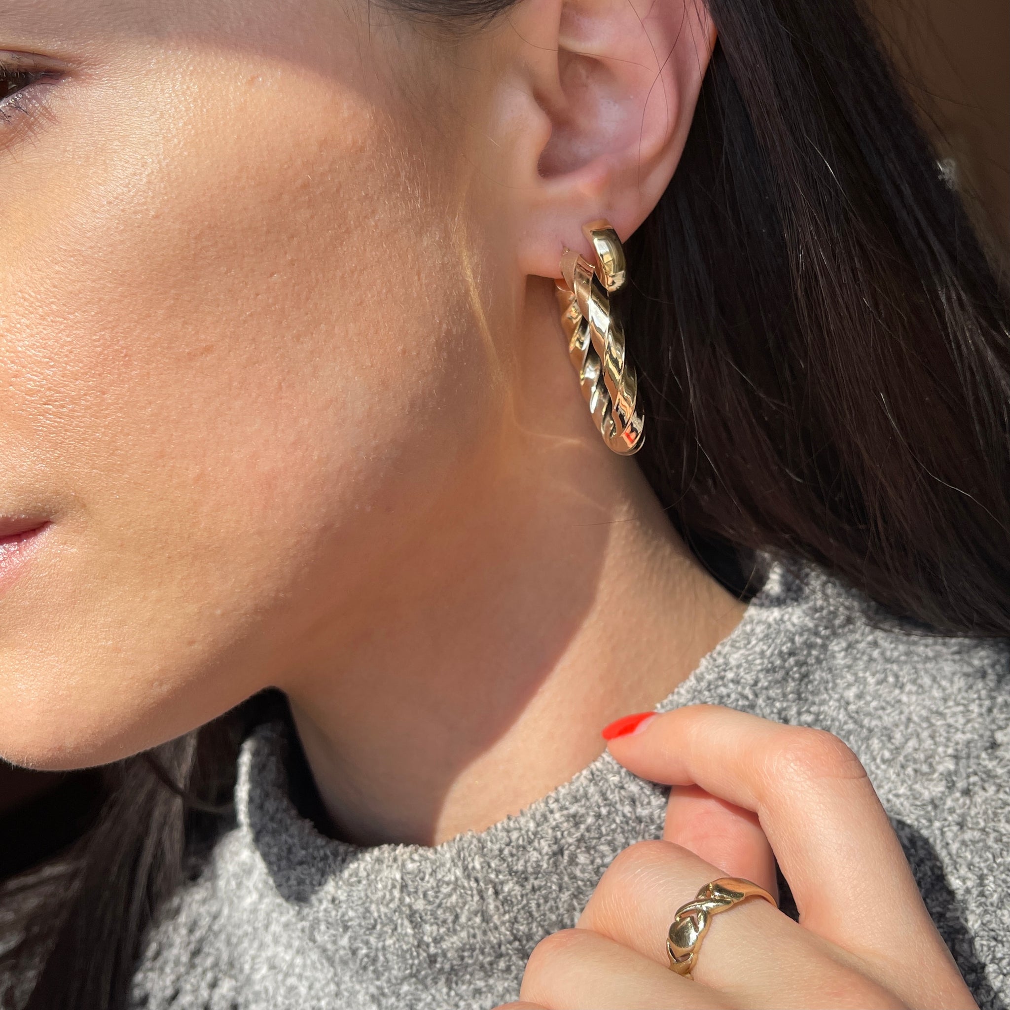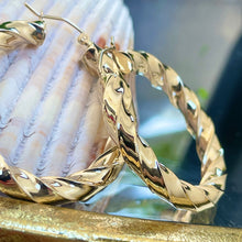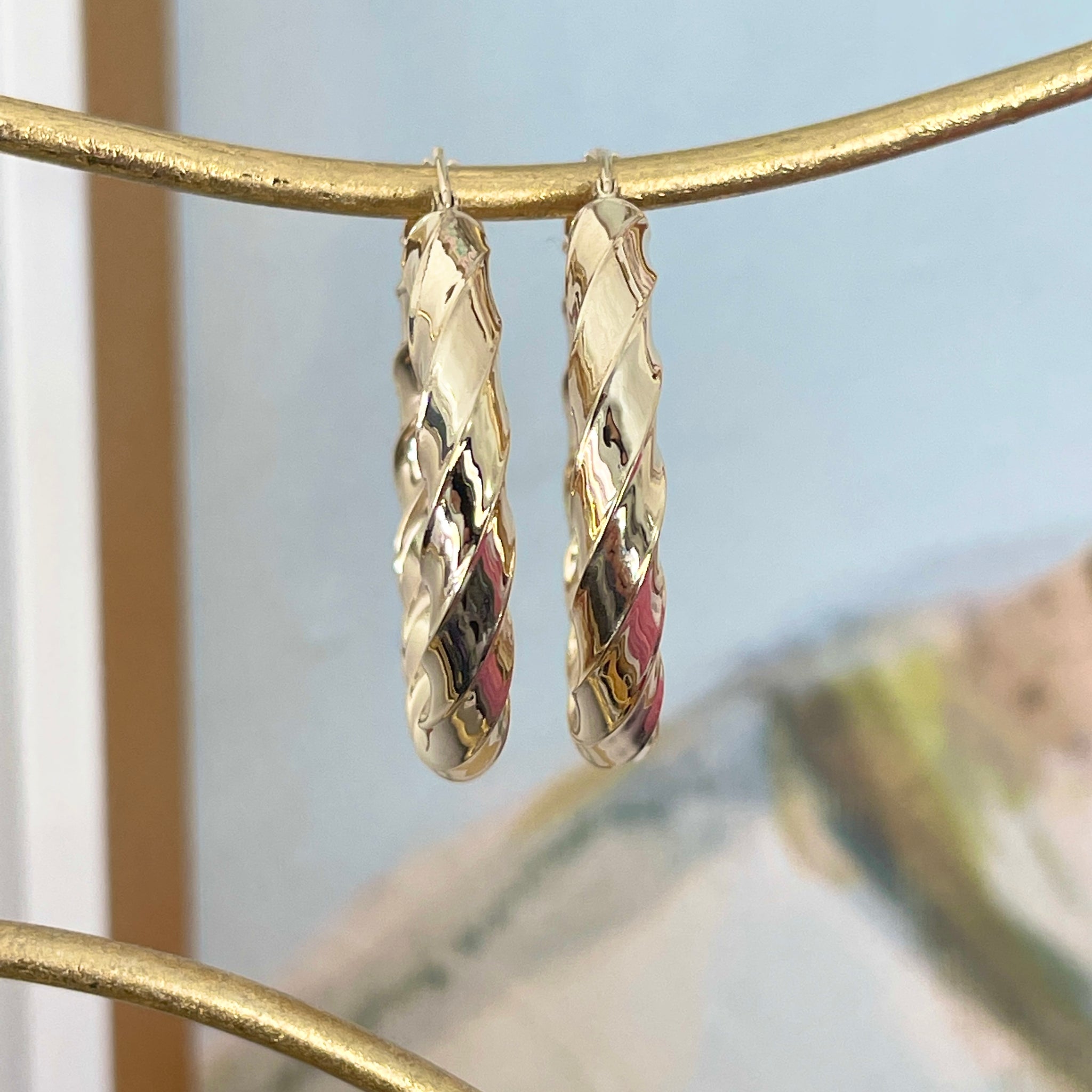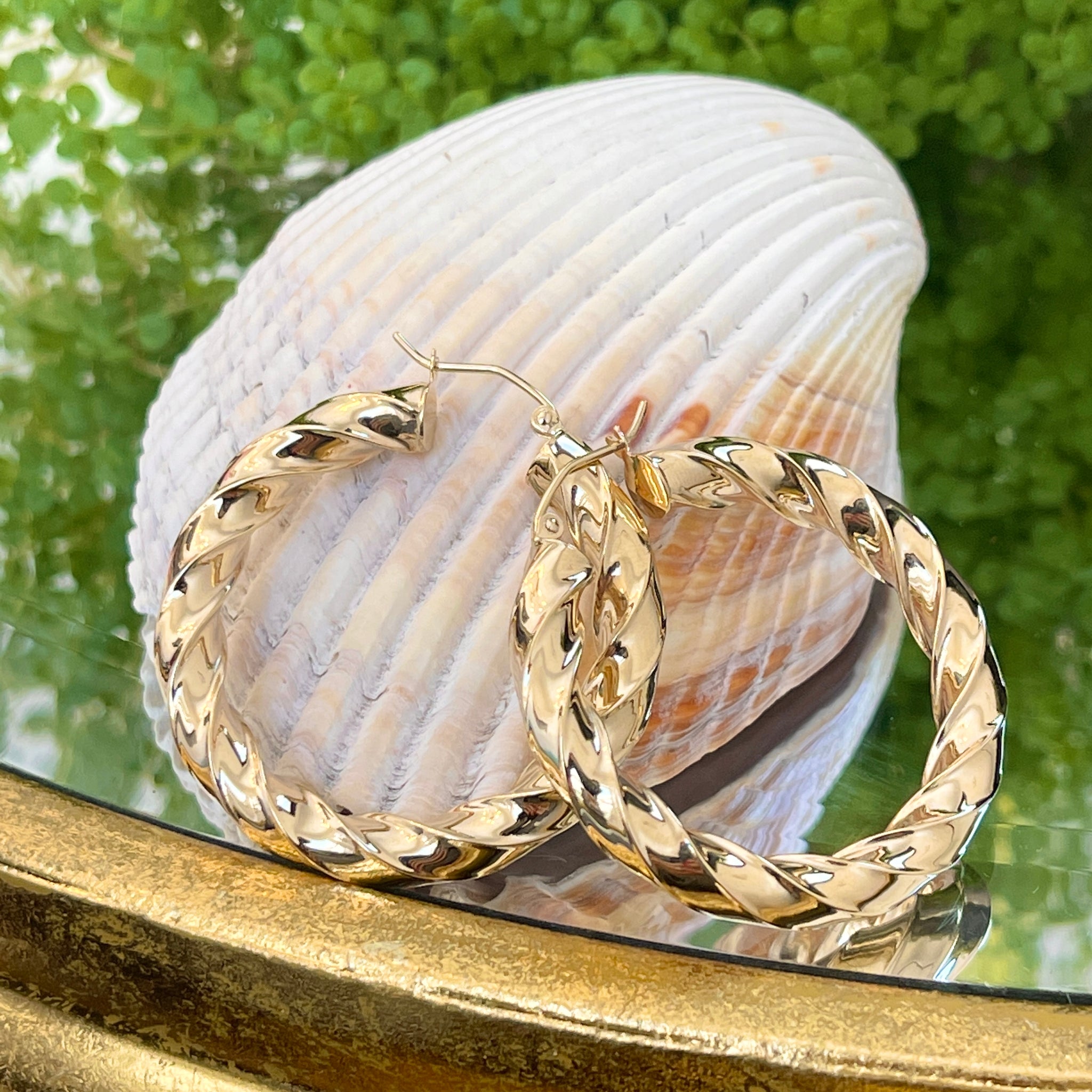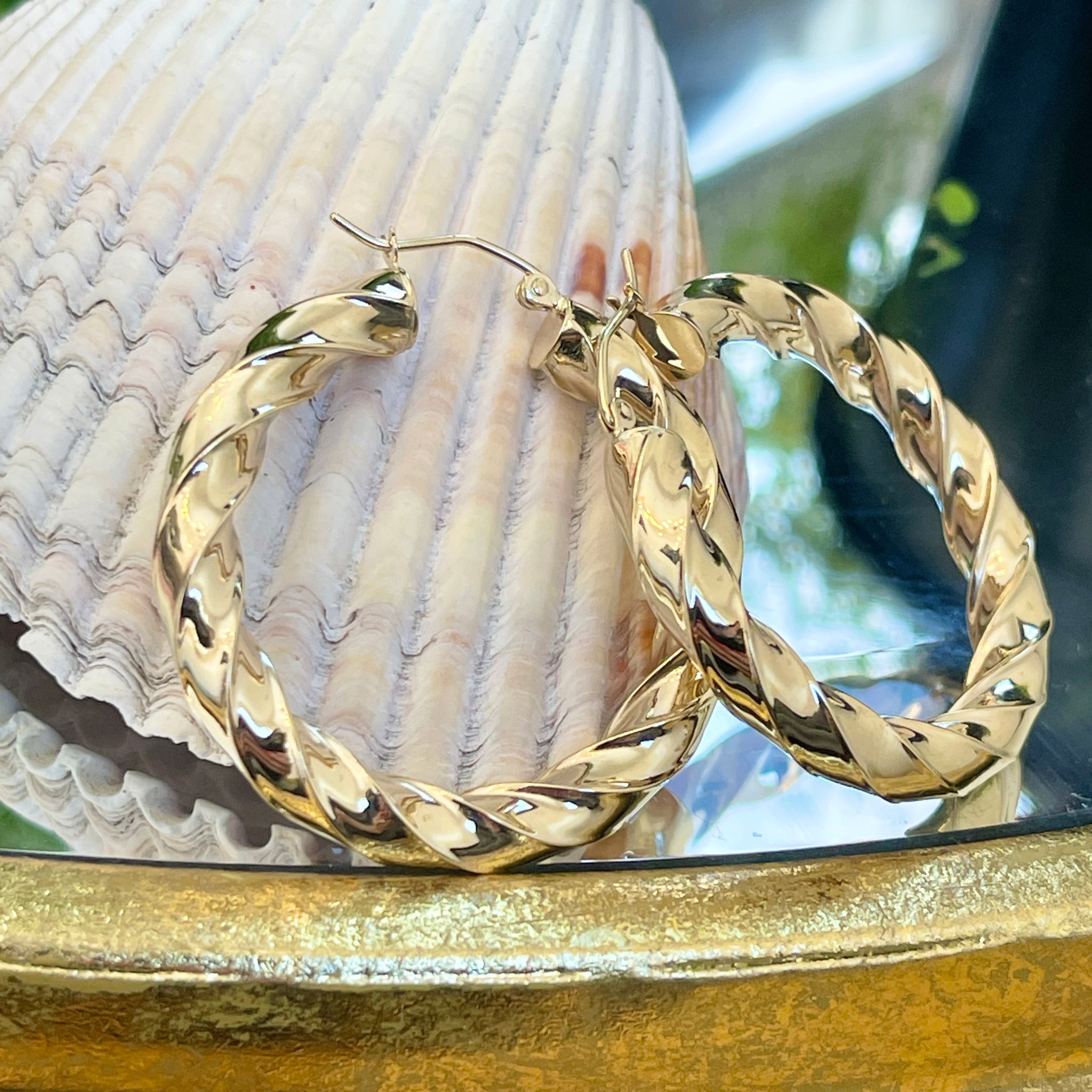 Estate/ vintage 14KT yellow gold round, 3D, twist design hoop earrings. Stunning, large statement hoop earrings with unique twisted design!