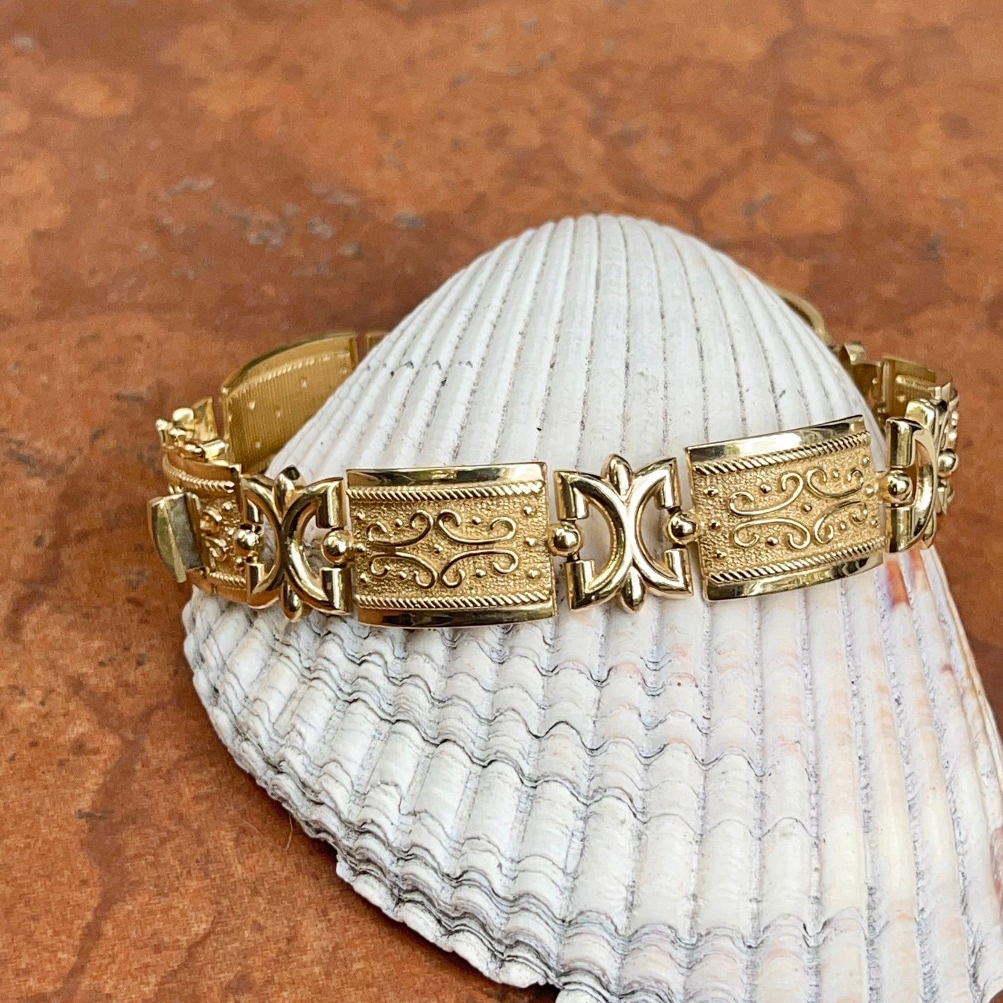 Estate/ vintage 14KT yellow gold Byzantine/ Etruscan design rectangle links bracelet. With matte and shiny finished, this piece stands out on the wrist.