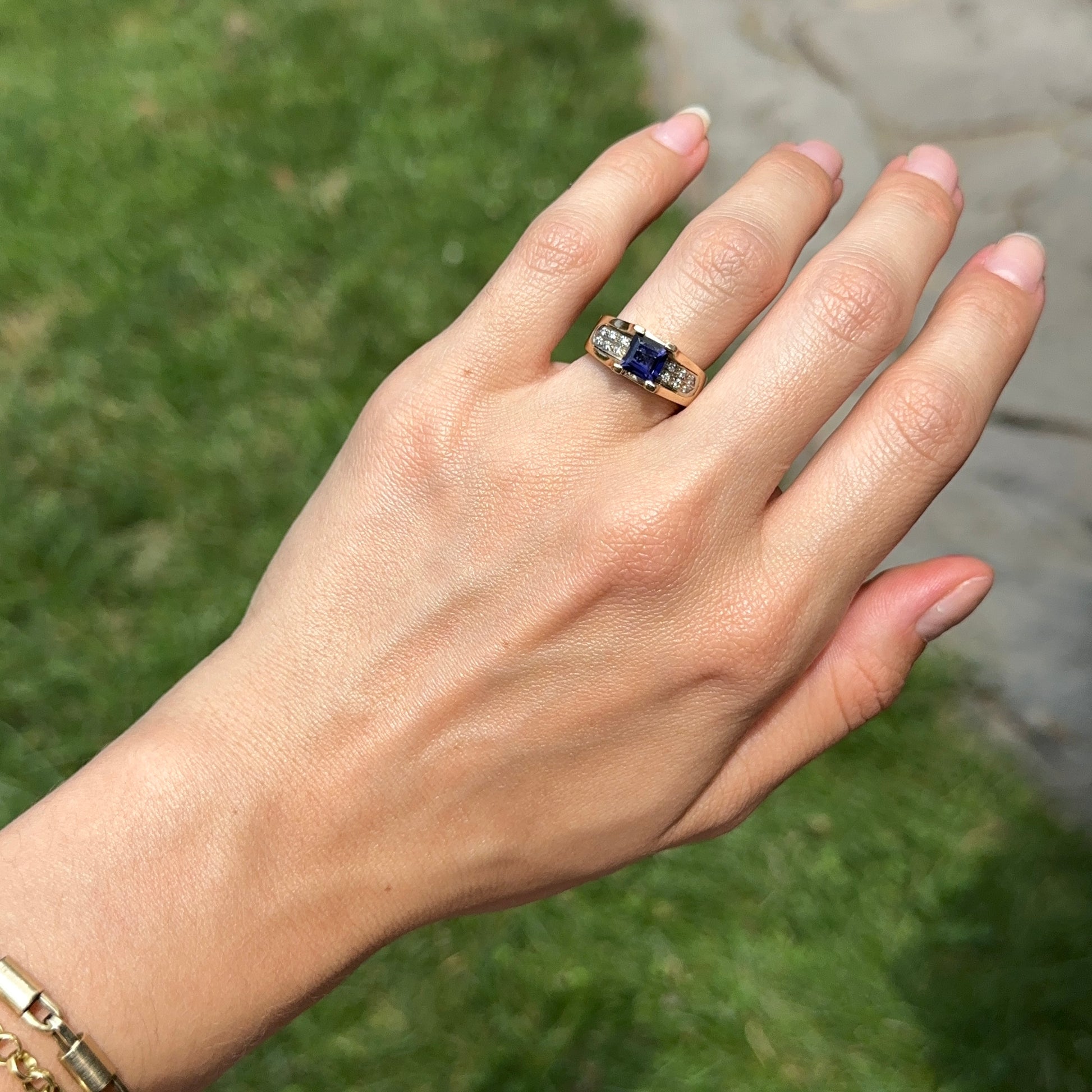 Estate 14KT Yellow Gold Square Iolite + Diamond Ring