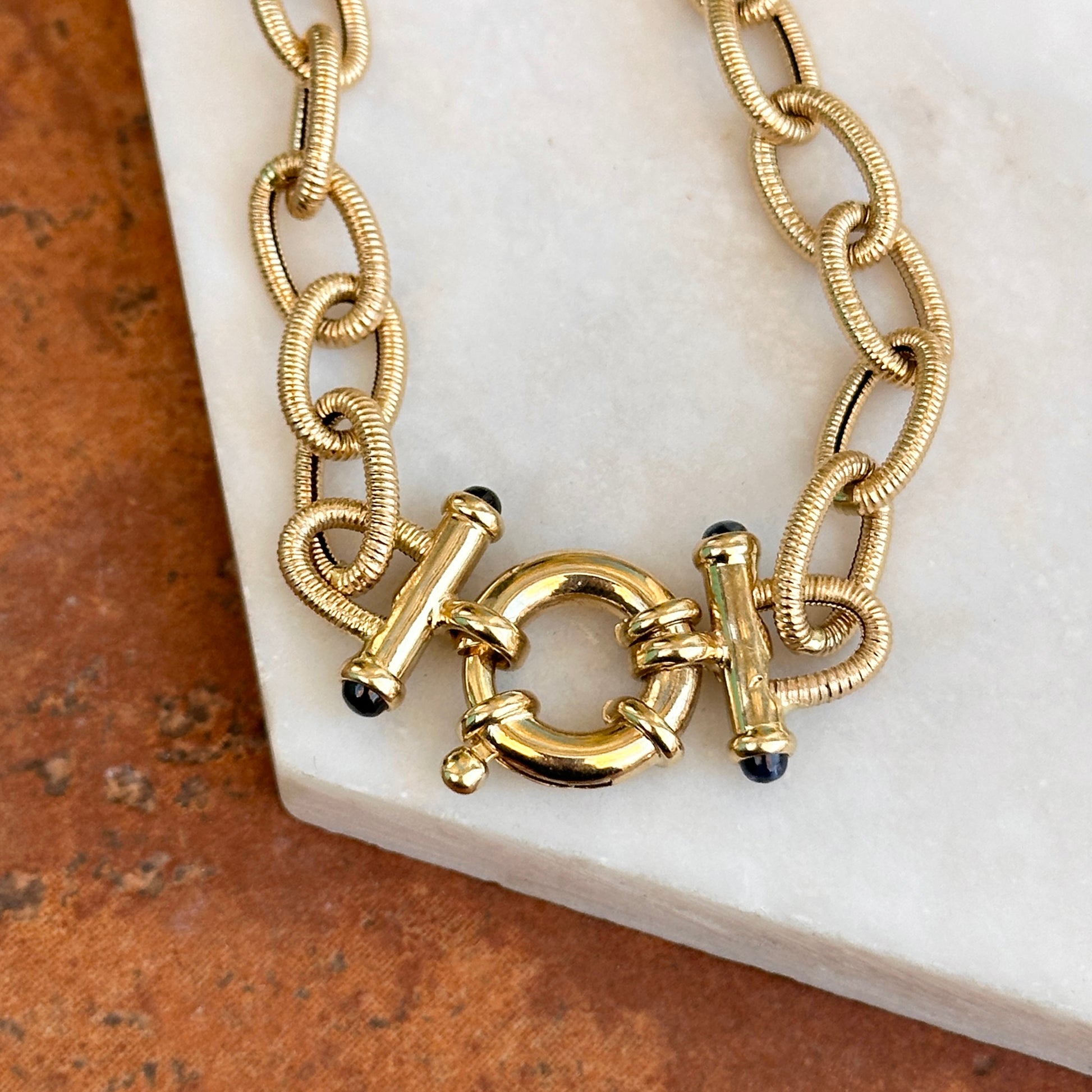 Estate/ Vintage 14KT Yellow Gold Textured Oval Chain Bracelet with Large Ring Clasp and Sapphire Toggle Ends