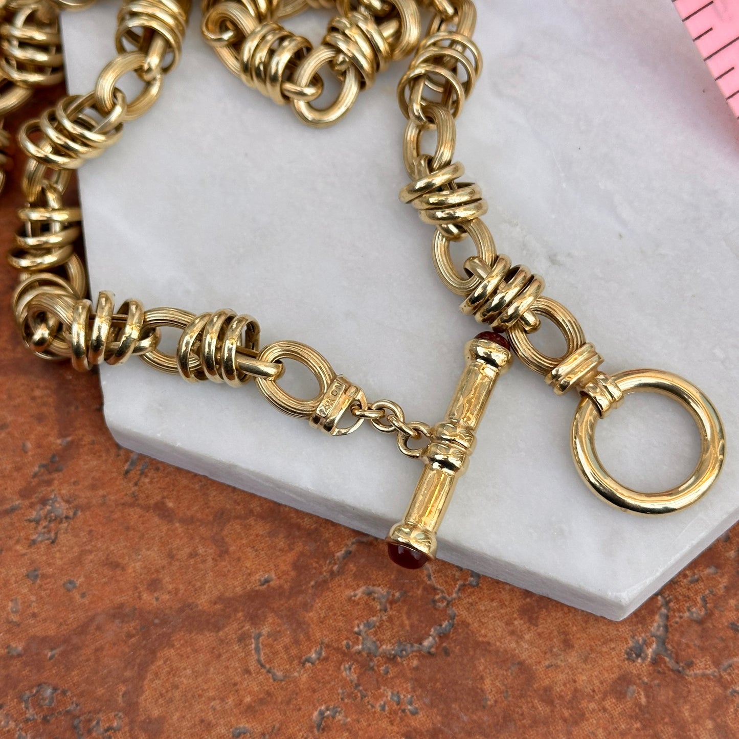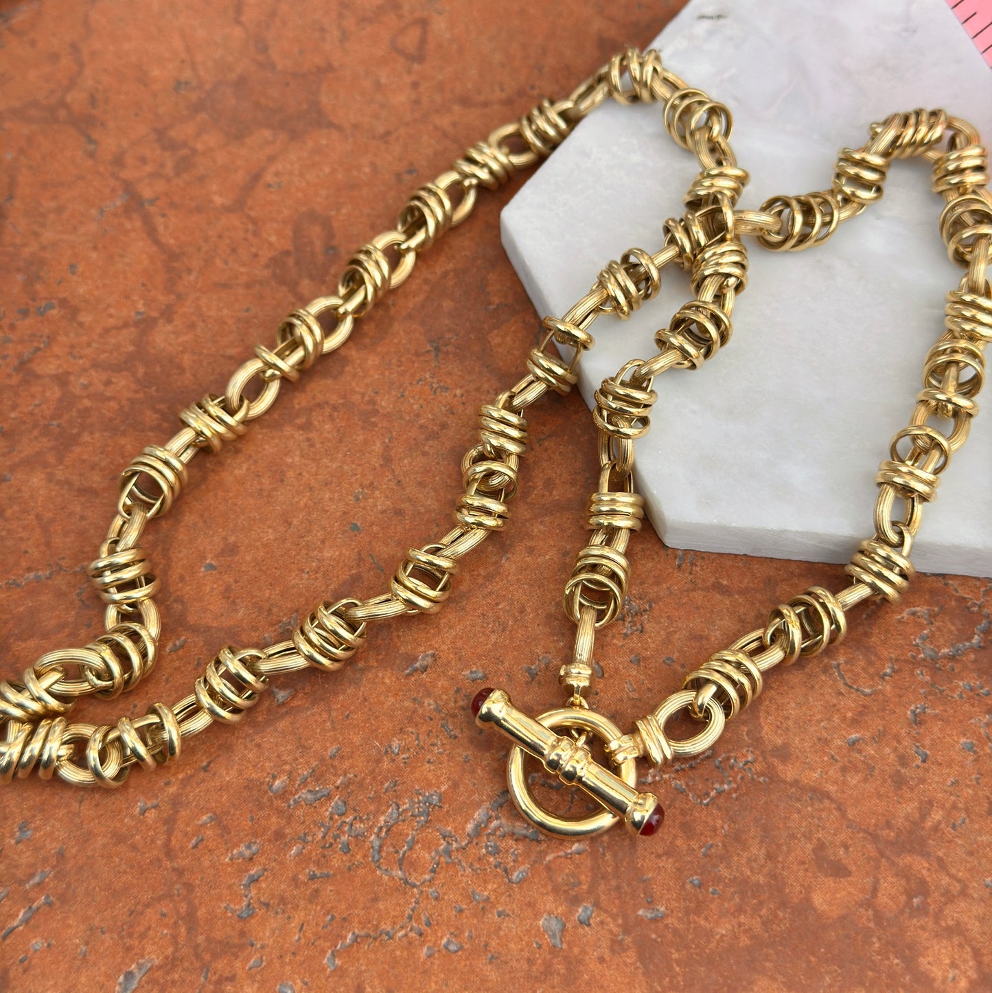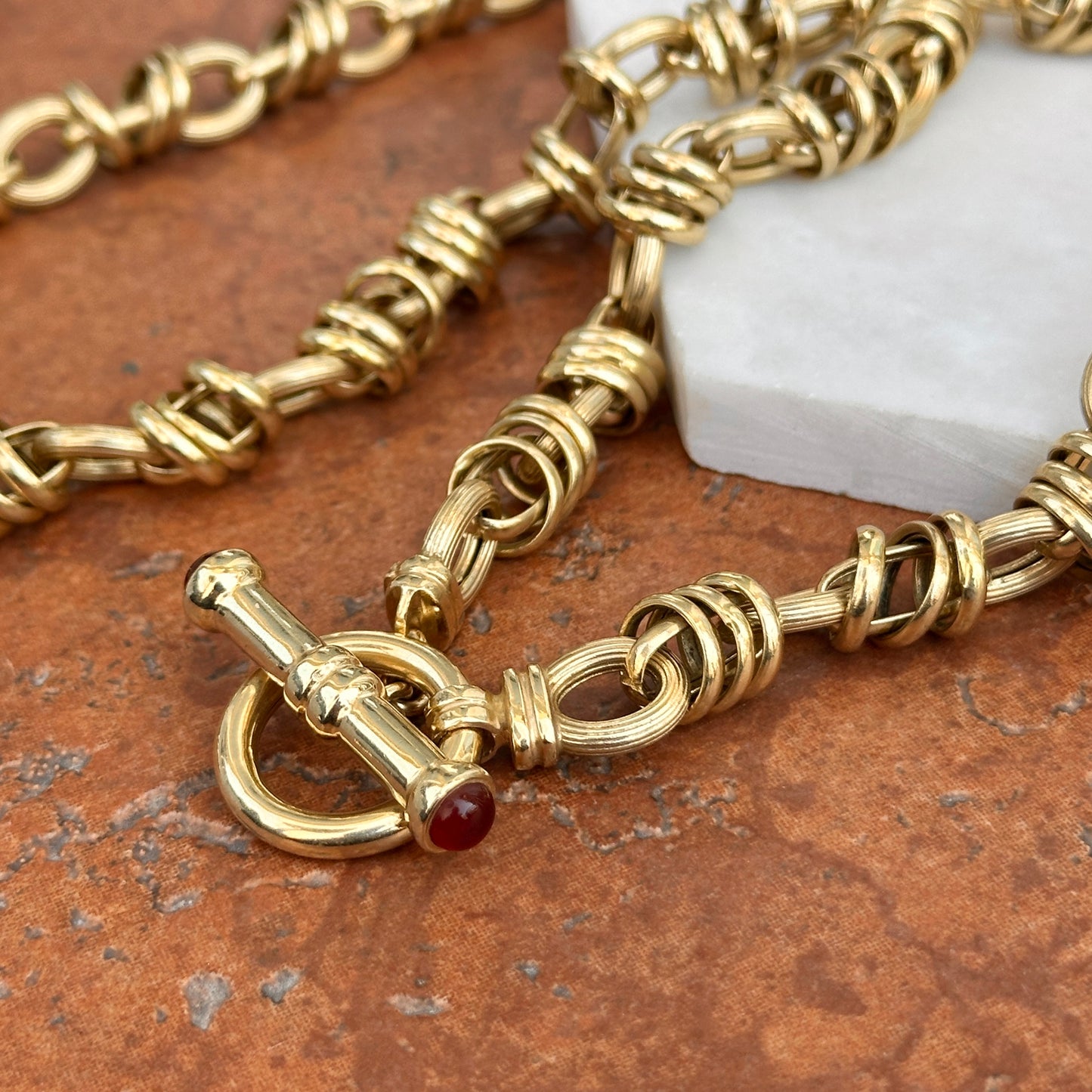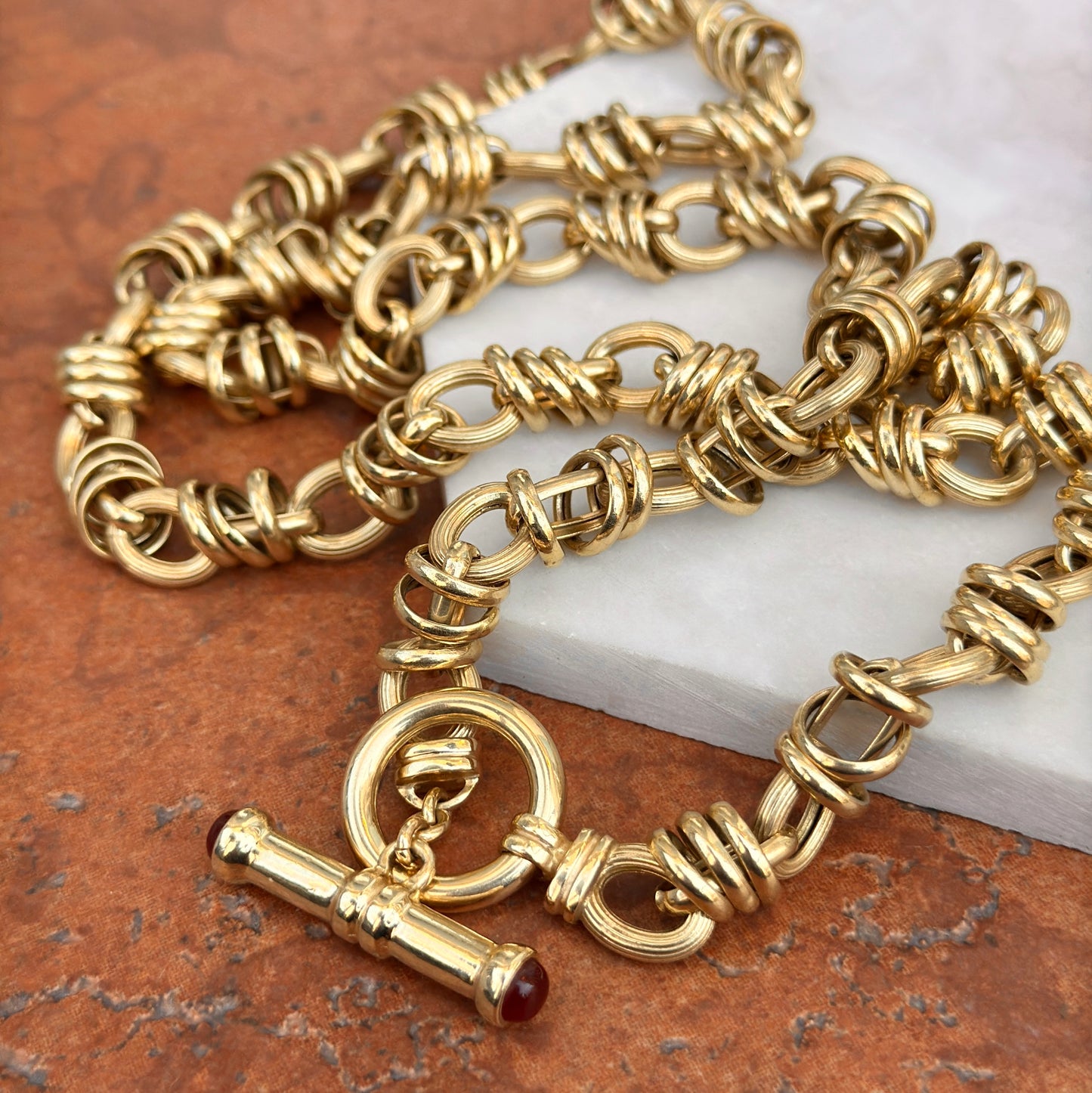 Estate 14KT Yellow Gold Textured Multi Ring Rolo Links + Carnelian Toggle Necklace