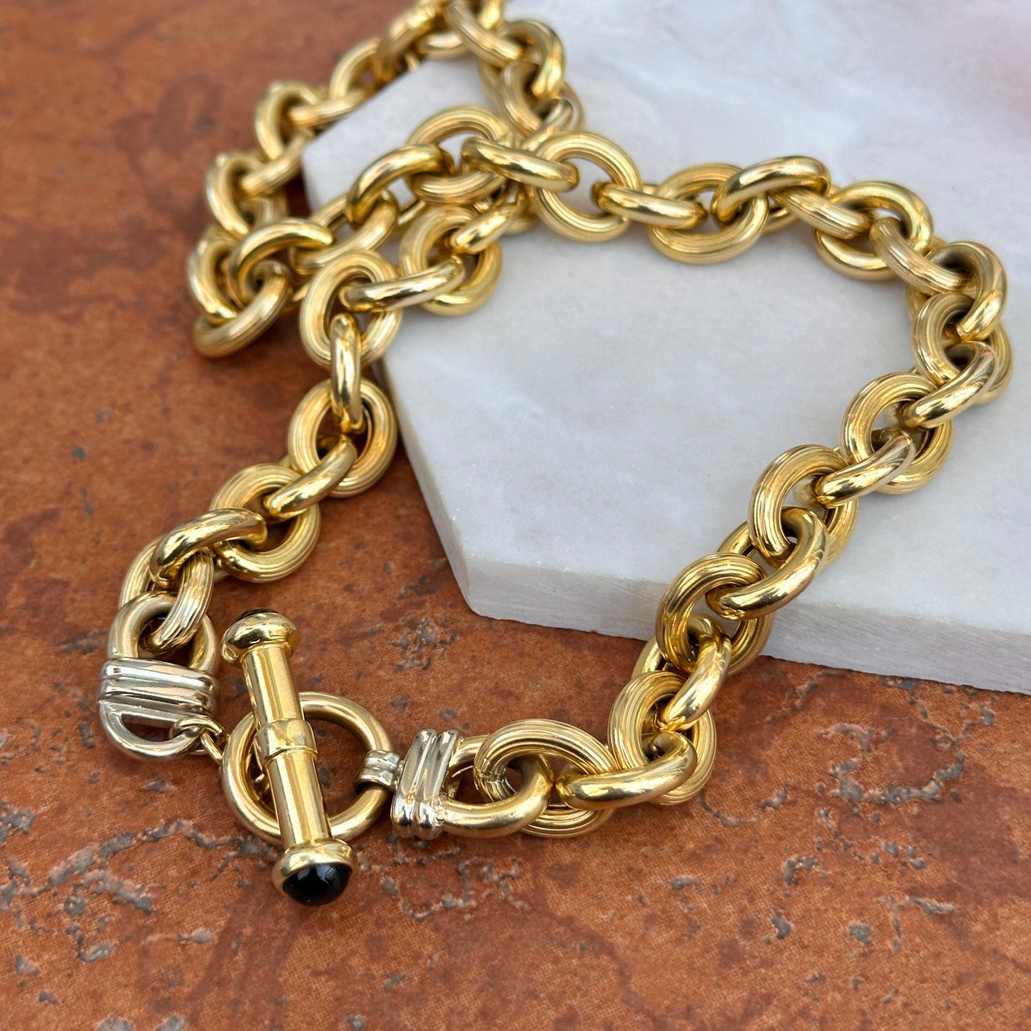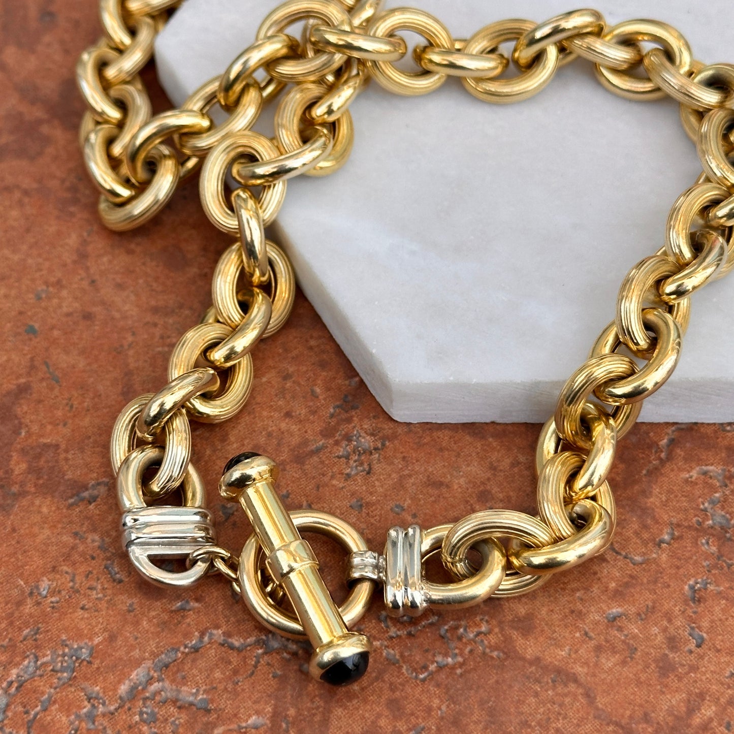 Estate 14KT Yellow with Yellow Gold Detailing Gold Textured and Shiny Rolo Link Necklace with Genuine Cabochon Black Onyx Gemstone EndCaps Toggle Clasp