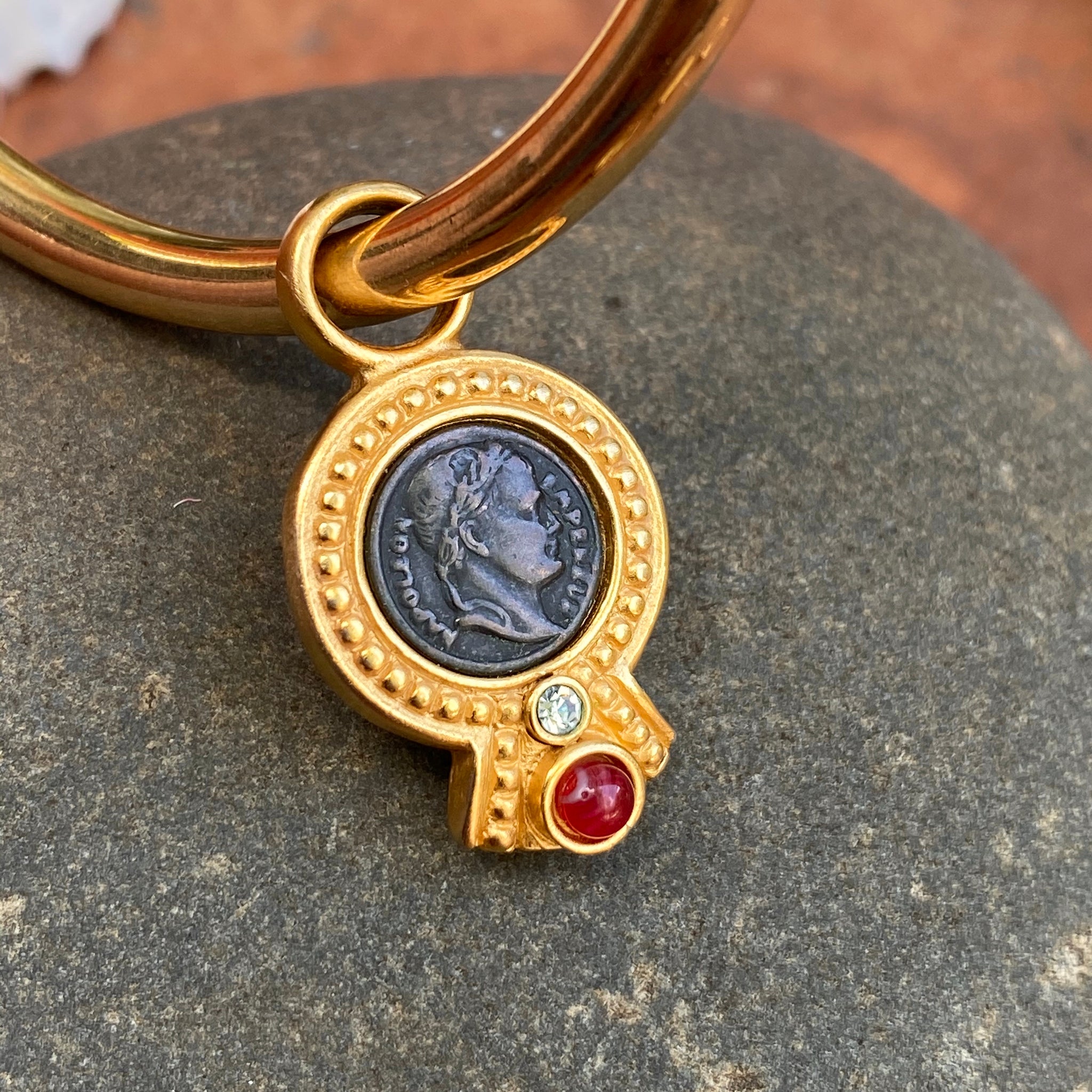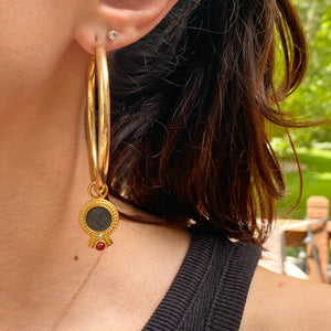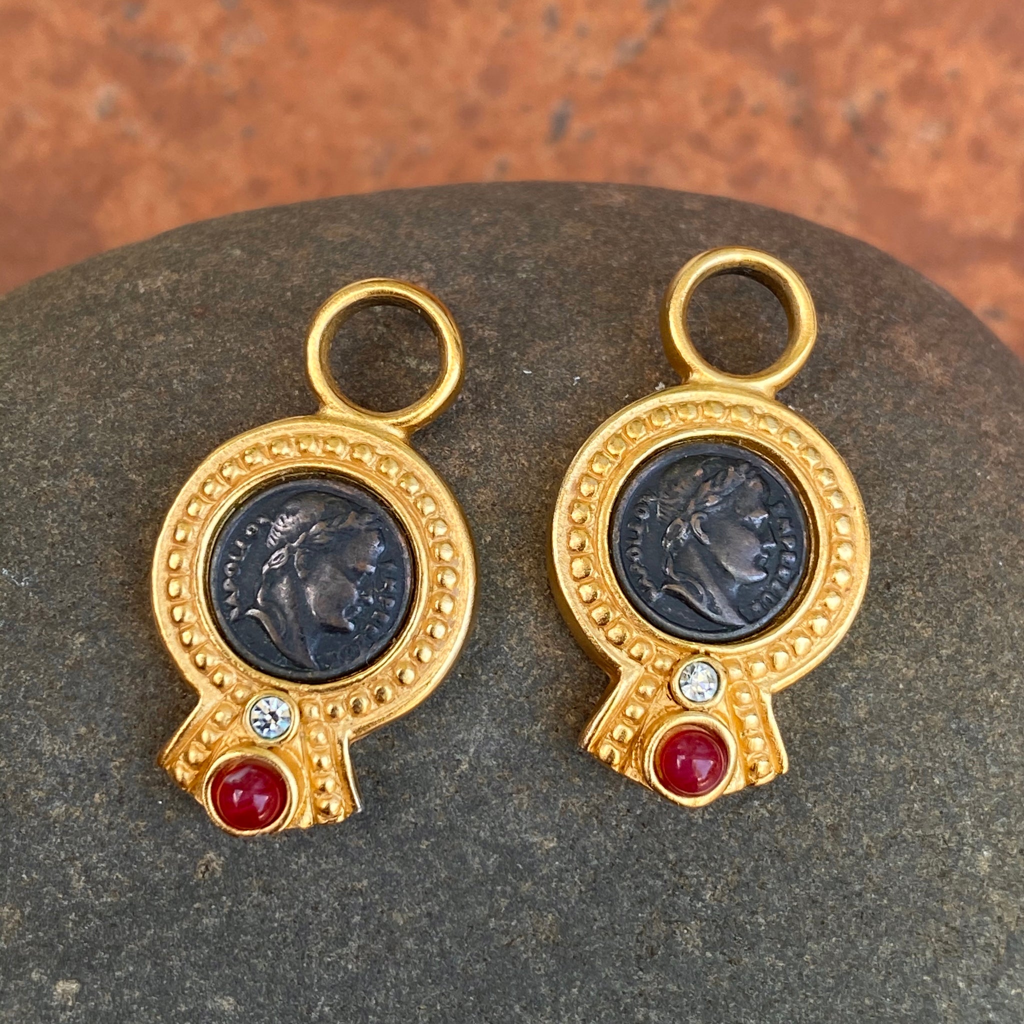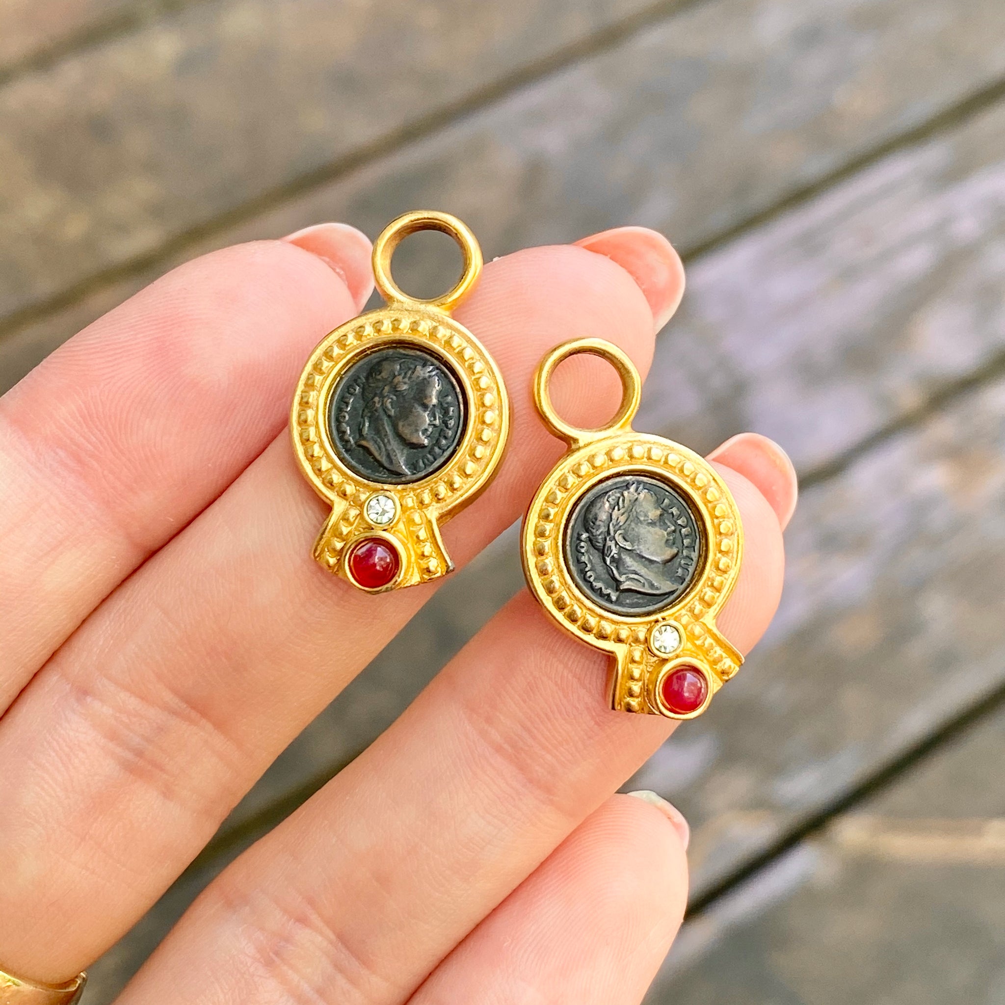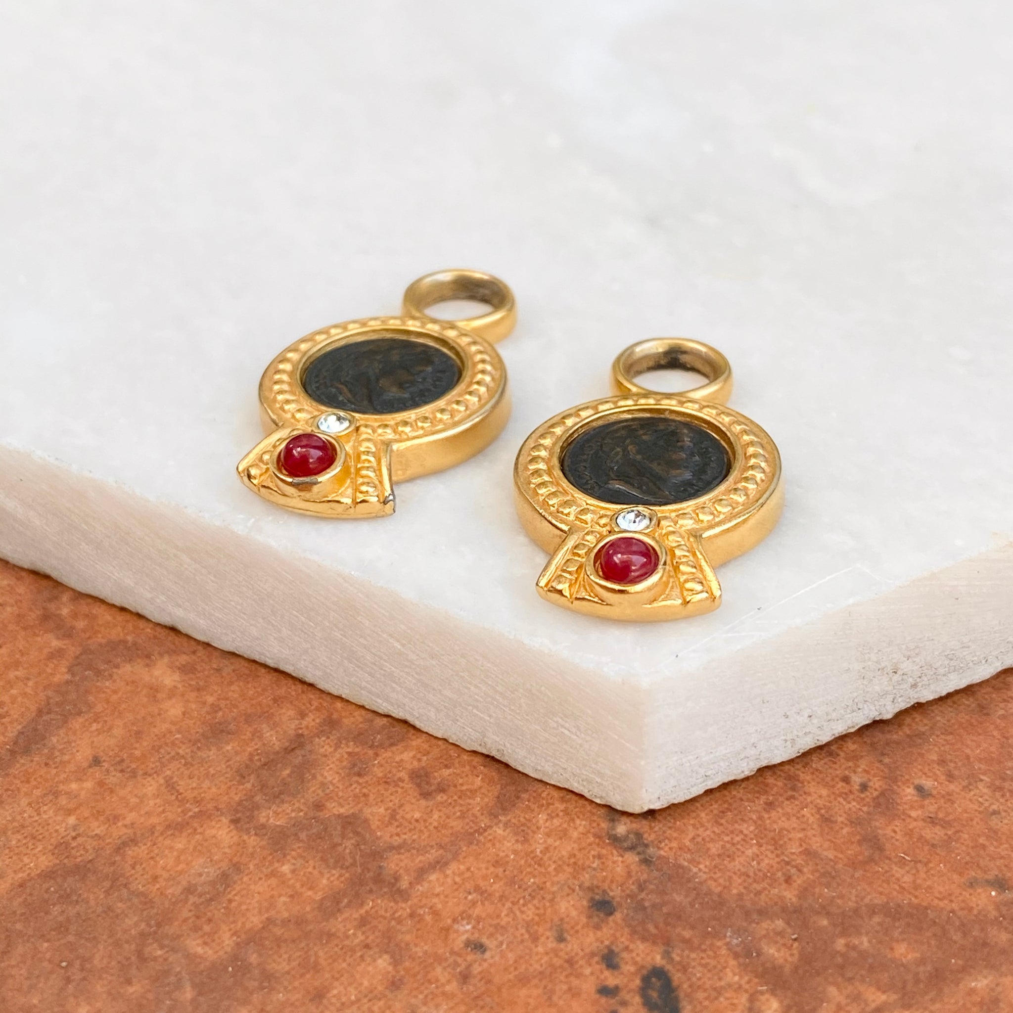 Matte-finished 14K vermeil (gold over sterling silver) antique, faux Brome Roman coin earring charms. These charms are perfect for thicker hoops or you can even use one for a pendant! With a matte finish and beaded outside frame, these charms have such a cool old world feel!