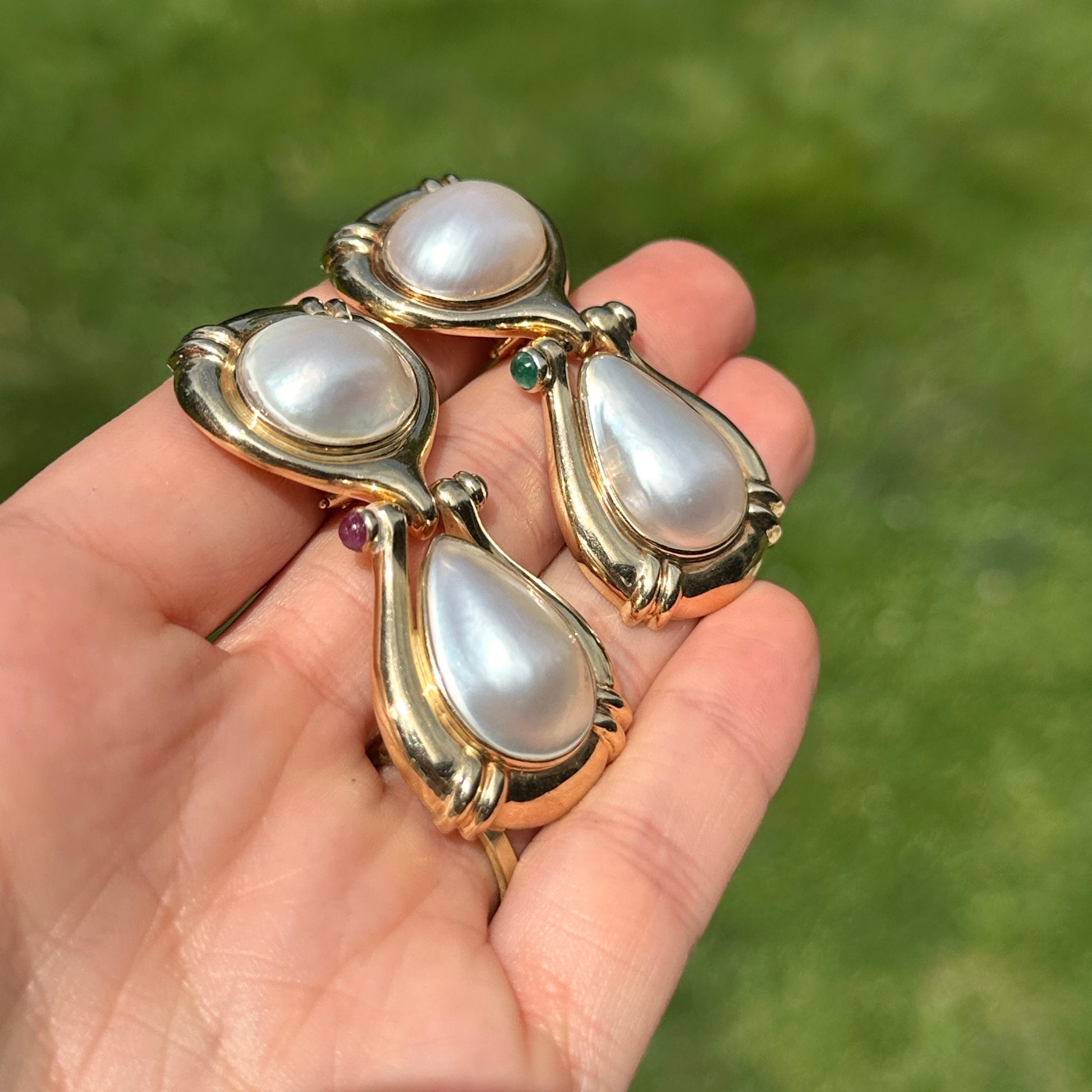 Estate 14KT Yellow Gold Mabe Pearl, Ruby + Emerald Clip-On Earrings
