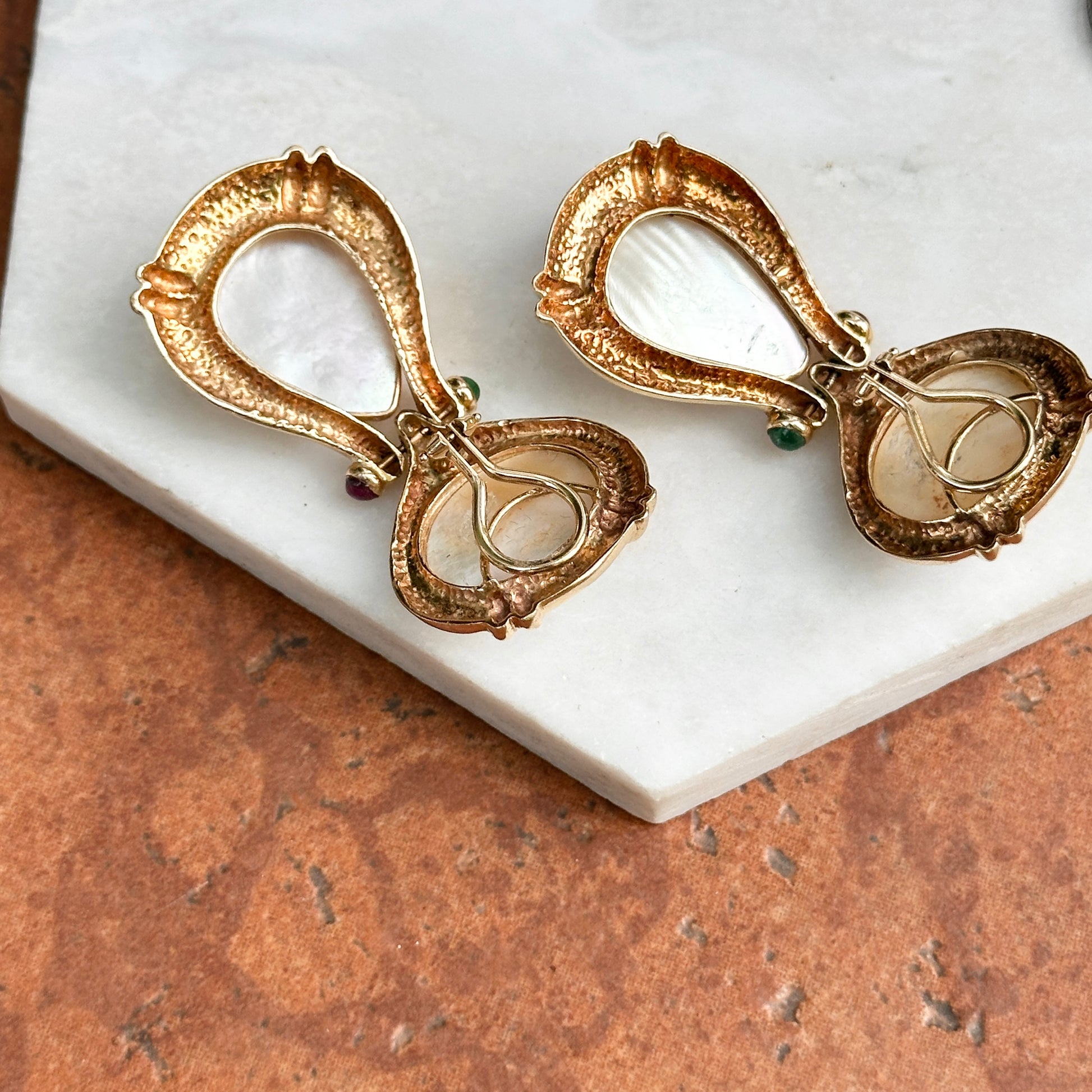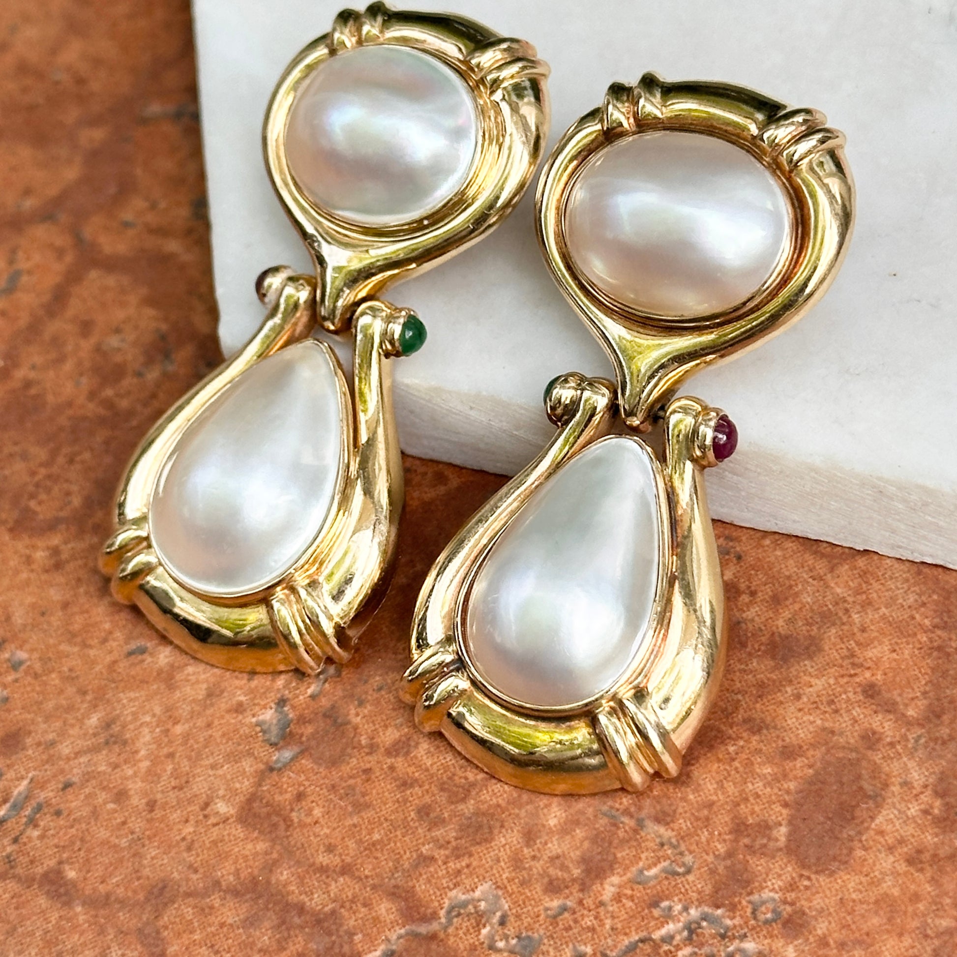 Estate/ Vintage 14KT Yellow Gold Pear and Round Shaped Mabe White with Cabochon Emeralds and Rubies Dangle Drop Omega Clip-On Earrings