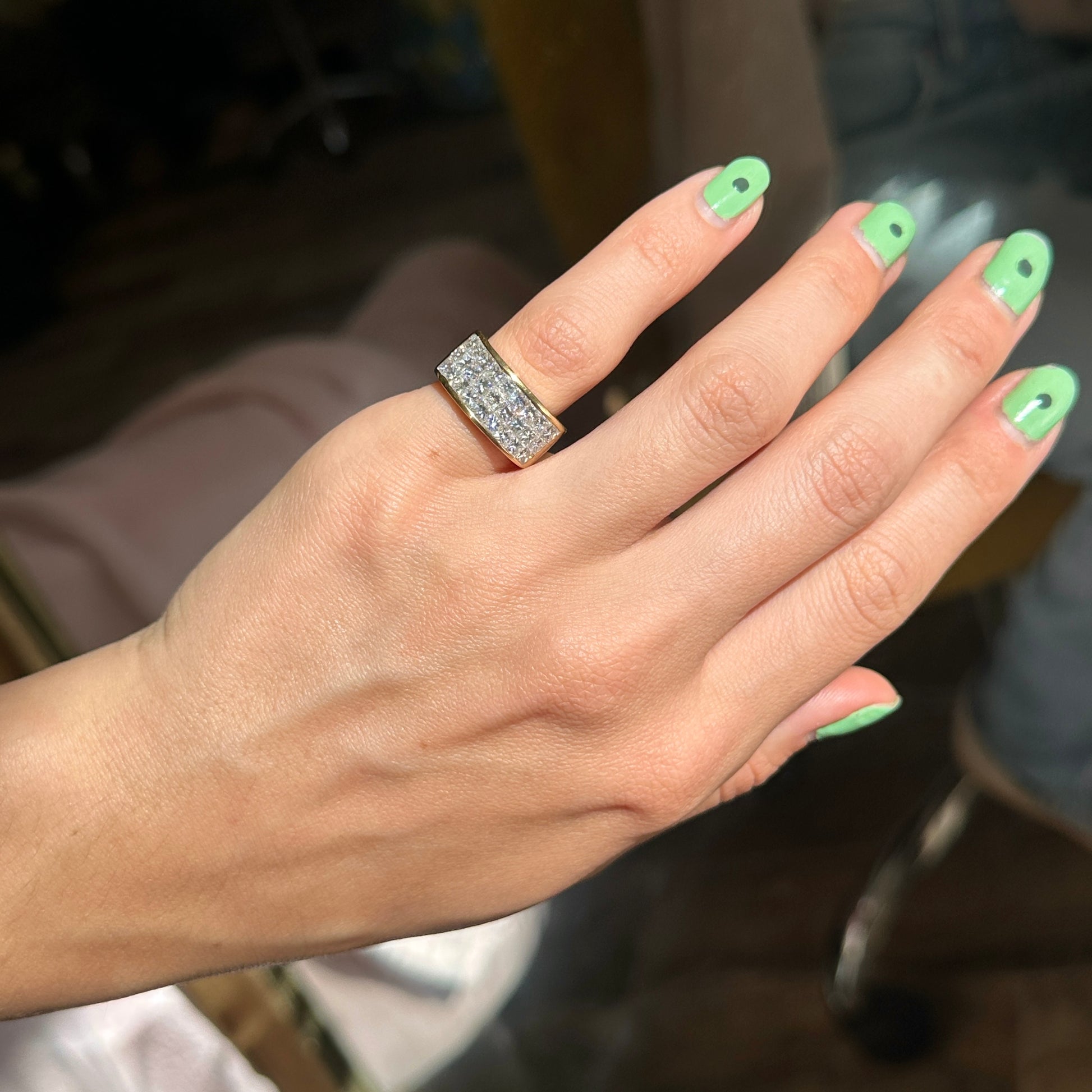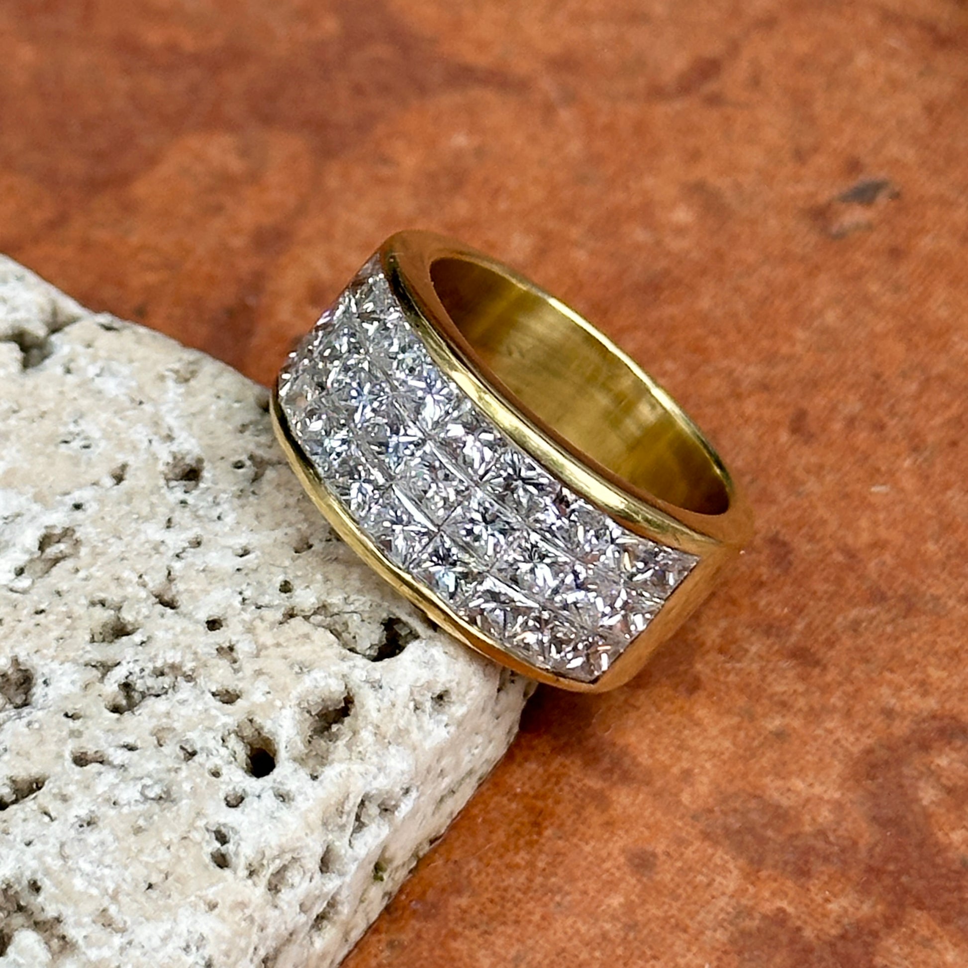 Estate 18KT Yellow Gold & Invisible Set 3 Row Princess-Cut Diamonds Wide, Cigar Band Ring