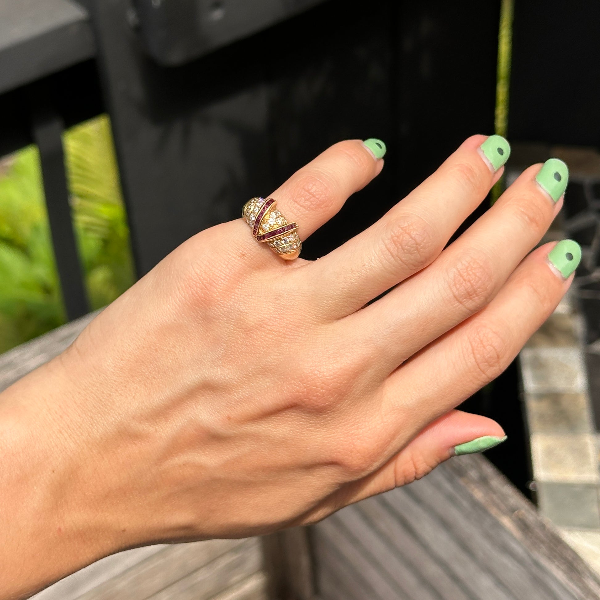 Estate 18KT Yellow Gold Channel-Set Princess-Cut Ruby + Pave Diamond Ring