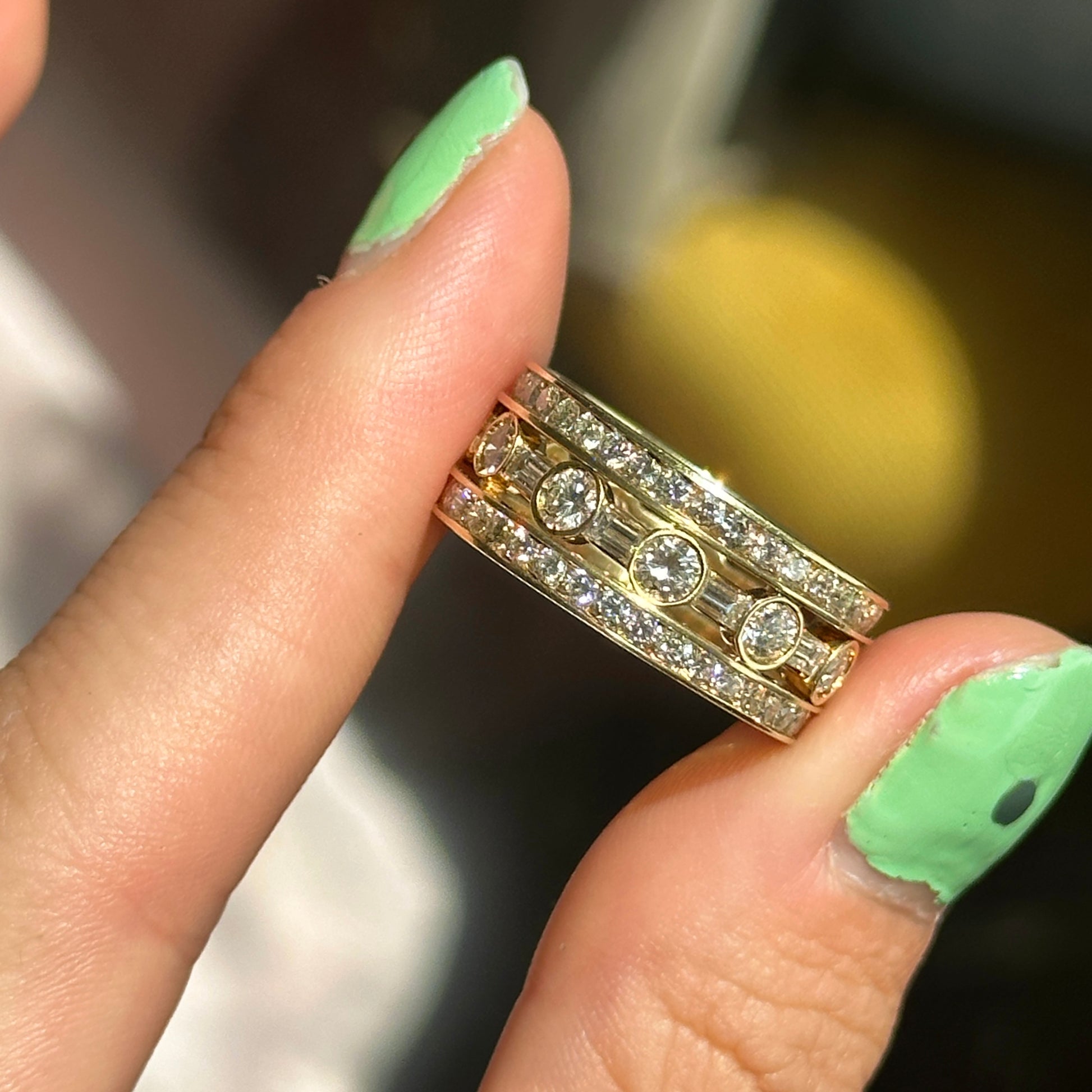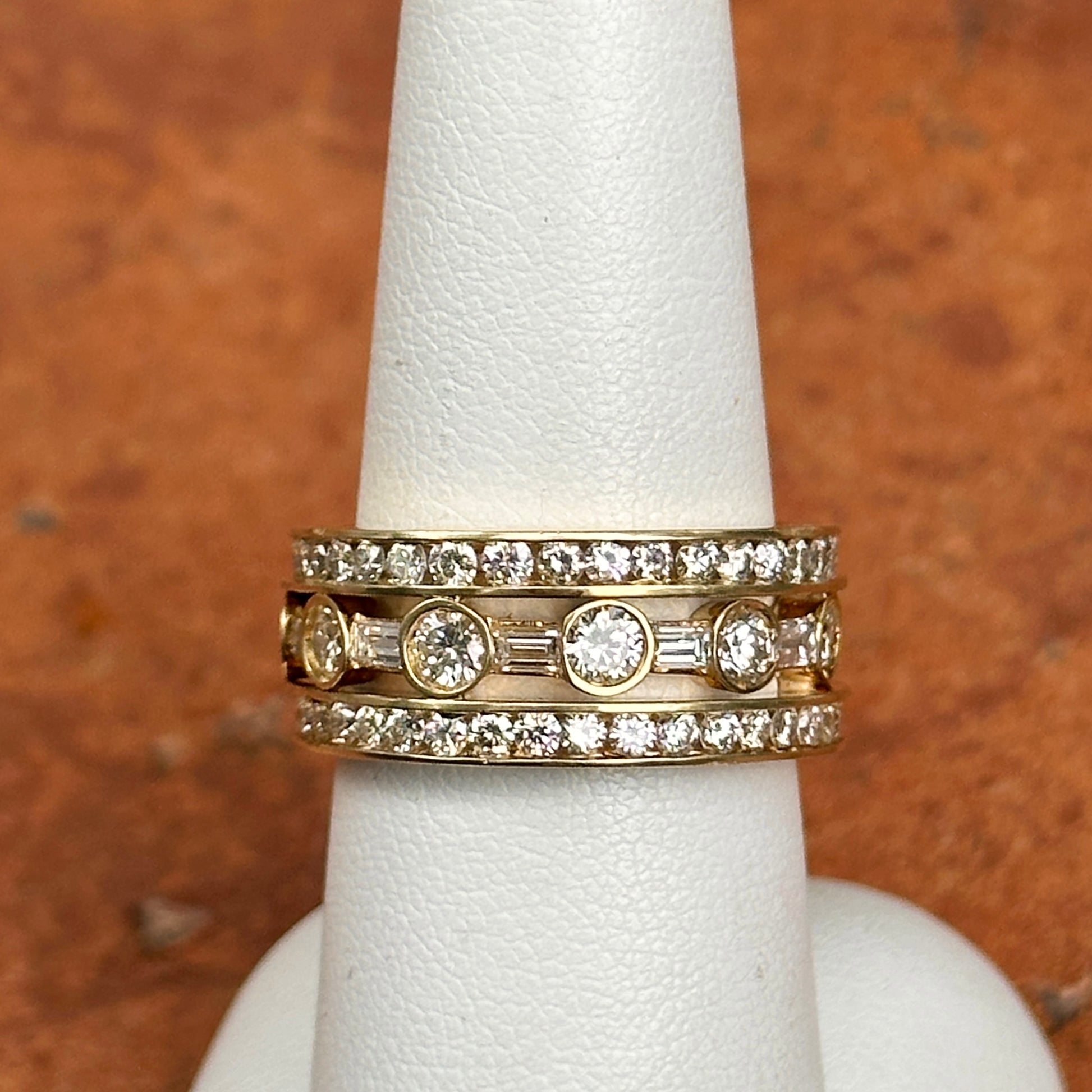 18K Yellow Gold Round and Baguette Diamond Three Band Eternity Ring