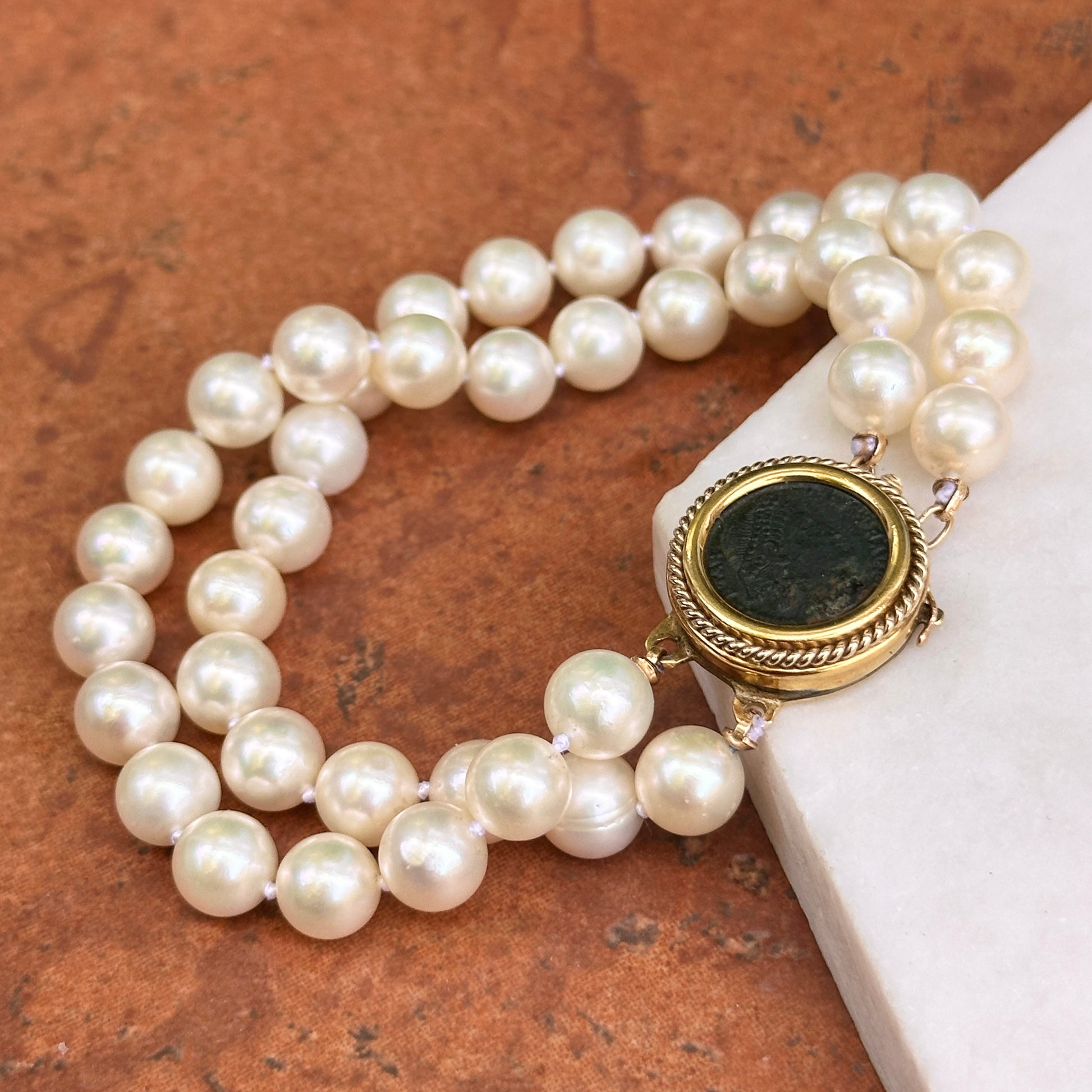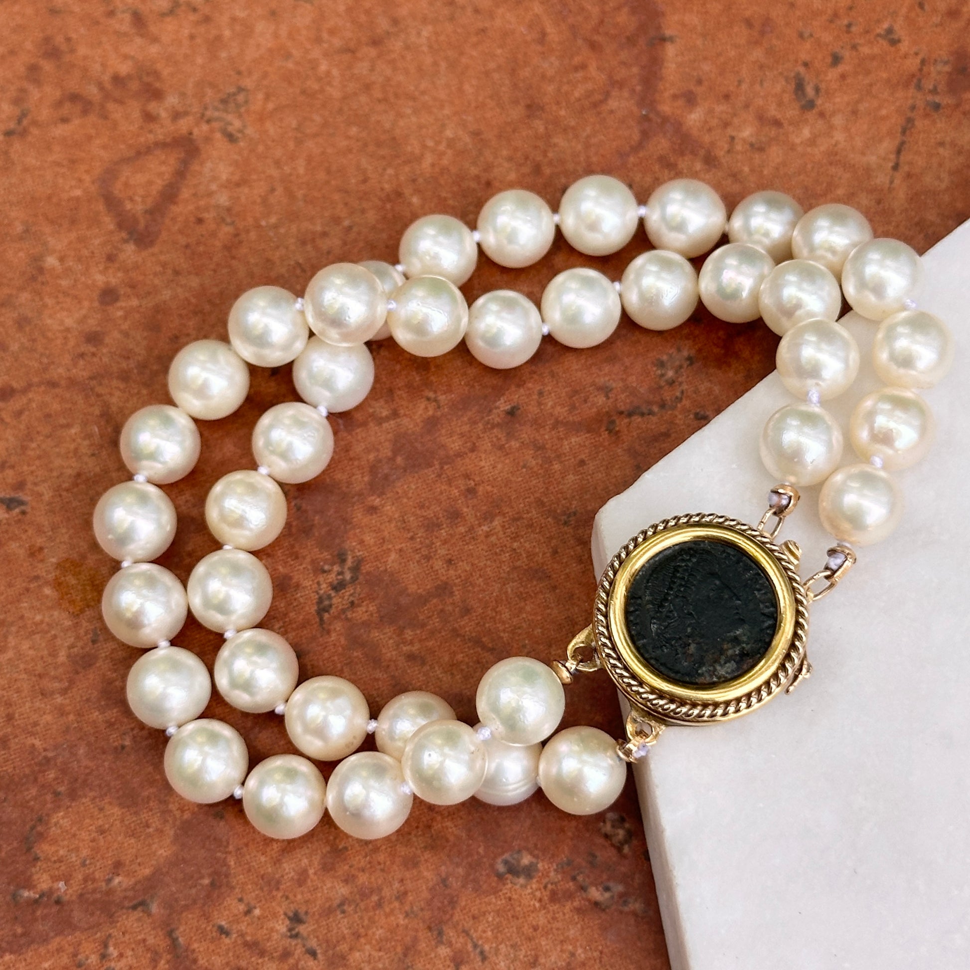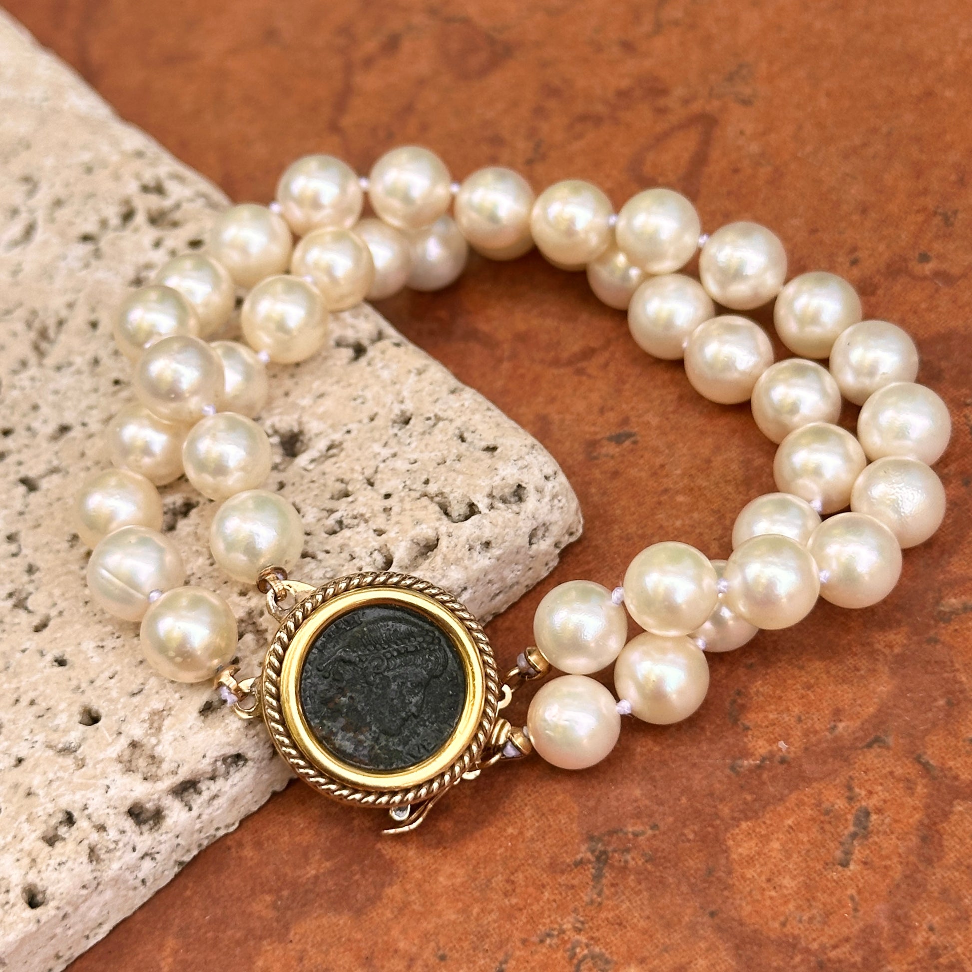 14K-18KT Yellow Gold Two Strand Pearl Bracelet with Yellow Gold Bezeled Antique Roman Coin Bronze