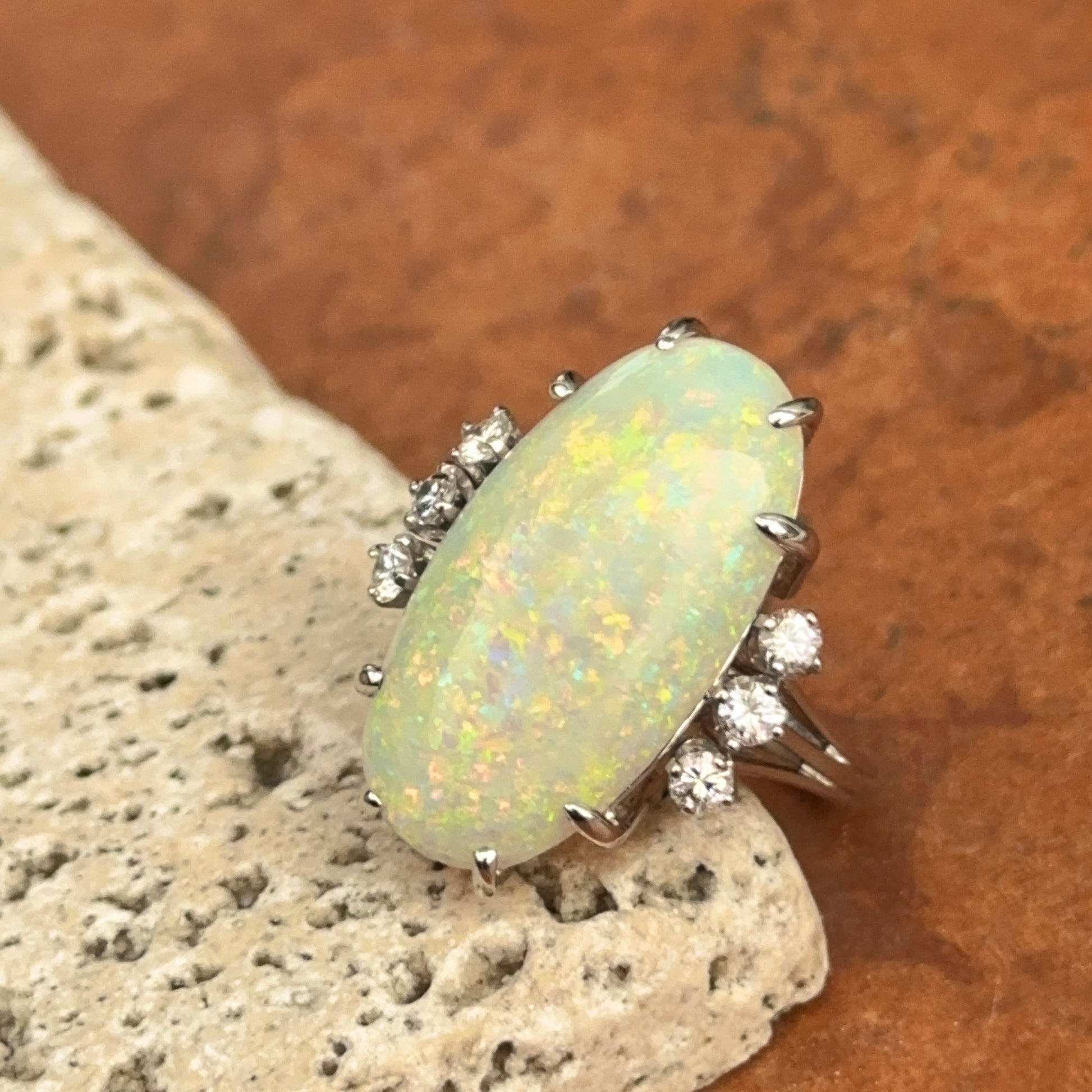 Estate 18KT White Gold Oval Opal + Diamond ring