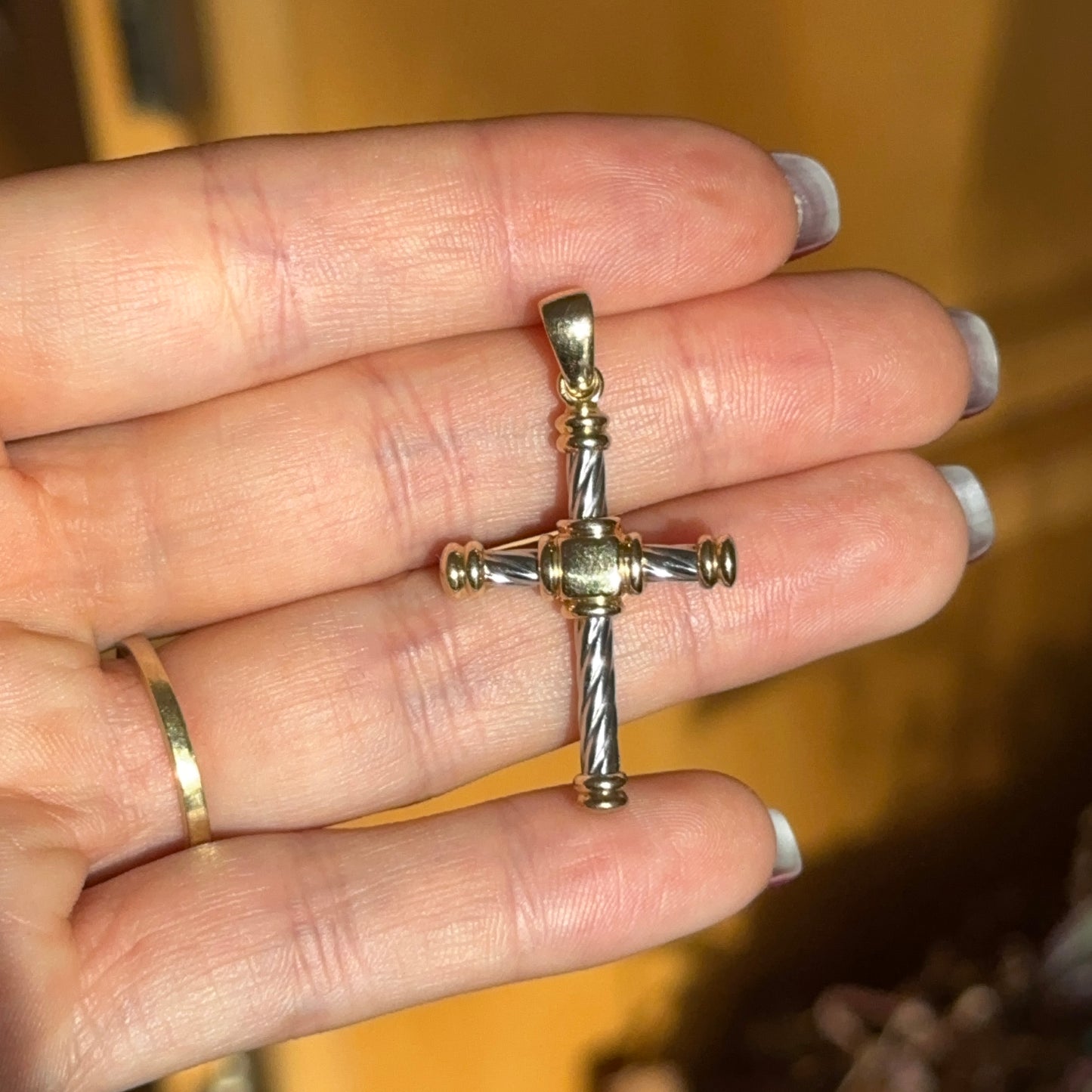 Estate/ Vintage 18K yellow and white gold ornate rope twist detailed style cross pendant