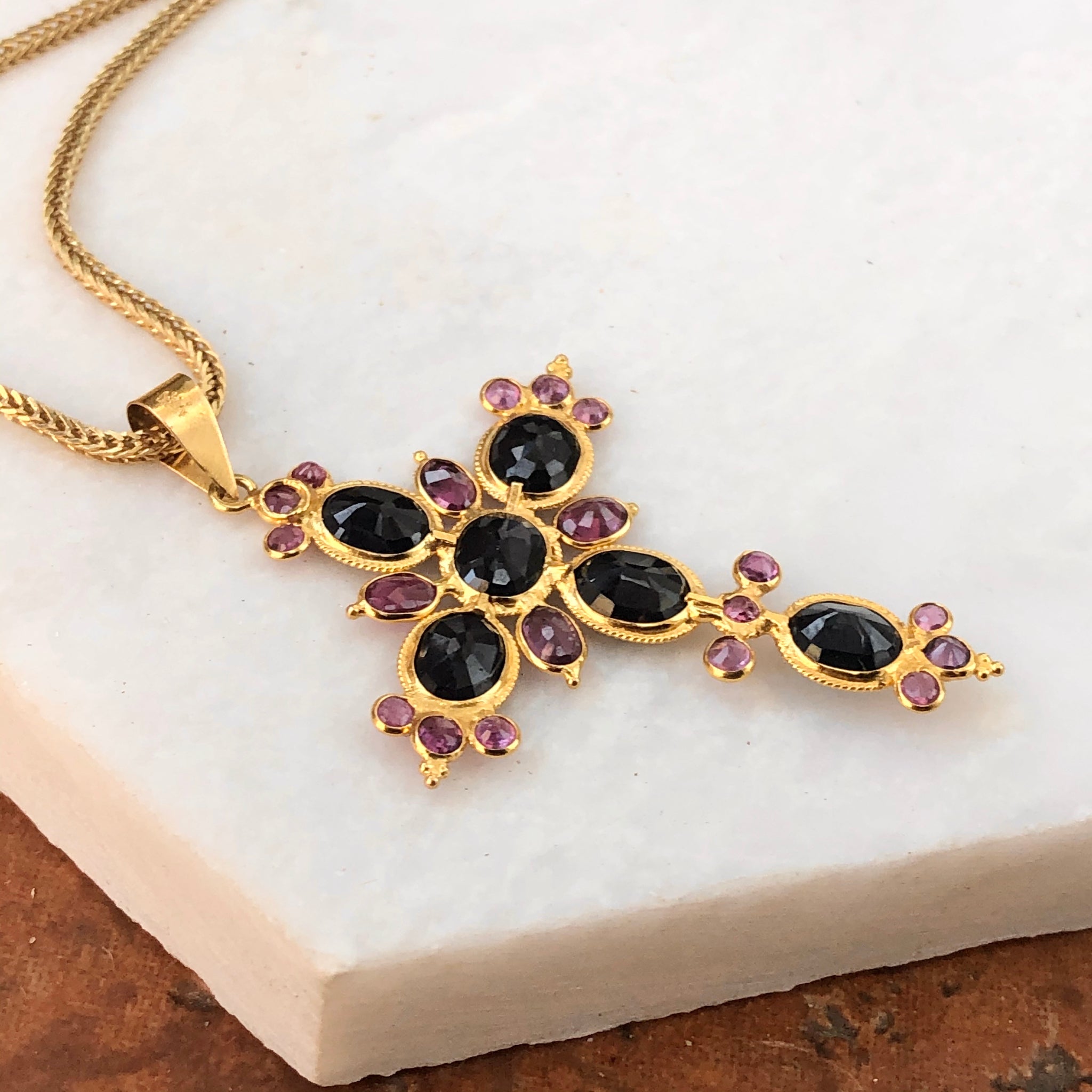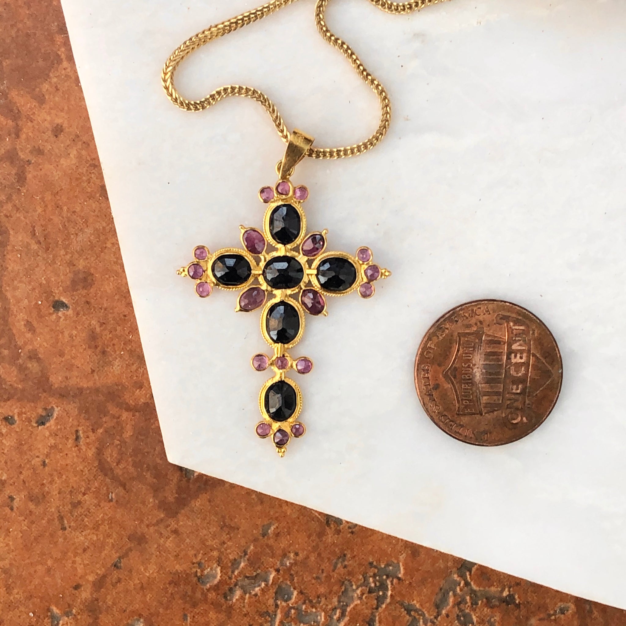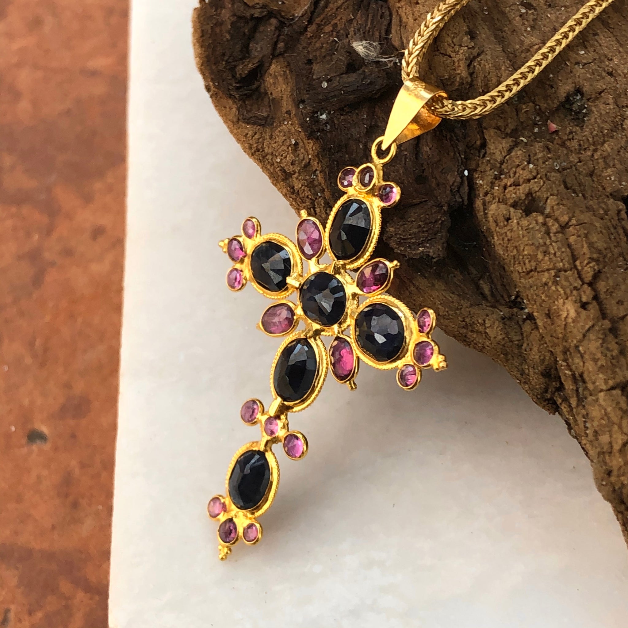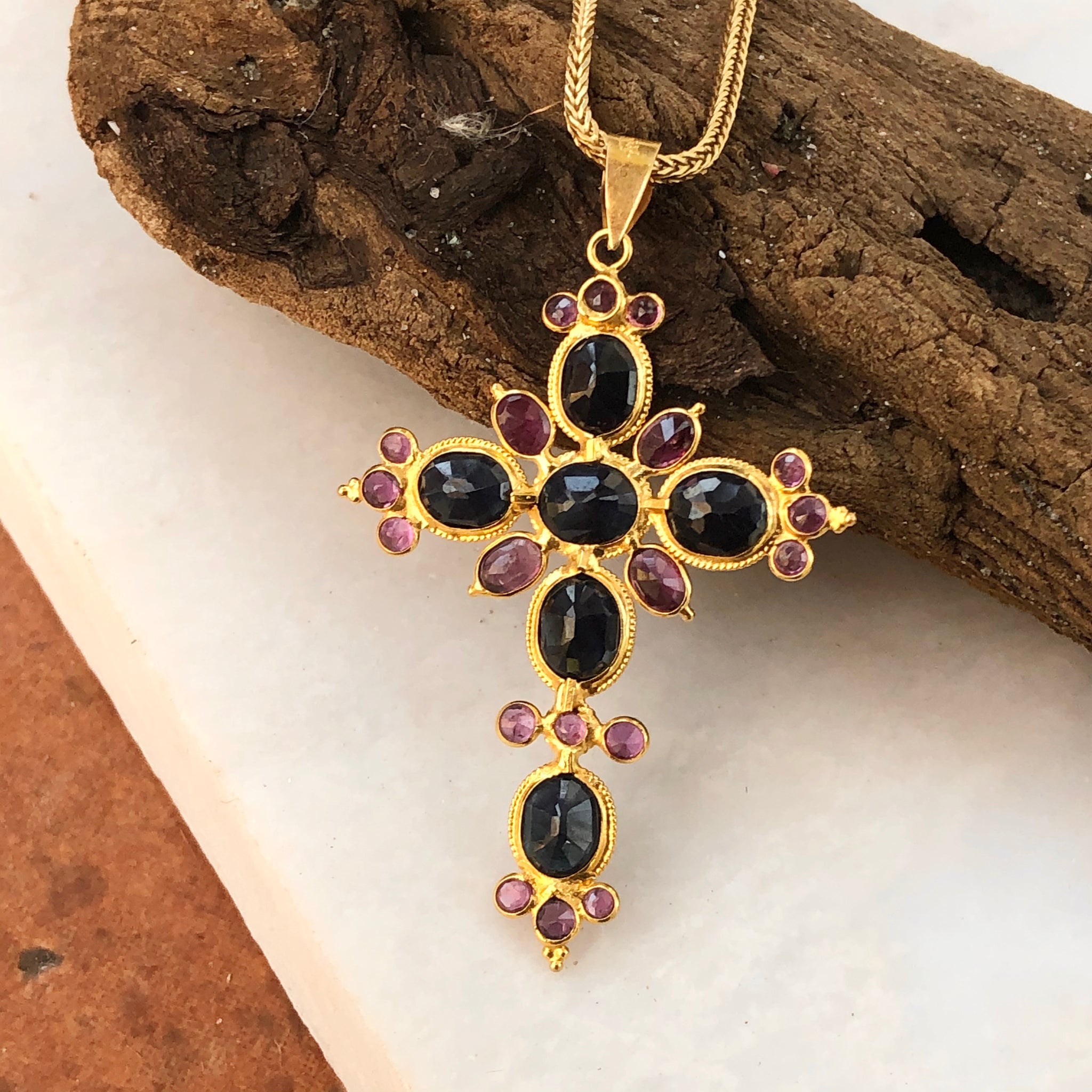 Estate/ vintage 18KT yellow gold ornate cross pendant with genuine, blue sapphires + genuine, rubies. Shown with 18KT yellow gold foxtail chain necklace- sold separately.