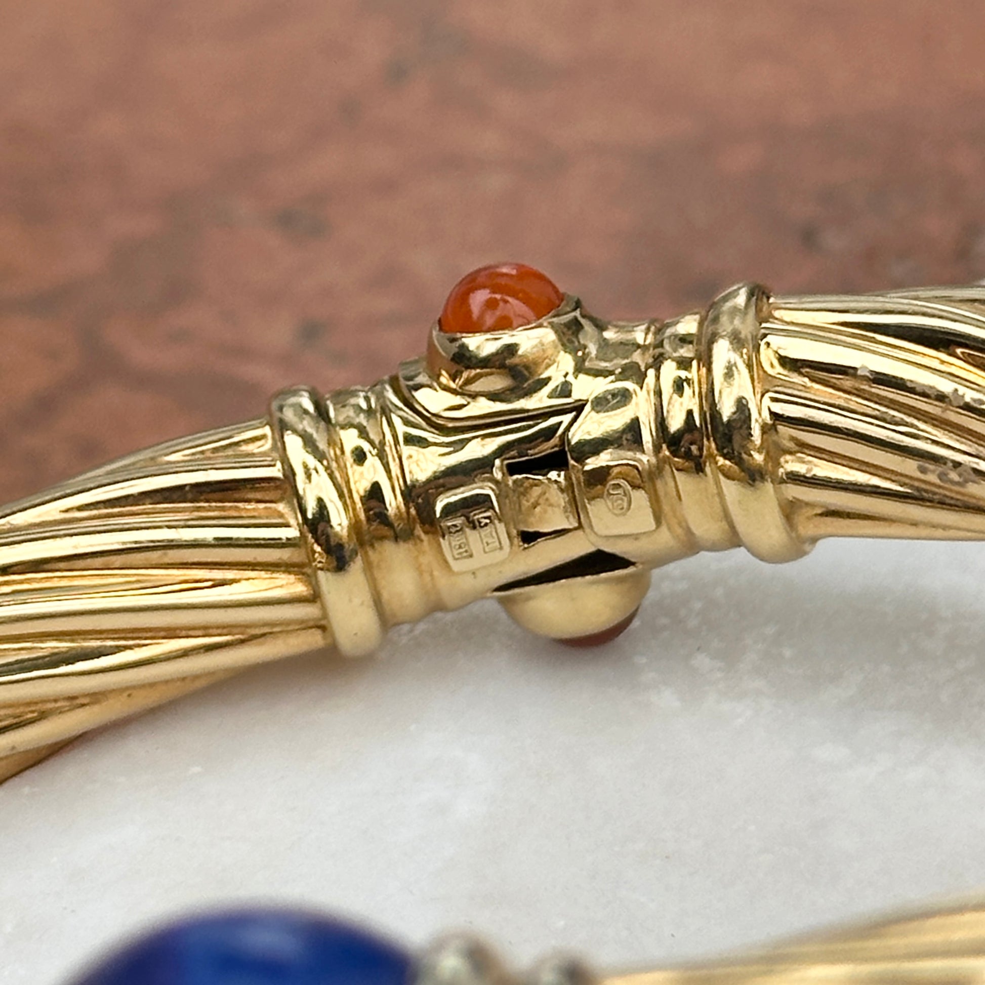 Estate Vintage 18KT Yellow Gold Cable Twist and Double Ball End Cap Lapis and Carnelian Bangle Cuff Bracelet Bypass Design