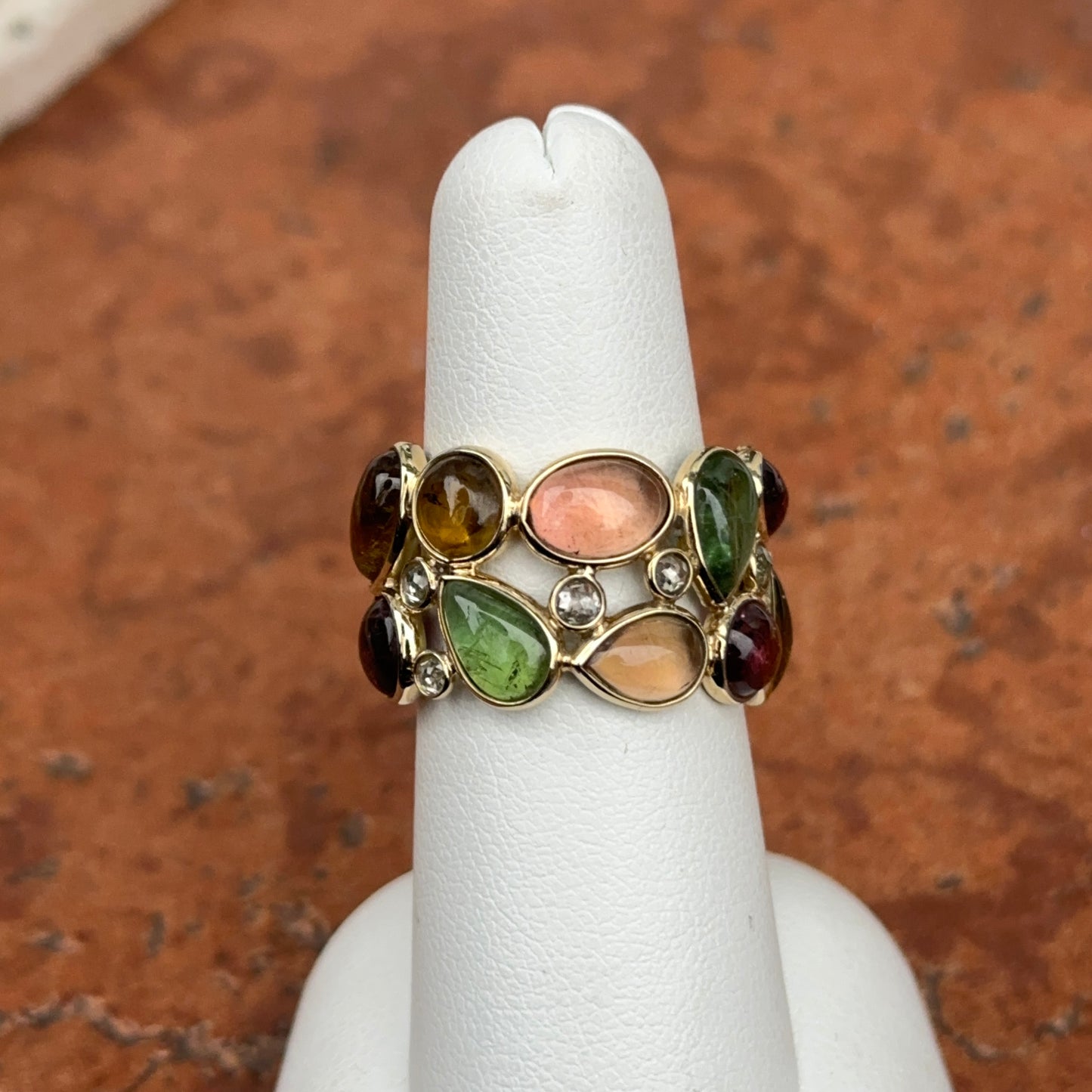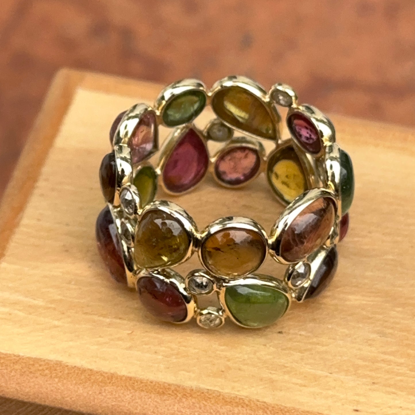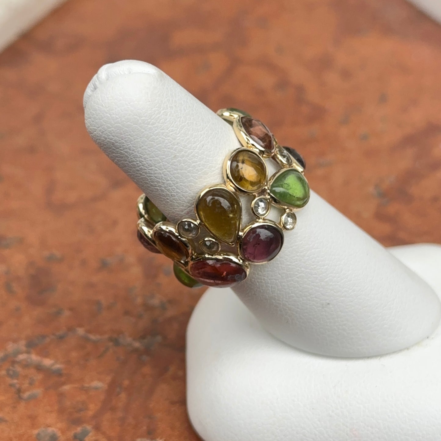 Estate/ Vintage 18KT Yellow Gold Multi Colored and Shaped Tourmaline Double Band Ring with Cabochon, Bezel-Set, Green Pink Yellow Brown Color Genuine Tourmalines and Diamond Gemstones