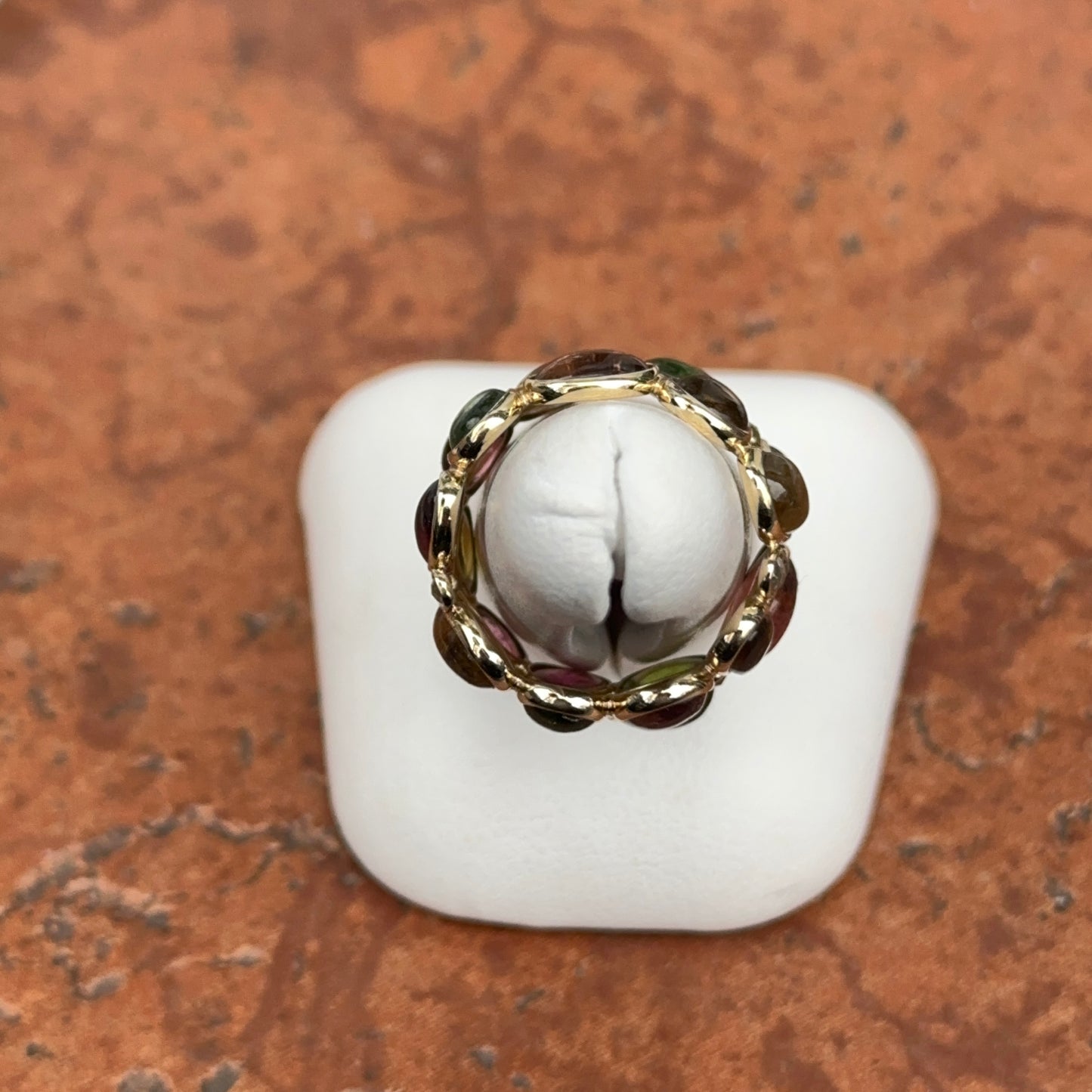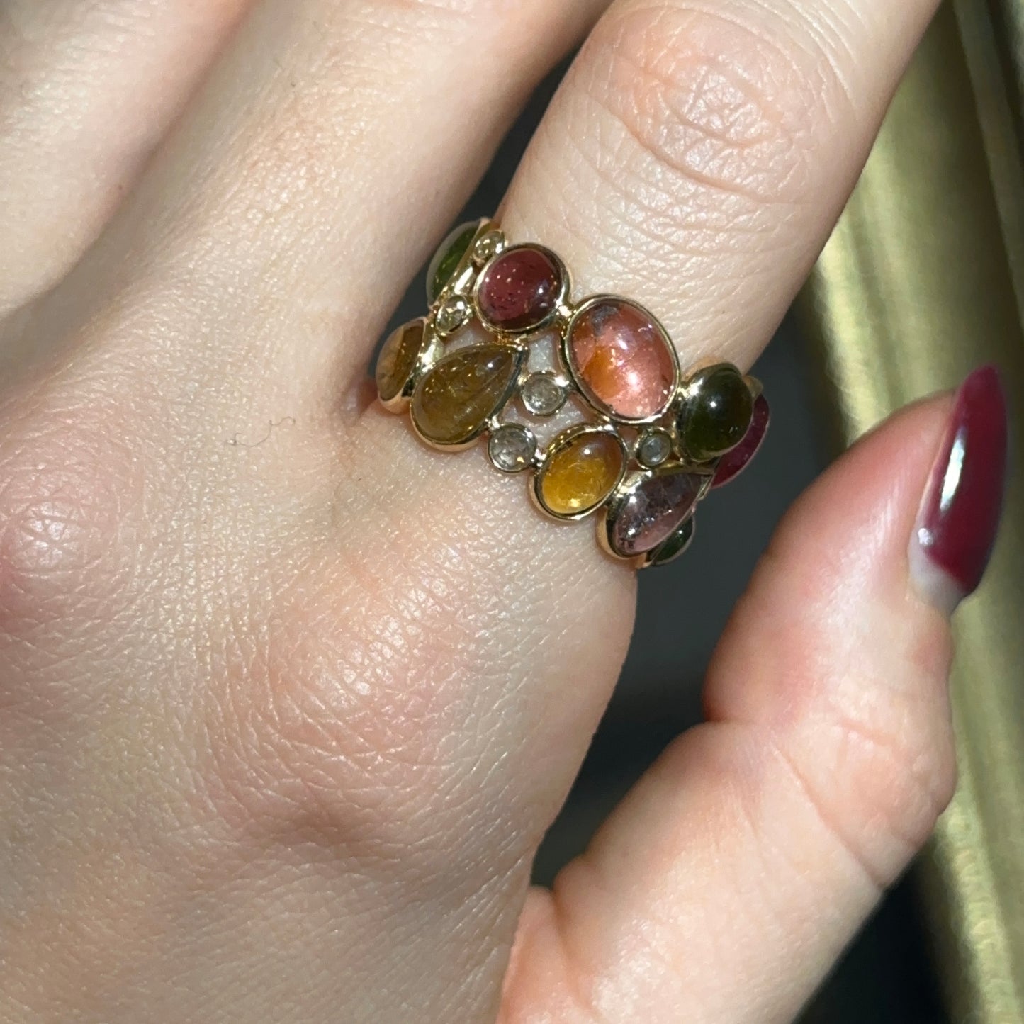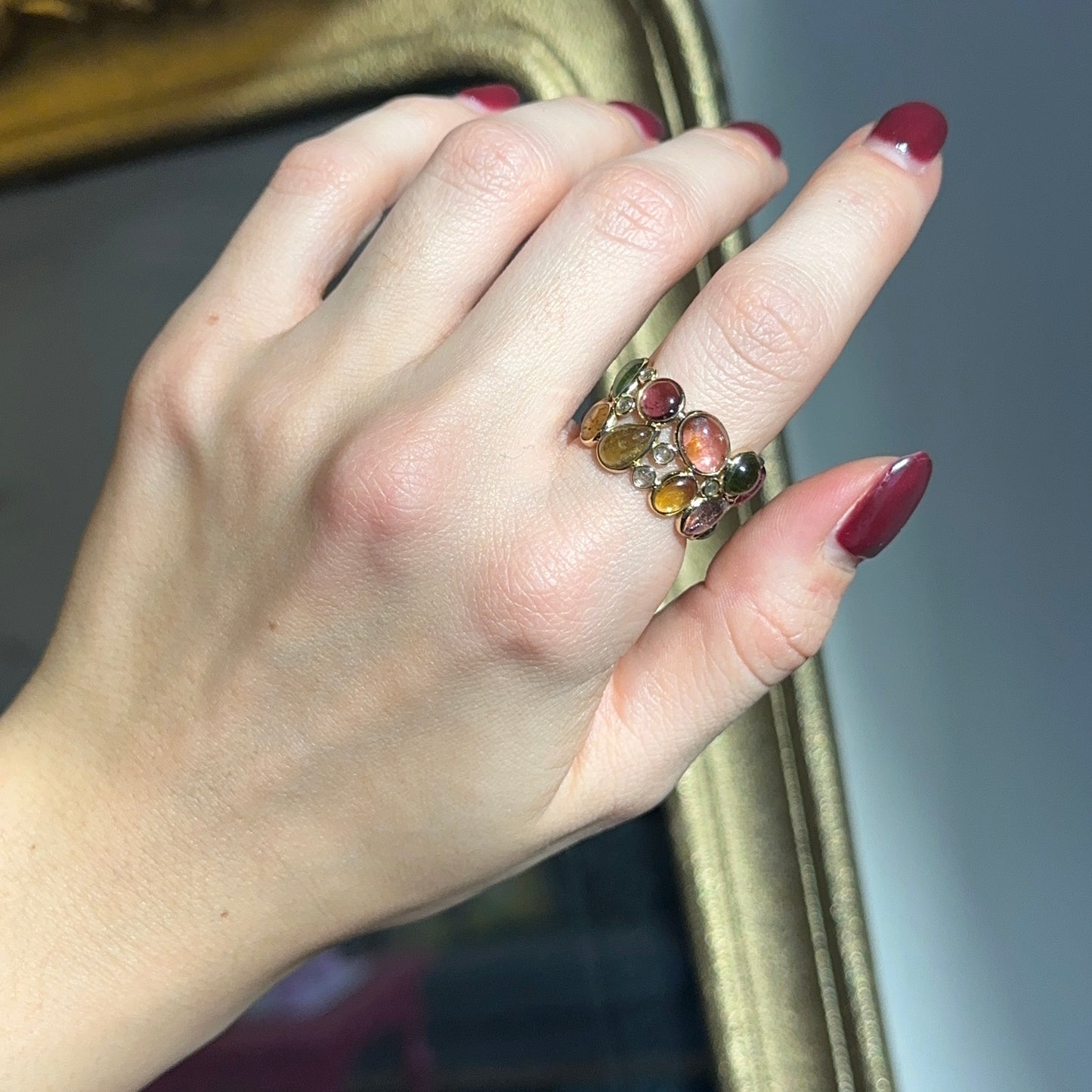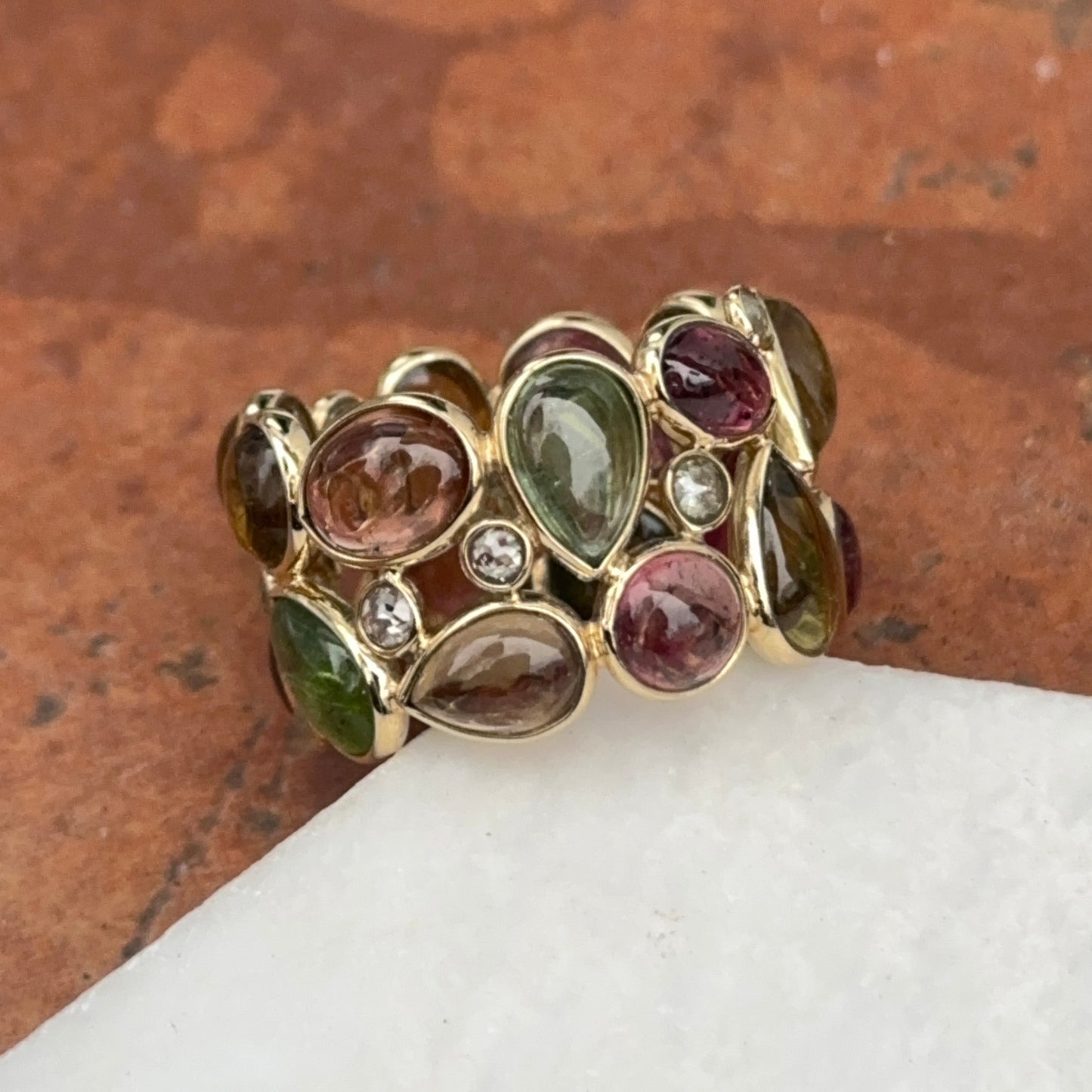 Estate/ Vintage 18KT Yellow Gold Multi Colored and Shaped Tourmaline Double Band Ring with Cabochon, Bezel-Set, Green Pink Yellow Brown Color Genuine Tourmalines and Diamond Gemstones