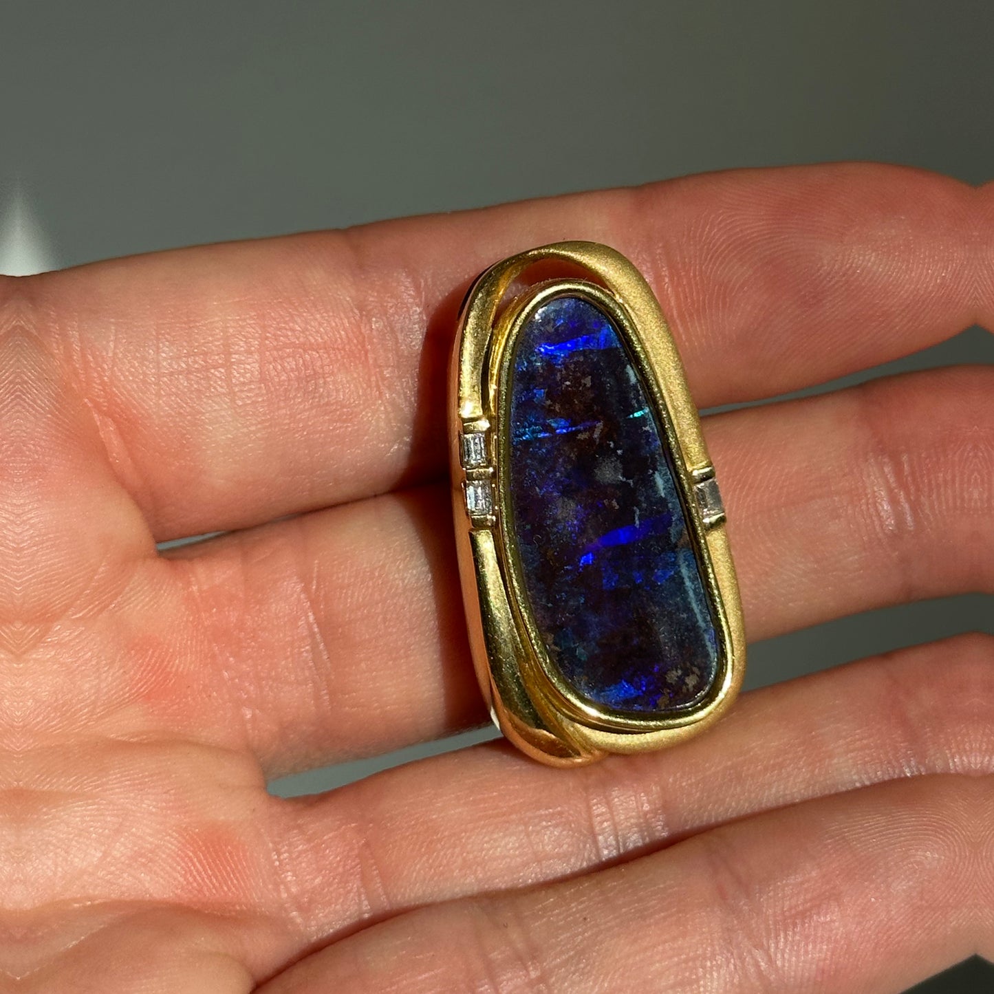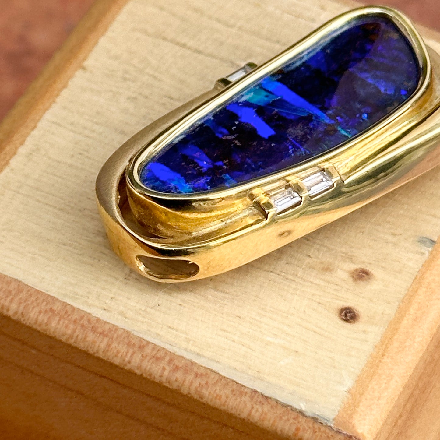 Vintage, designer, Dolberg, 18KT yellow gold intense, oblong, boulder opal with baguette diamond pendant AND pin brooch. There is a hidden bail in the back AND a pin. So many option on how to wear this beautiful piece! 18k gold features both polished and matte-finishes.