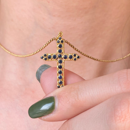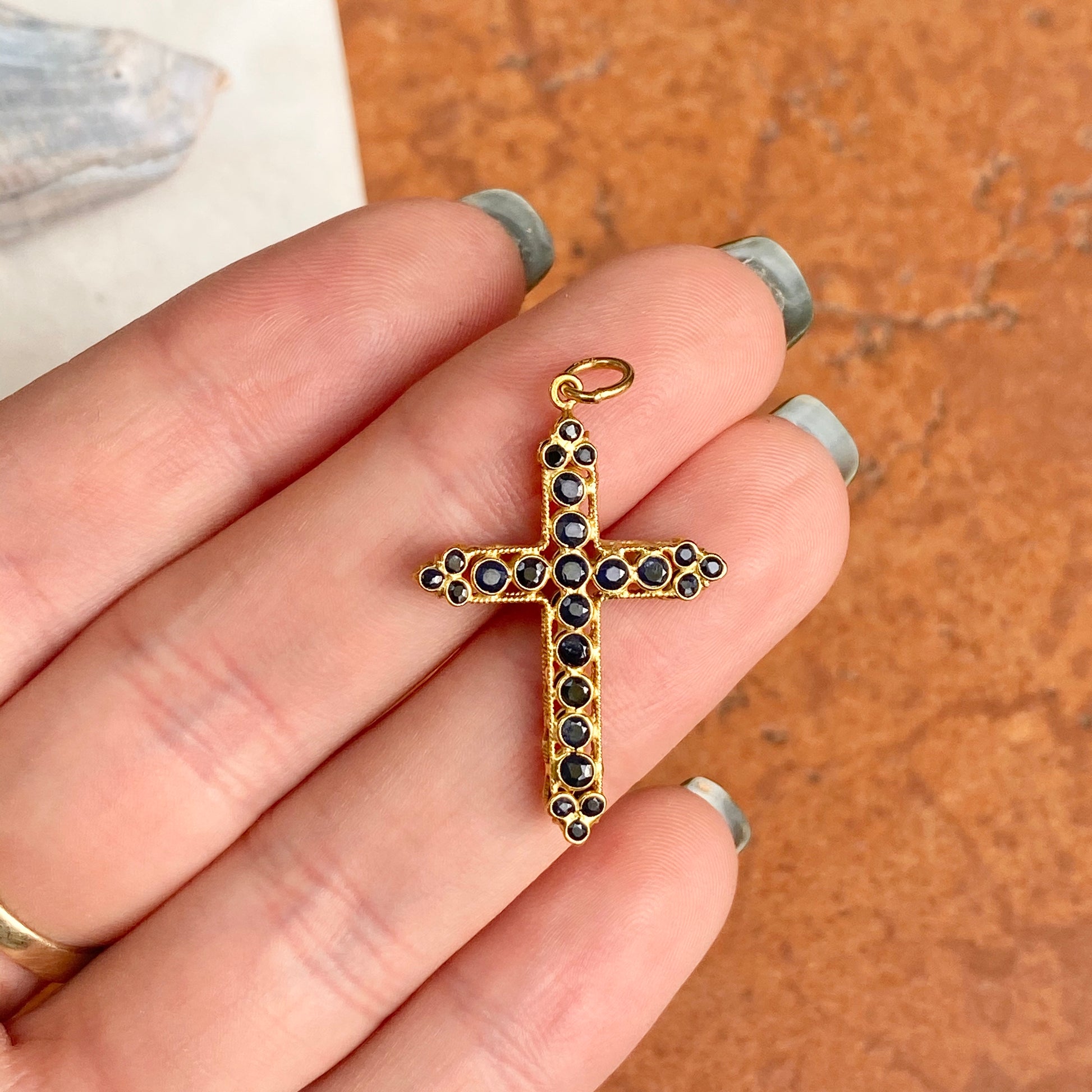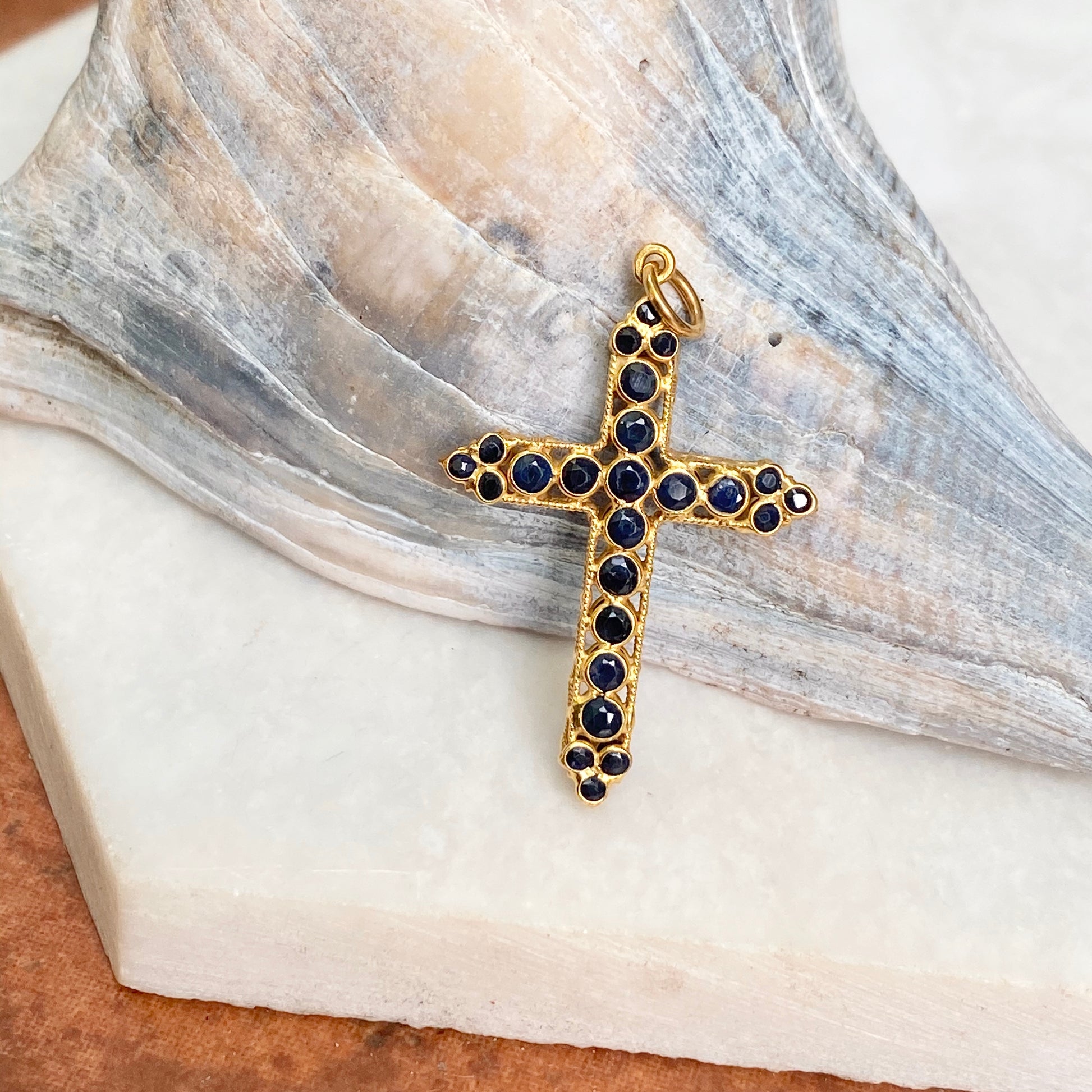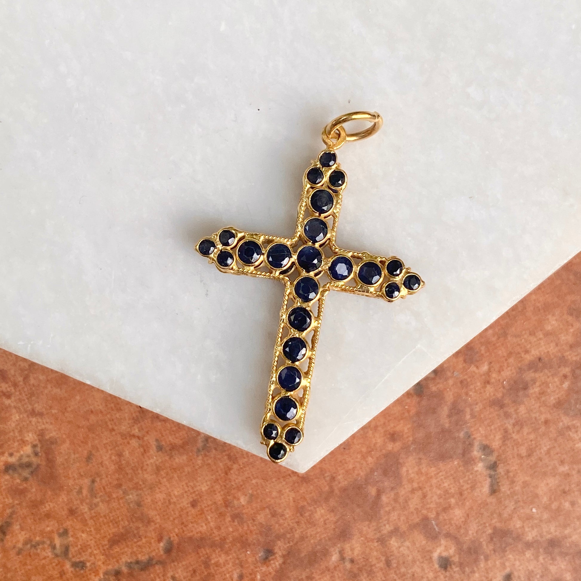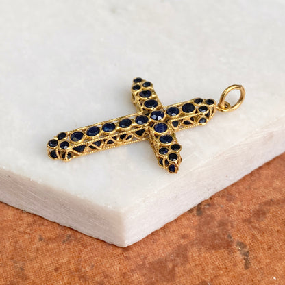 Estate 18KT Yellow Gold Open Work Blue Sapphire Cross Pendant 30mm