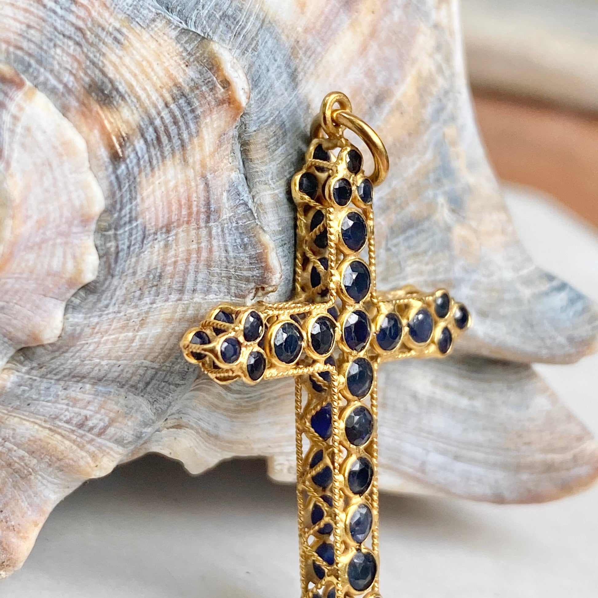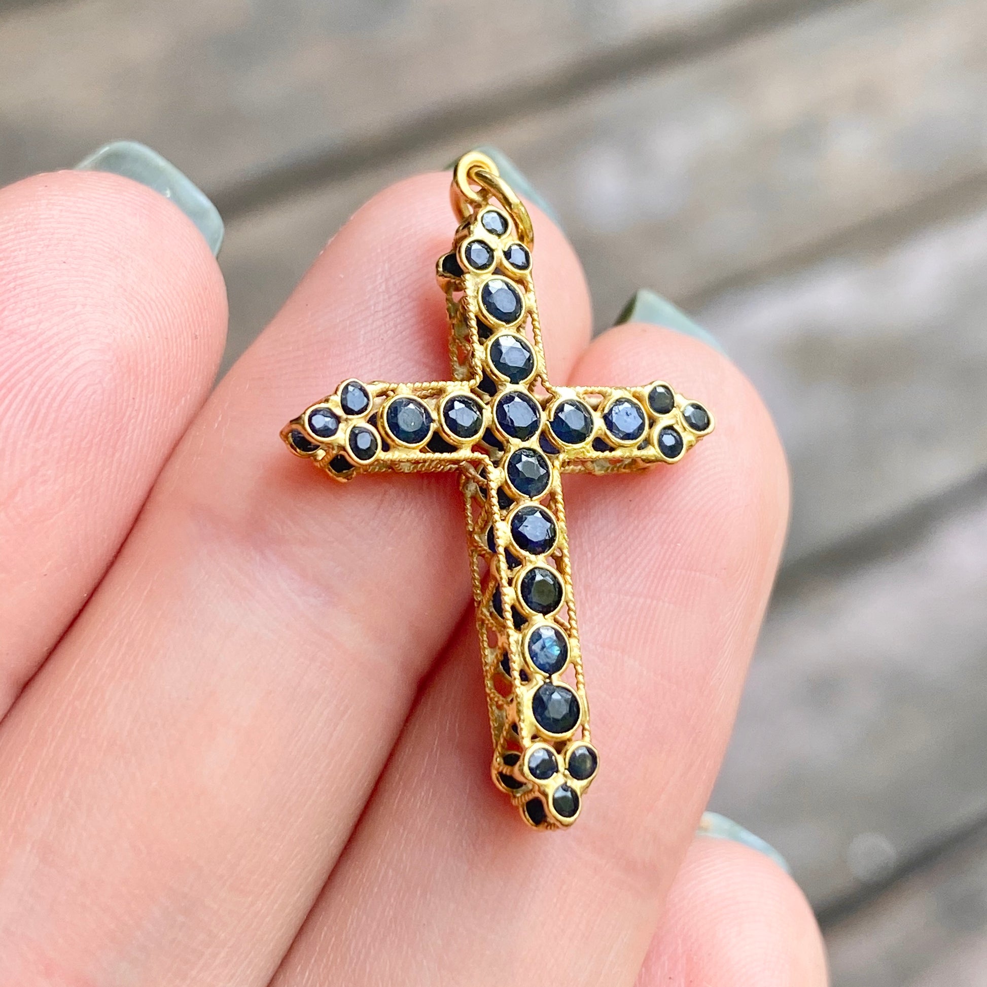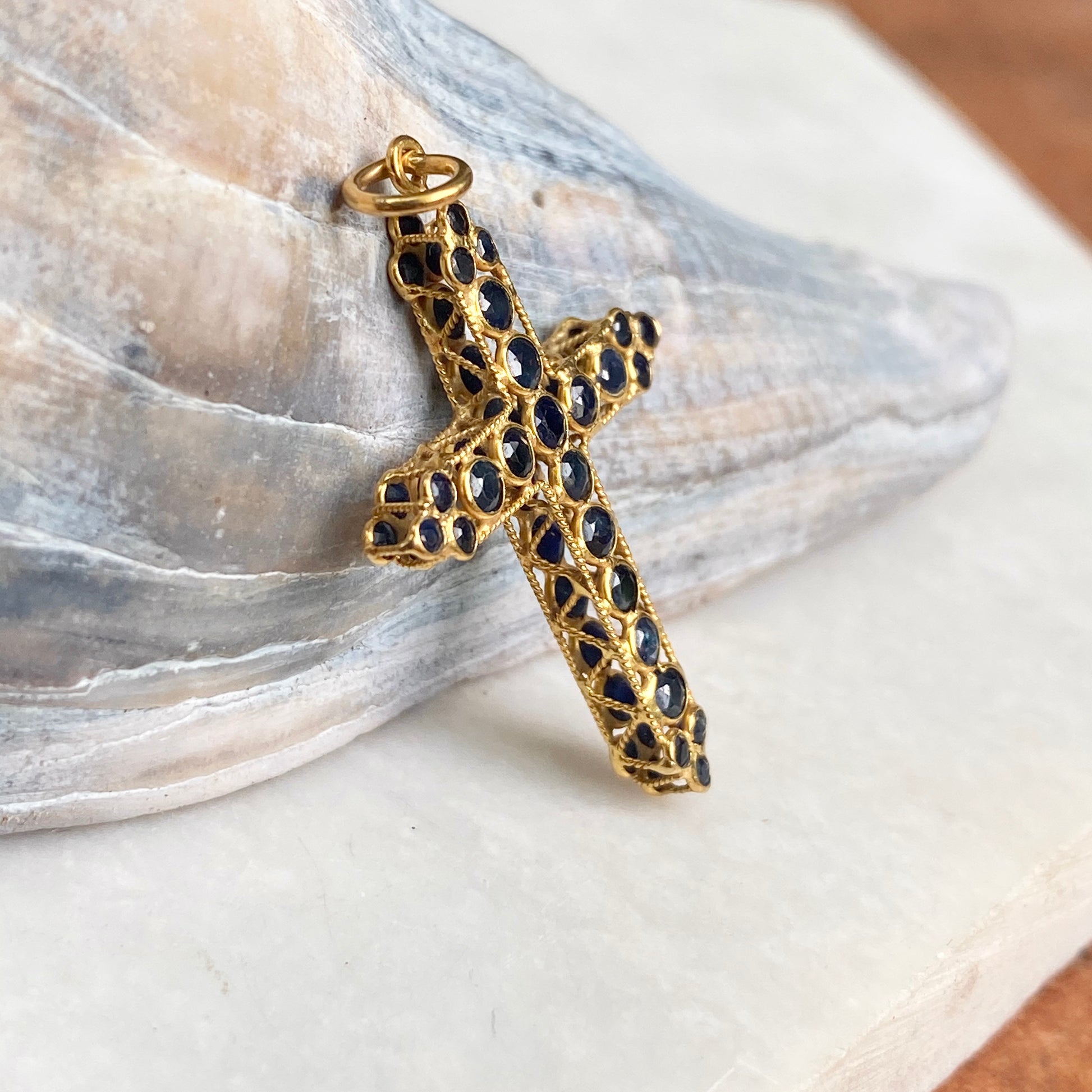 Estate/ vintage 18KT yellow gold ornate, open work cross pendant with genuine, blue sapphires. Magnificent dark blue sapphires cover both sides of the cross! Sapphires are the birthstone for September babies- and this piece makes a stunning gift!