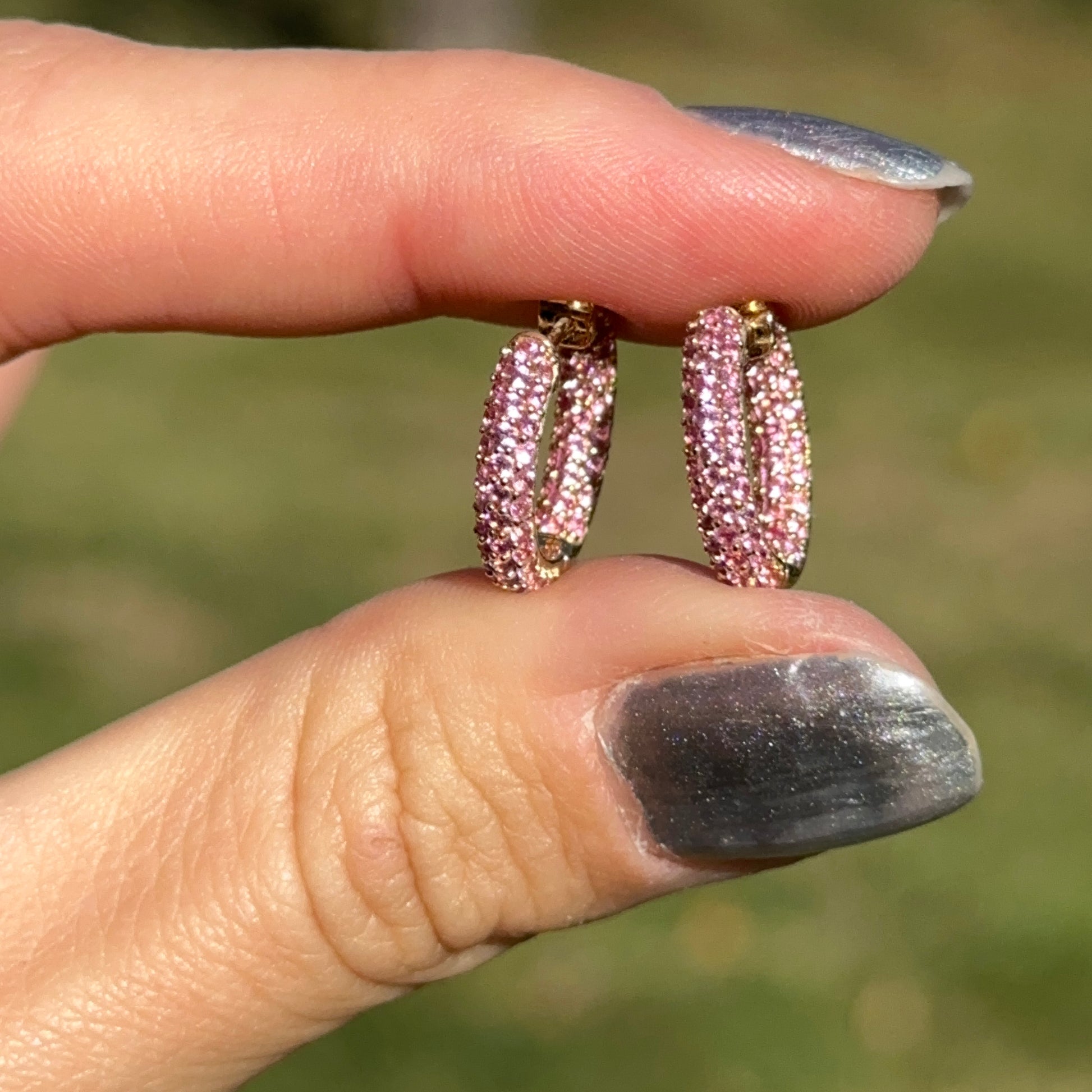 Estate/ Vintage 18K Yellow Gold Pink Sapphires Pave-Set, Huggie Hoop Earrings. Lovely, round-shape pink sapphires on inside and outside of the hoop.