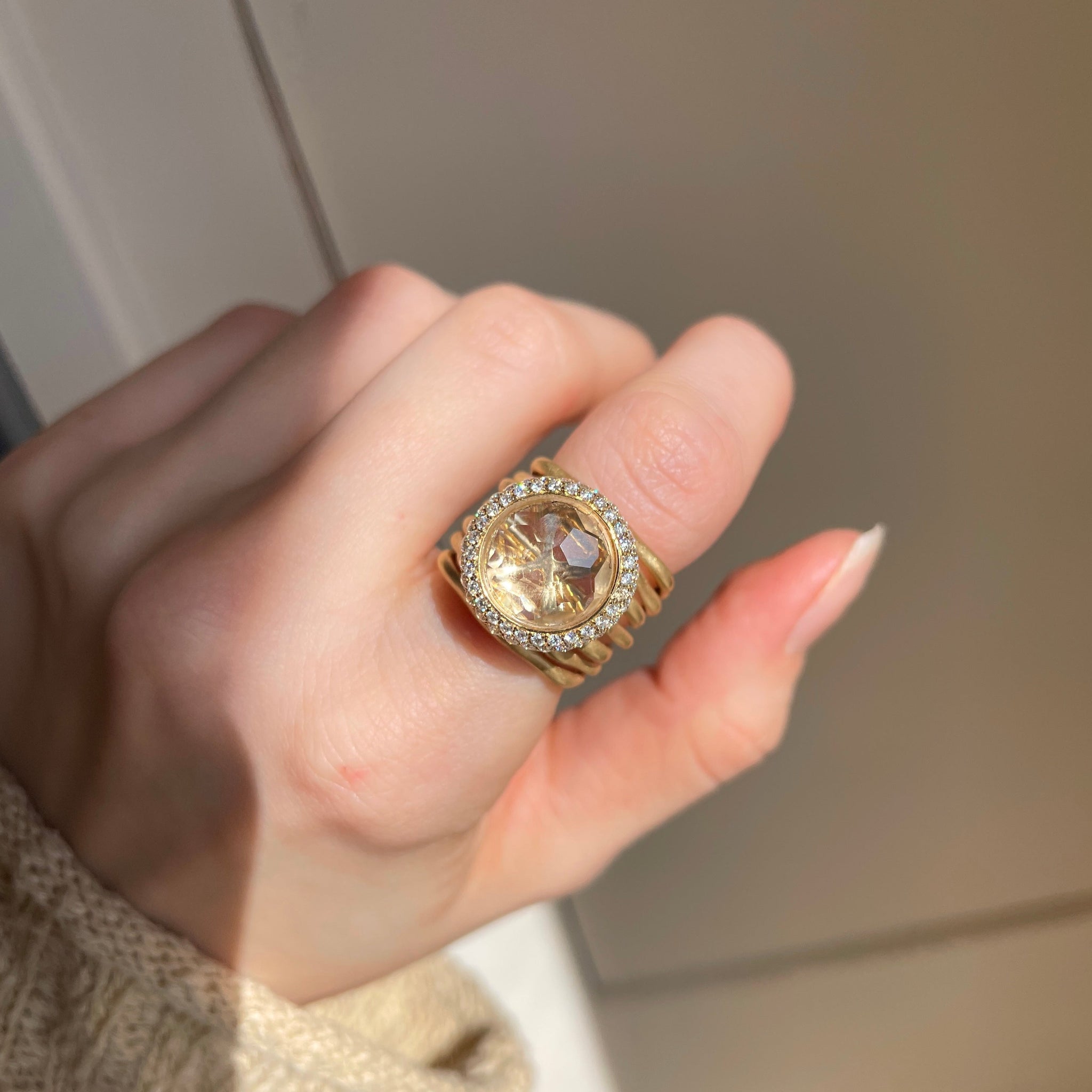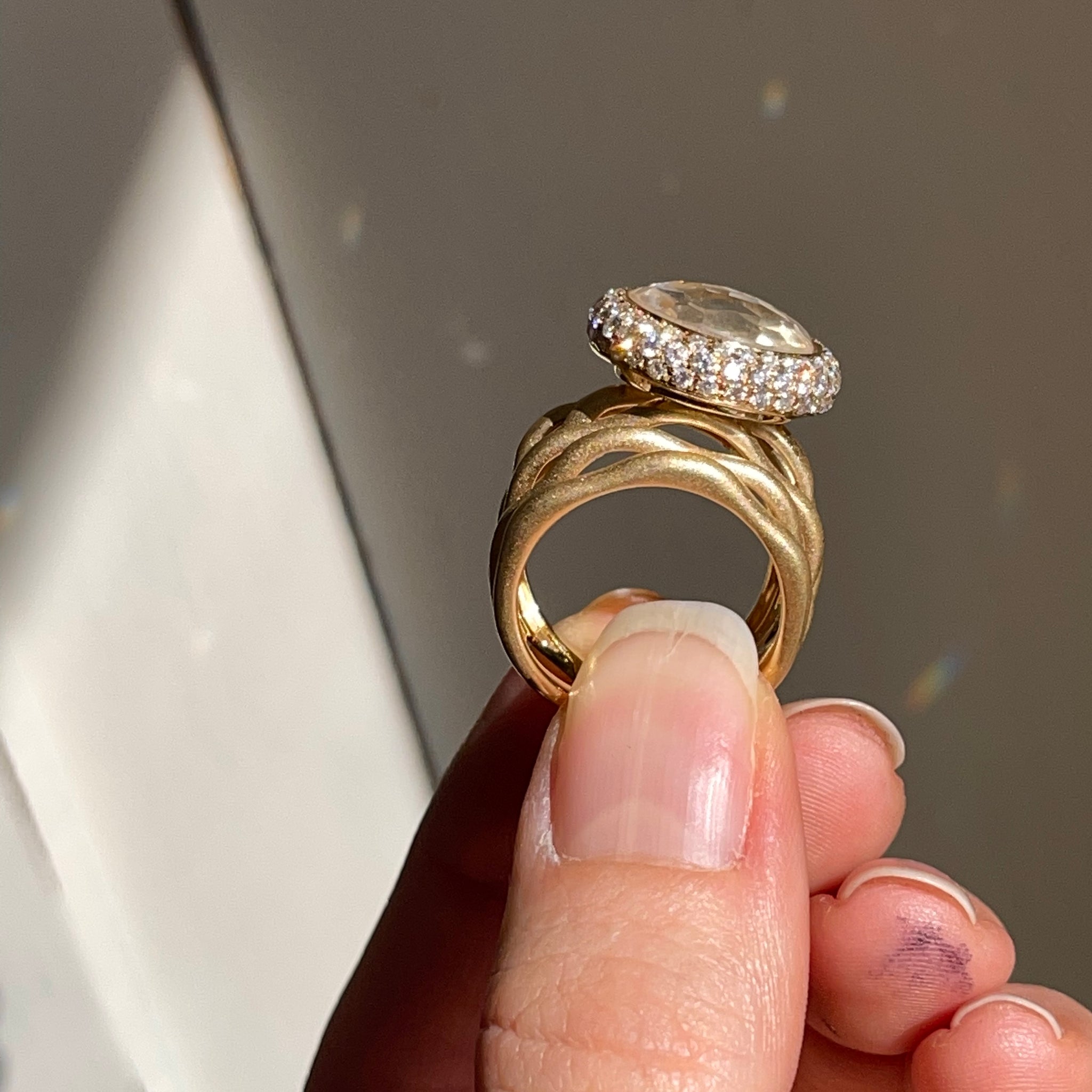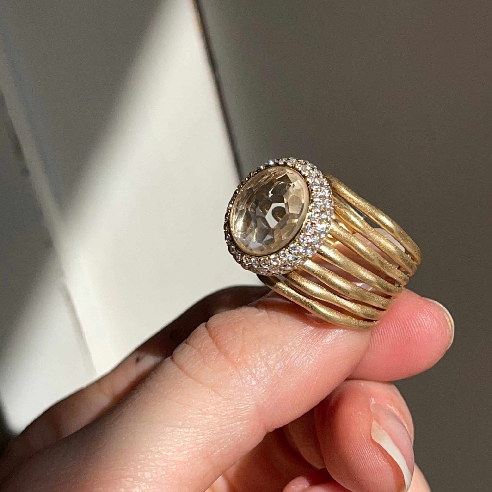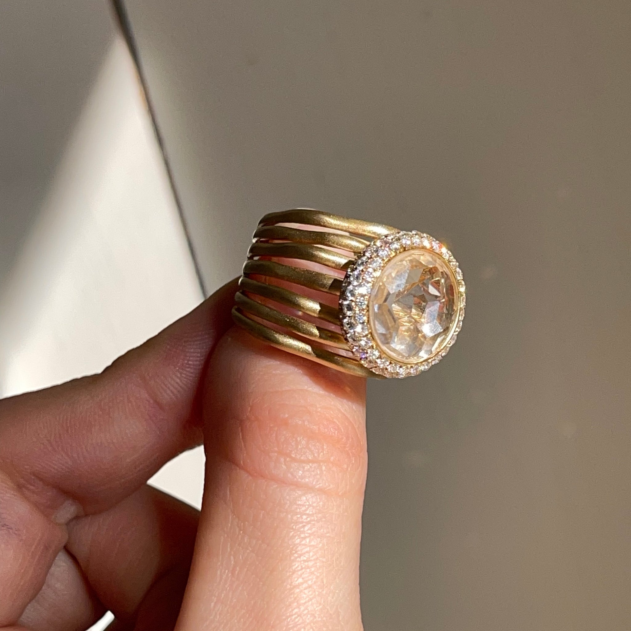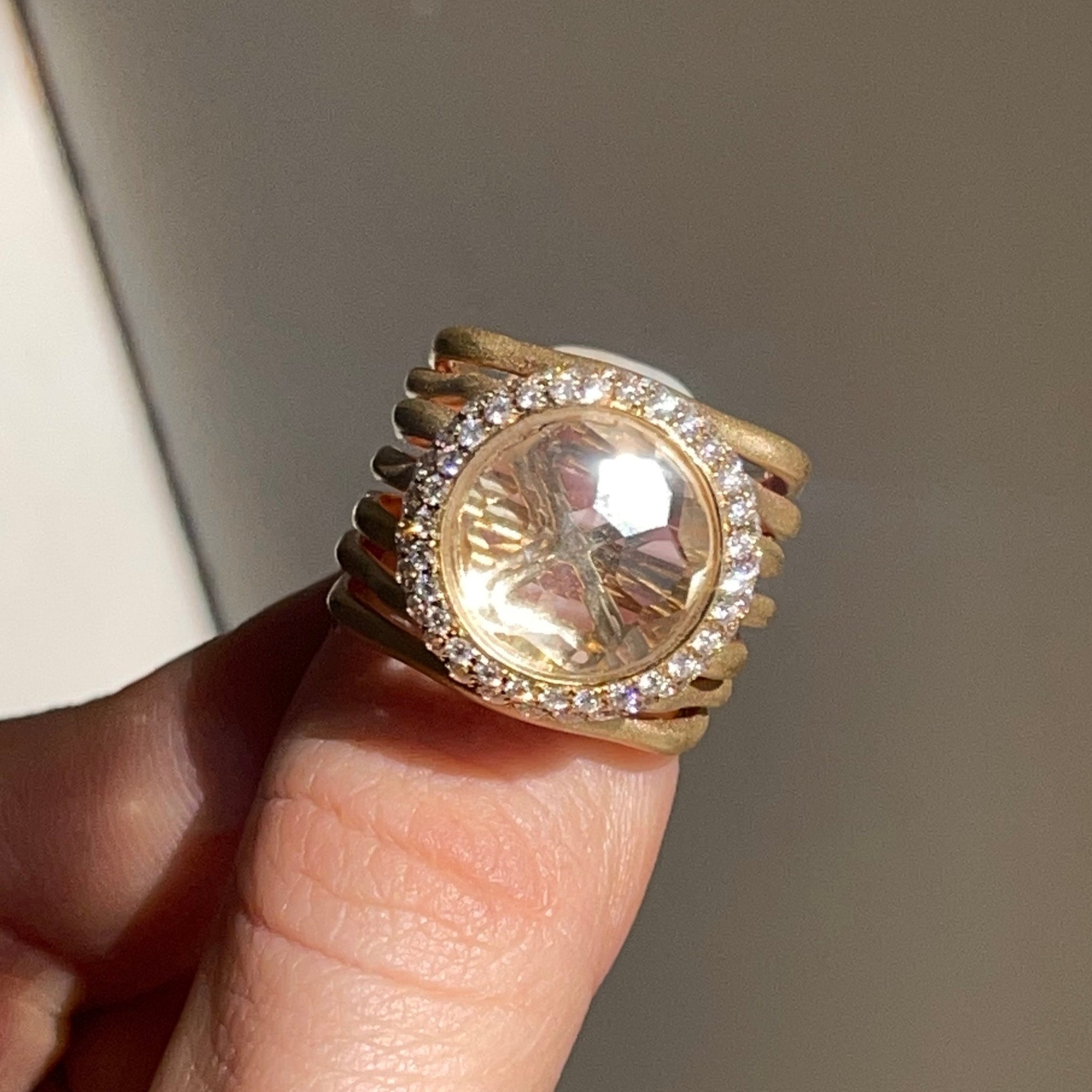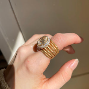 Estate/ vintage 18KT yellow gold cigar band ring with genuine, round-cut, gem quality morganite with halo pave diamonds. Satin, matte finish, multi-band- like branches. Would make a FANTASTIC emerald engagement ring or just an added ring to your collection!