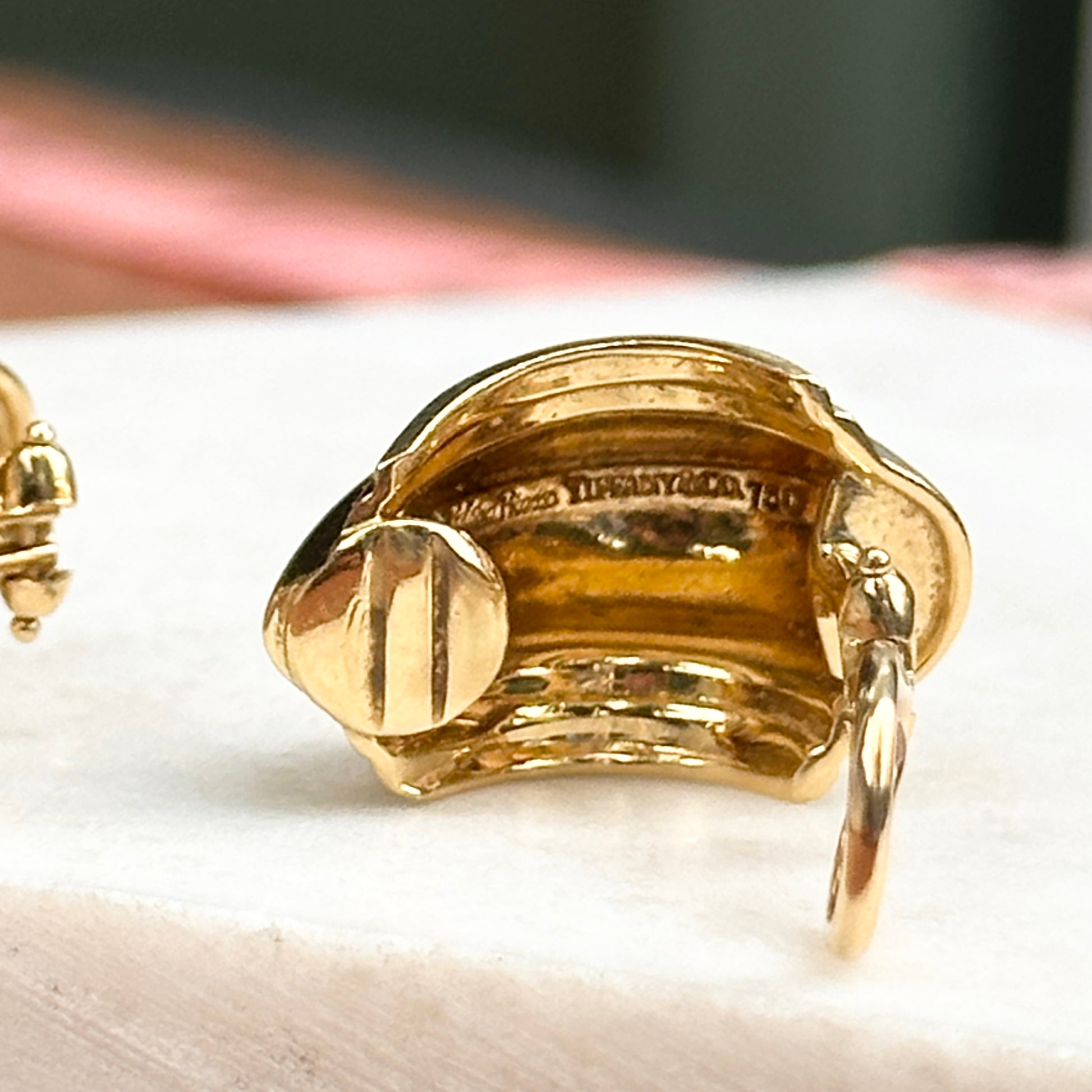 Vintage 18K yellow gold Tiffany and Co. ridged half-hoop non-pierced earrings.